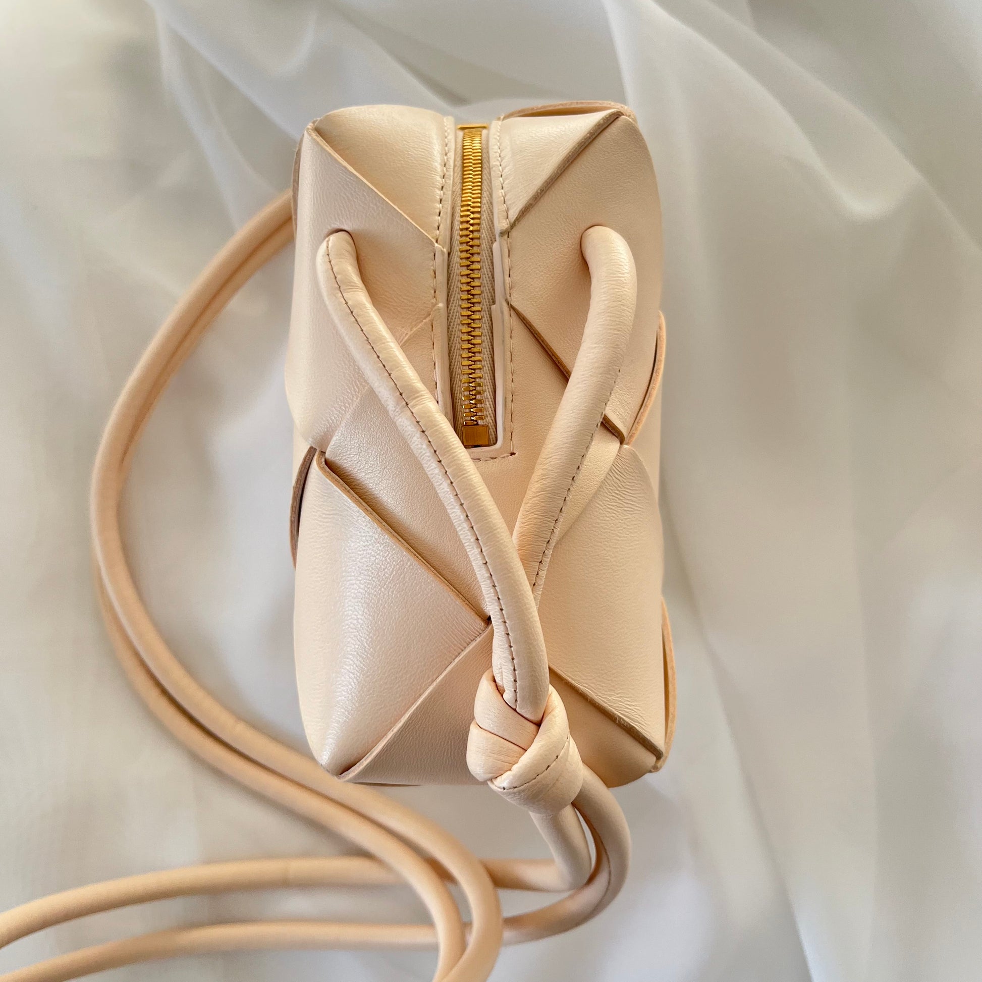 description: Ecru lambskin, 2-way zipper along side and top, sits nicely on shoulder, dust bag included, gold hardware, one main pocket, dust bag included, interior star stamp from the friends/family selection