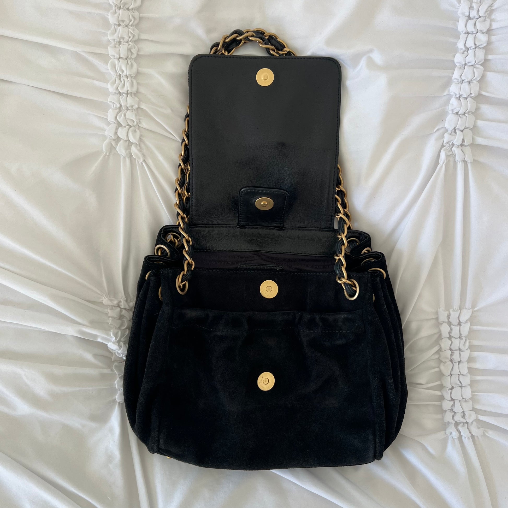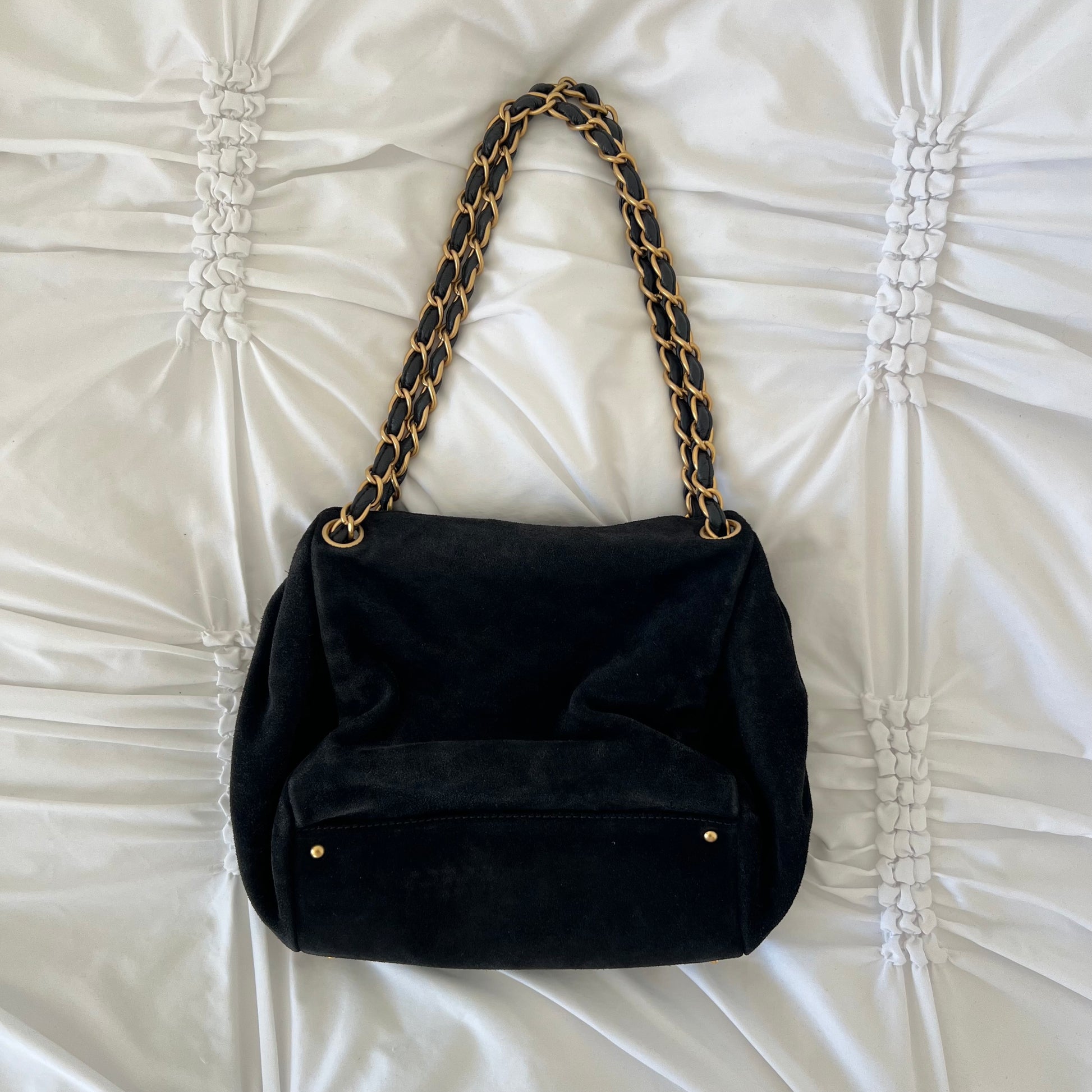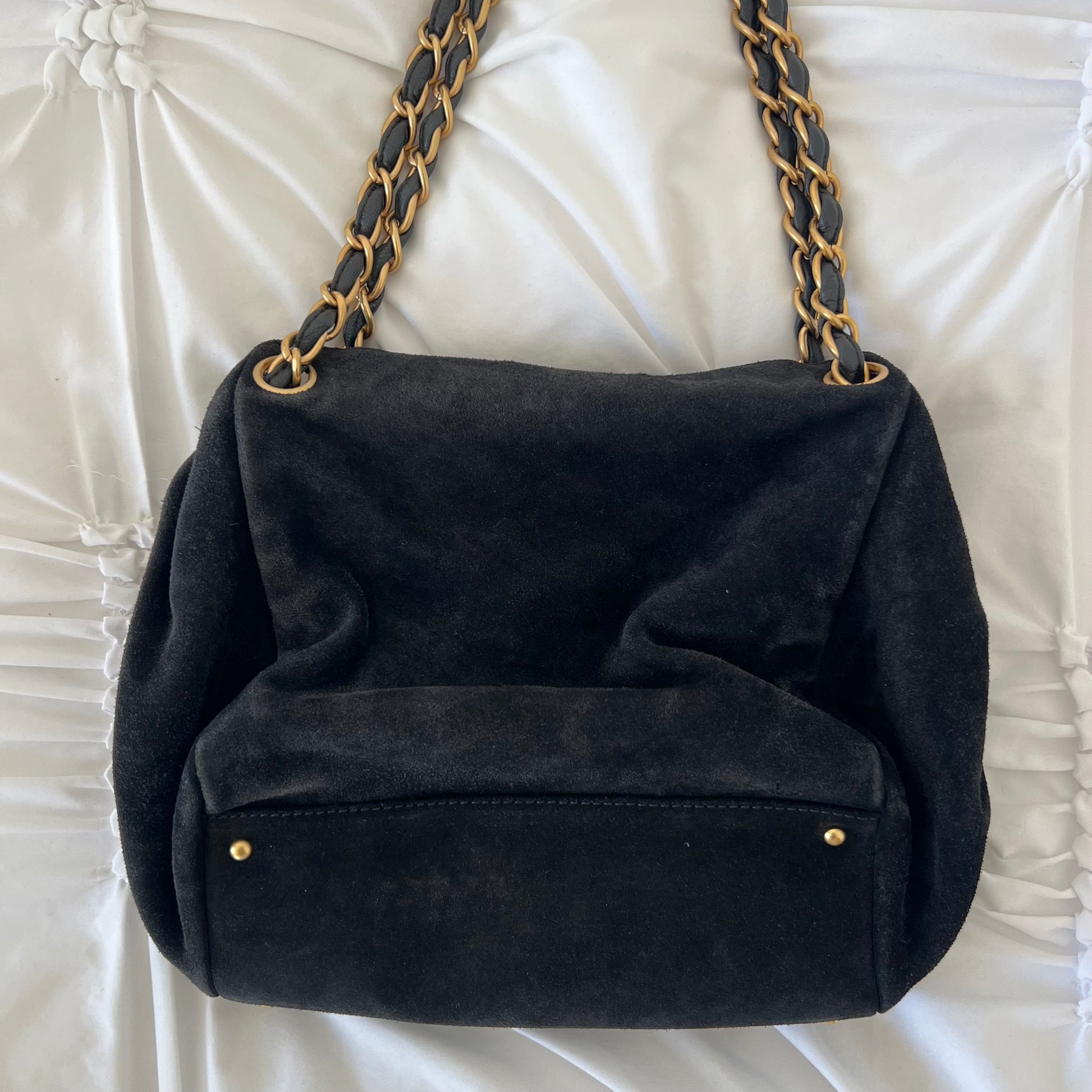 description: black suede material, Gold hardware, sits nicely on shoulder, very spacious, one main flap pocket, additional pocket, normal preloved wear on suede