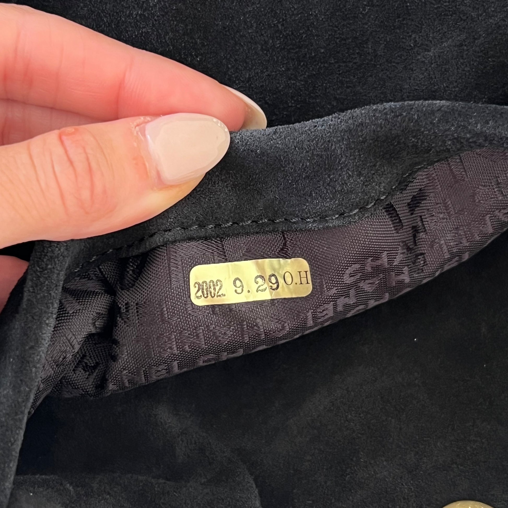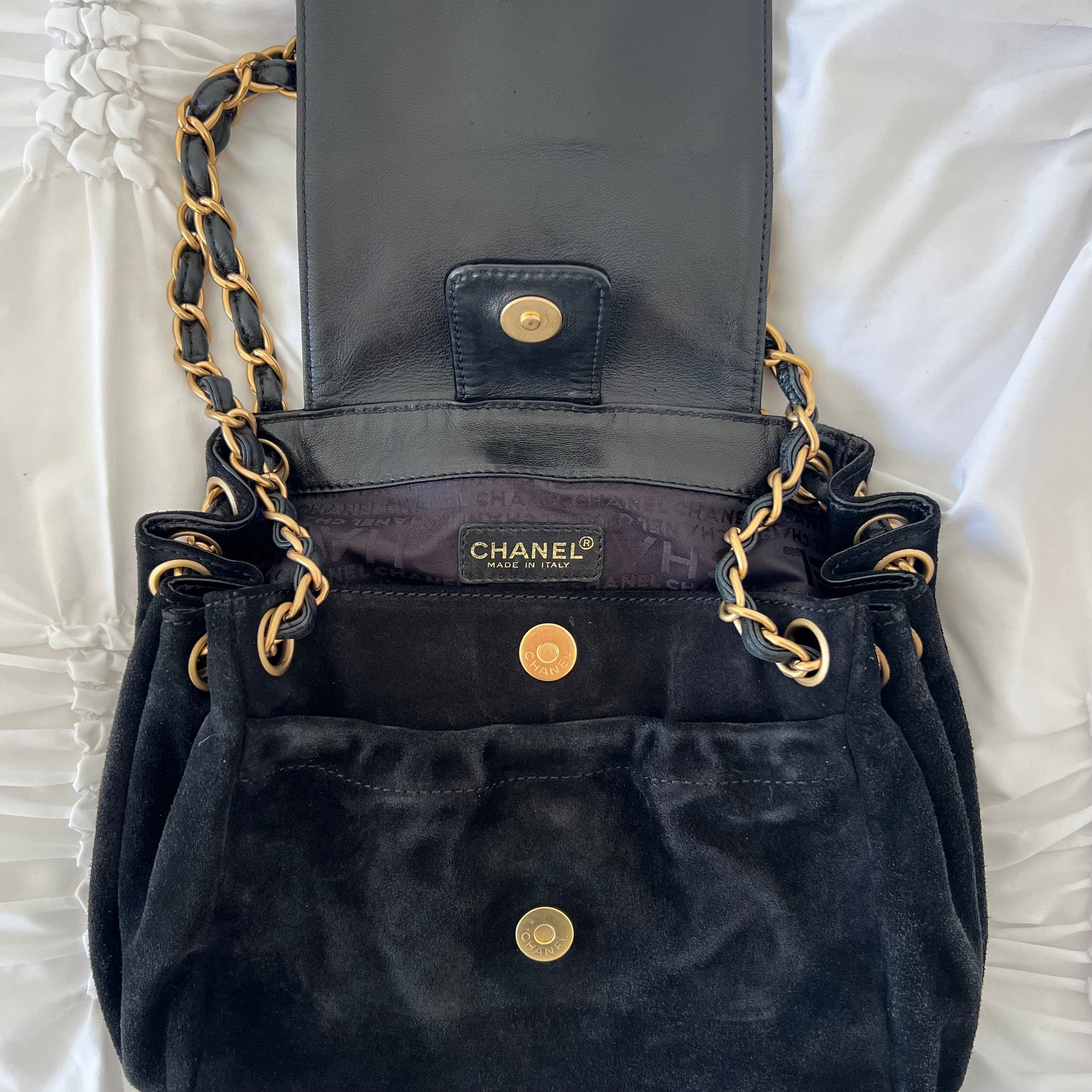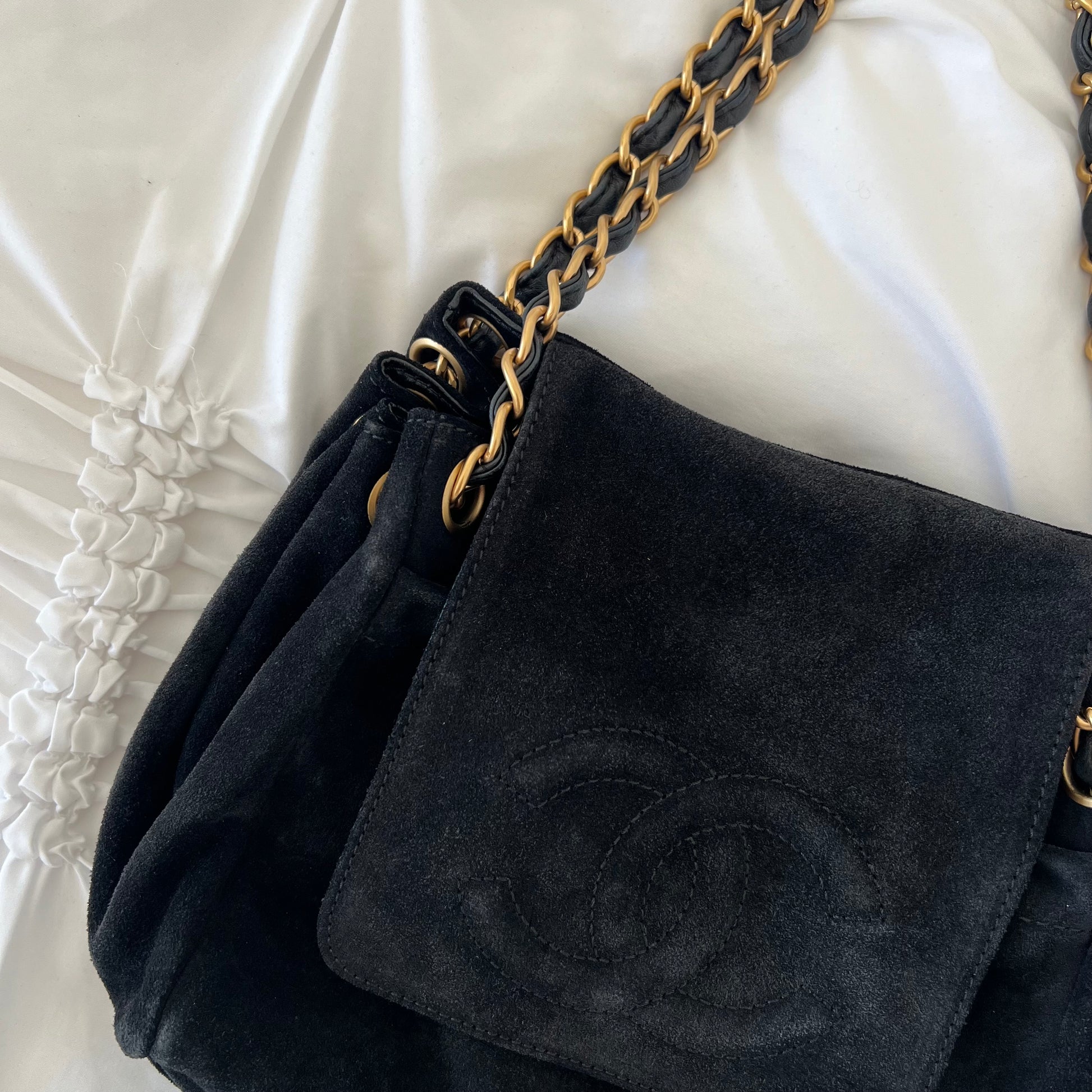 description: black suede material, Gold hardware, sits nicely on shoulder, very spacious, one main flap pocket, additional pocket, normal preloved wear on suede