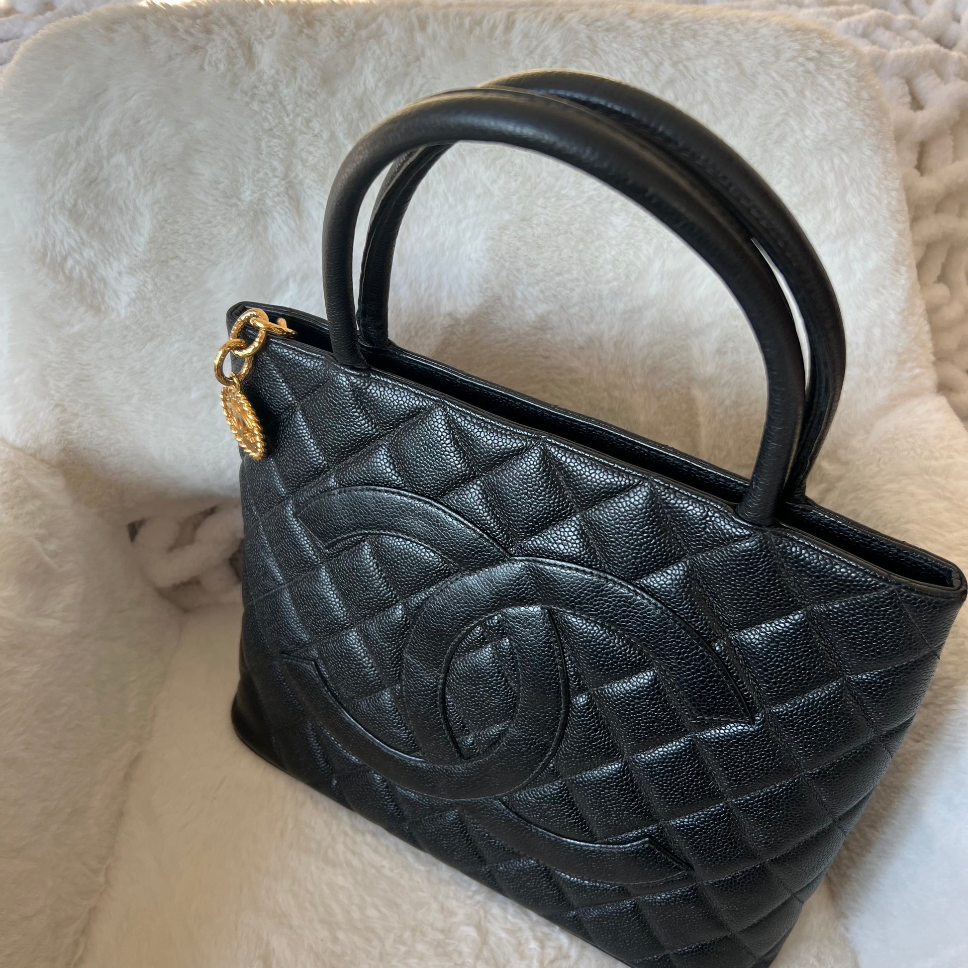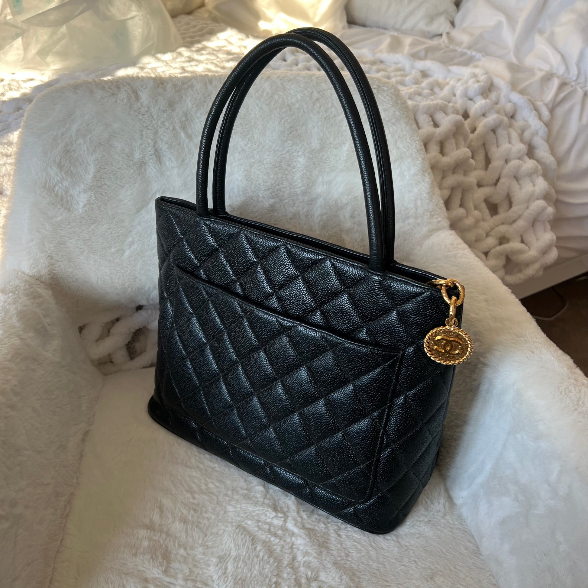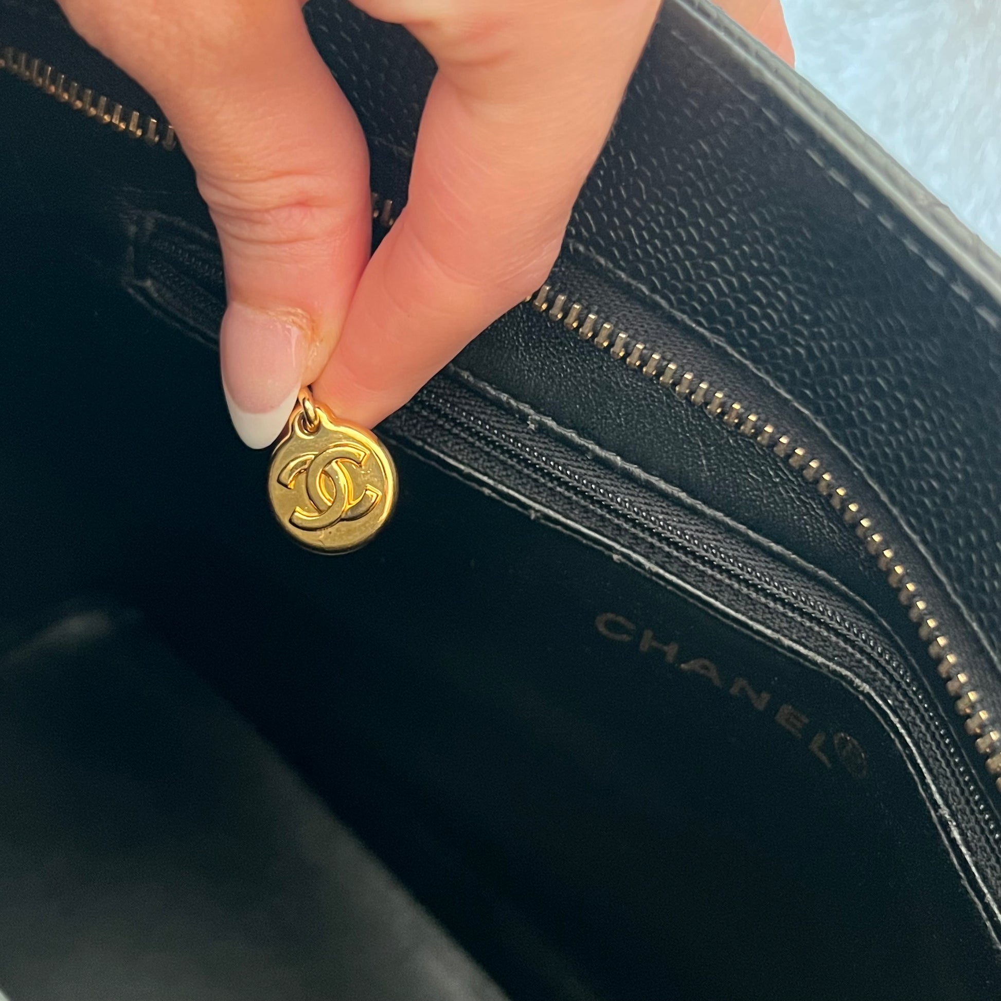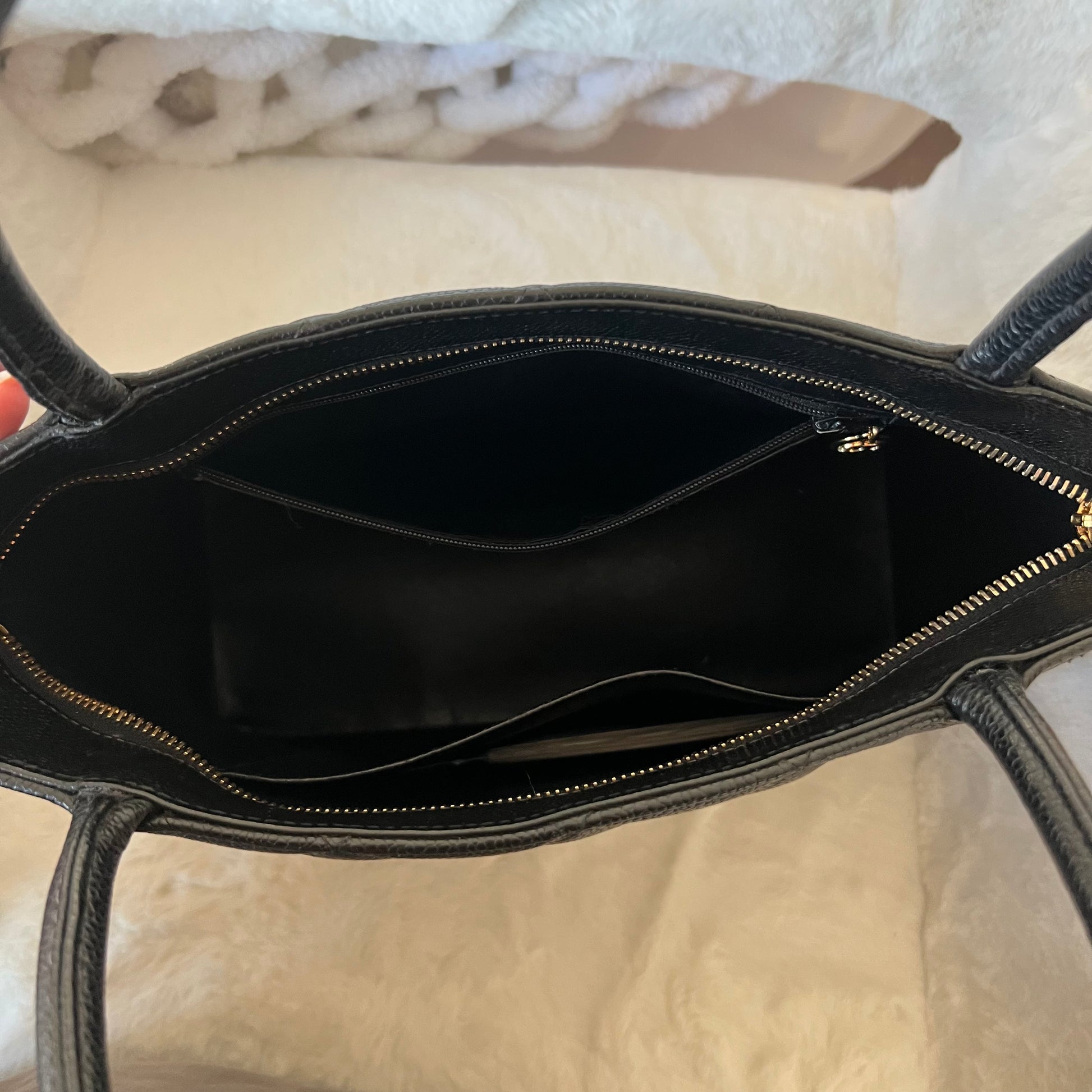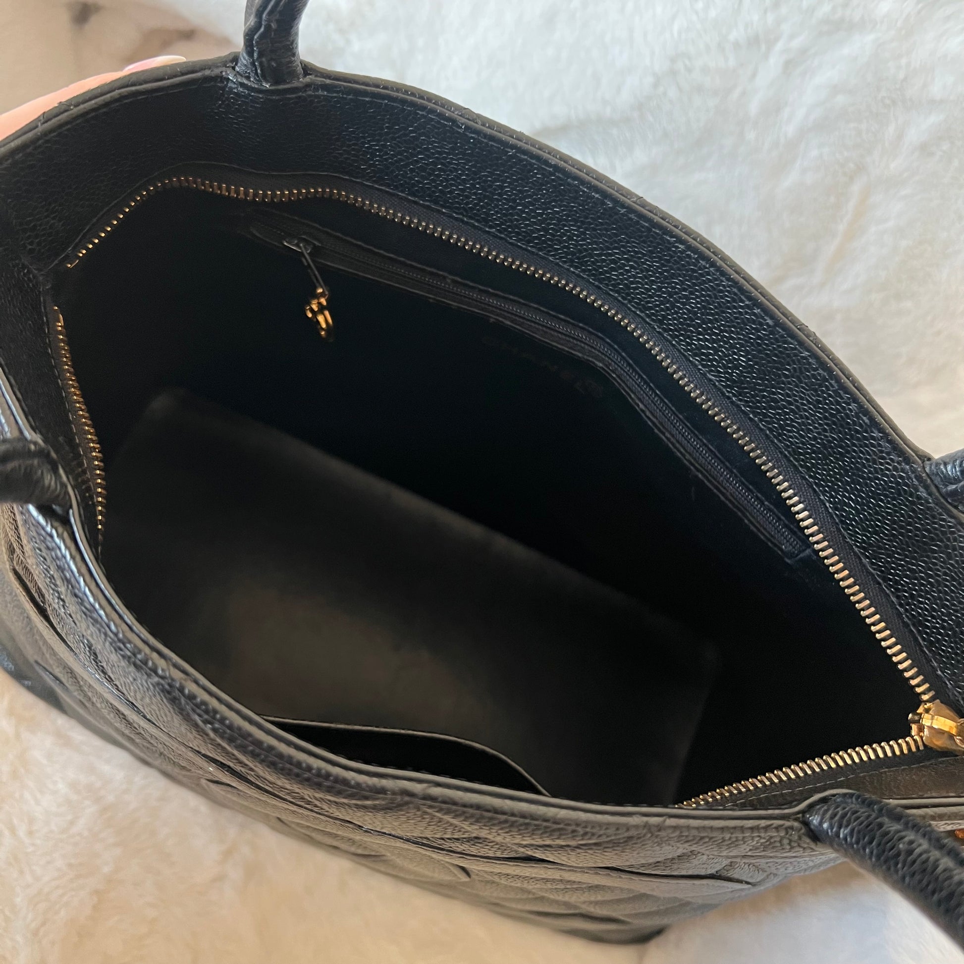 Description: diamond-quilted black caviar leather, one main zipper pocket, 1 interior zipper pocket, rear patch pocket, rolled leather top handles, sits nicely on the shoulder, structured bag style, gold hardware, made in the year 2000s