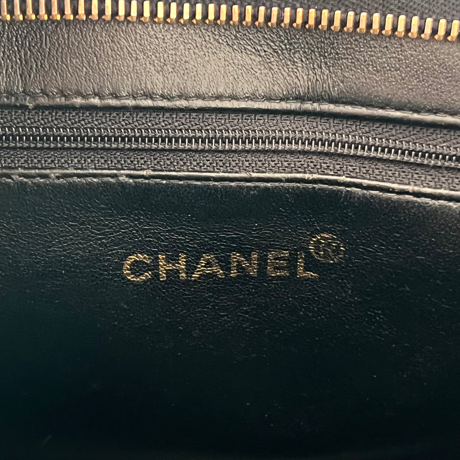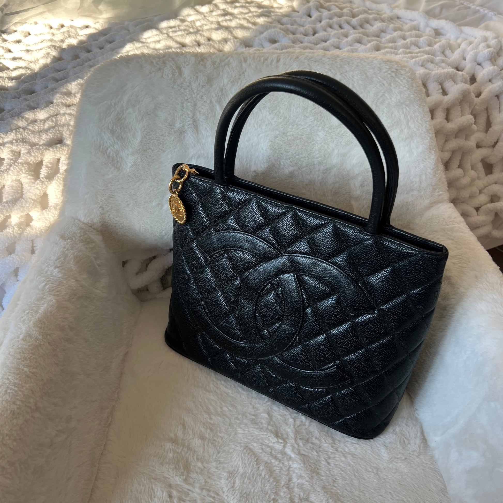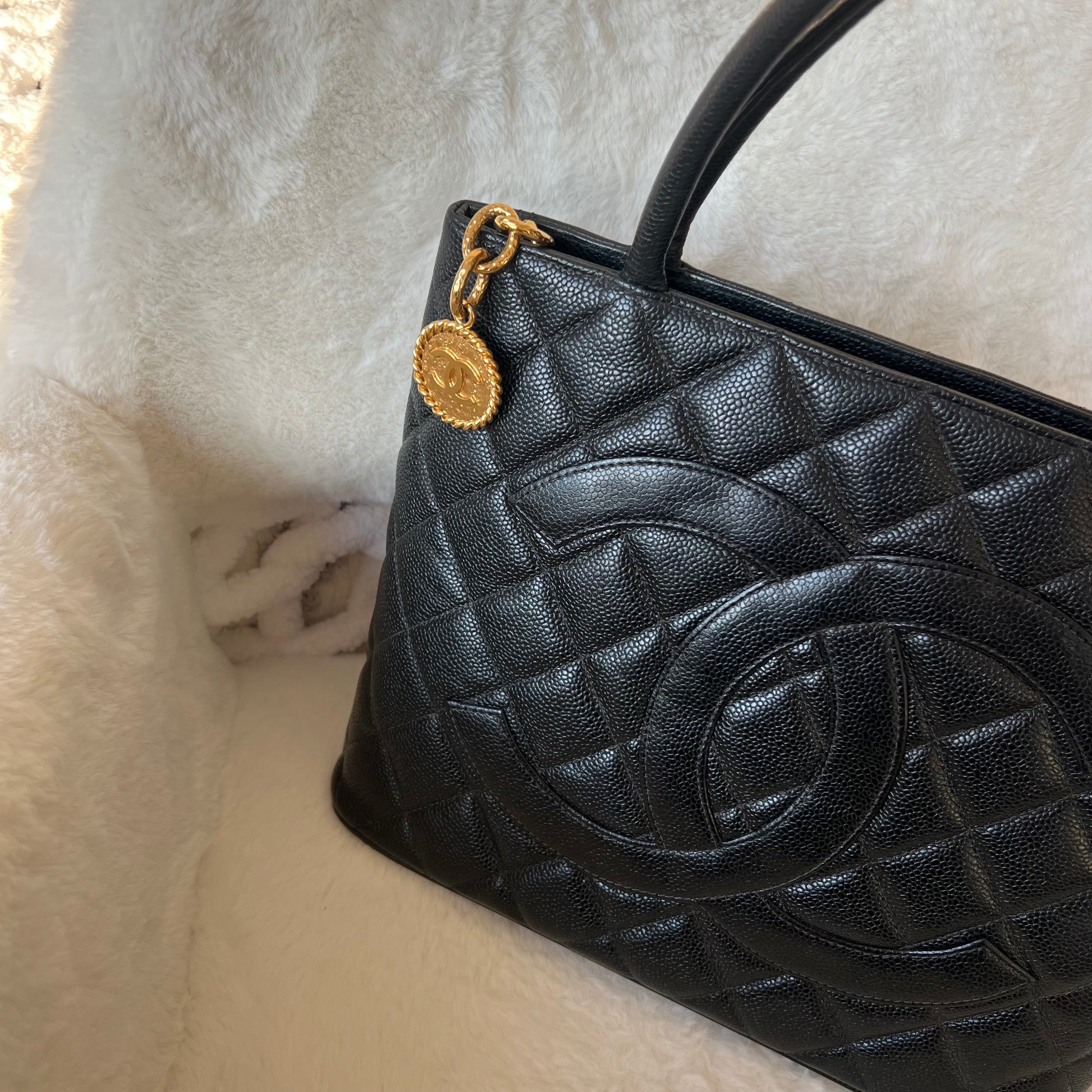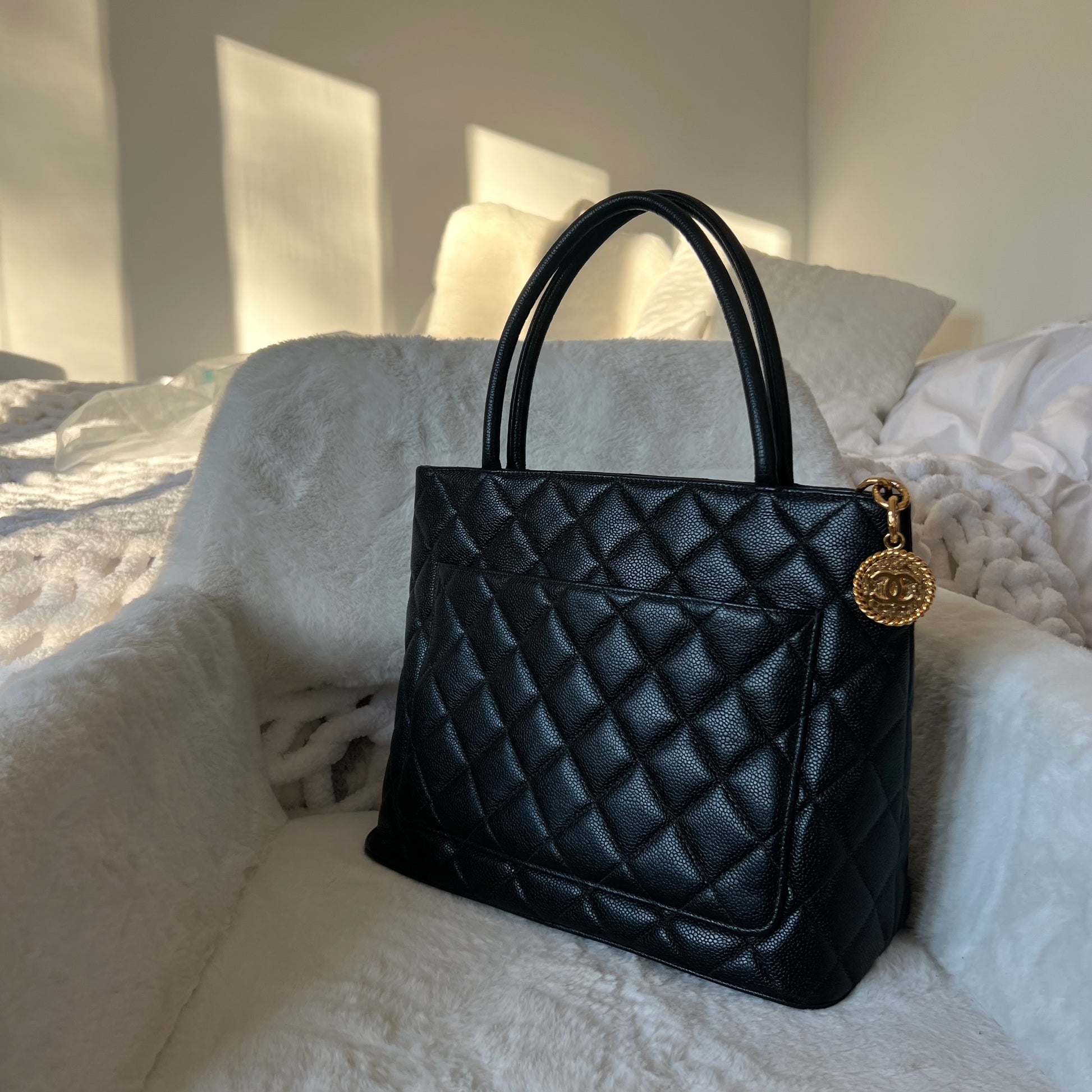 Description: diamond-quilted black caviar leather, one main zipper pocket, 1 interior zipper pocket, rear patch pocket, rolled leather top handles, sits nicely on the shoulder, structured bag style, gold hardware, made in the year 2000s