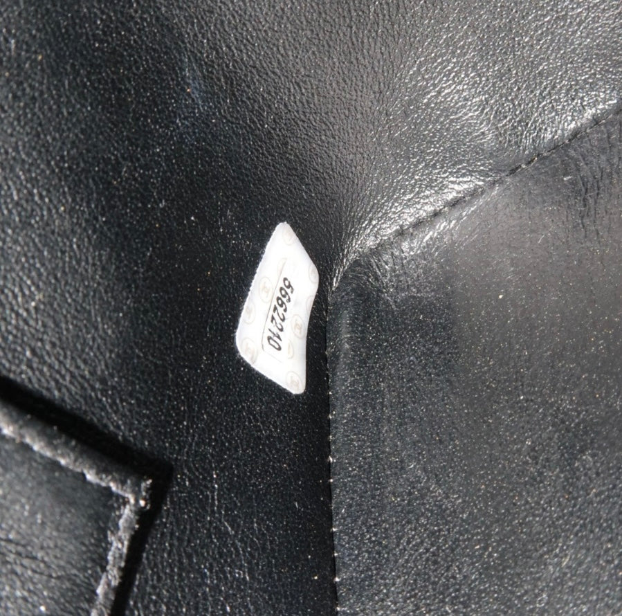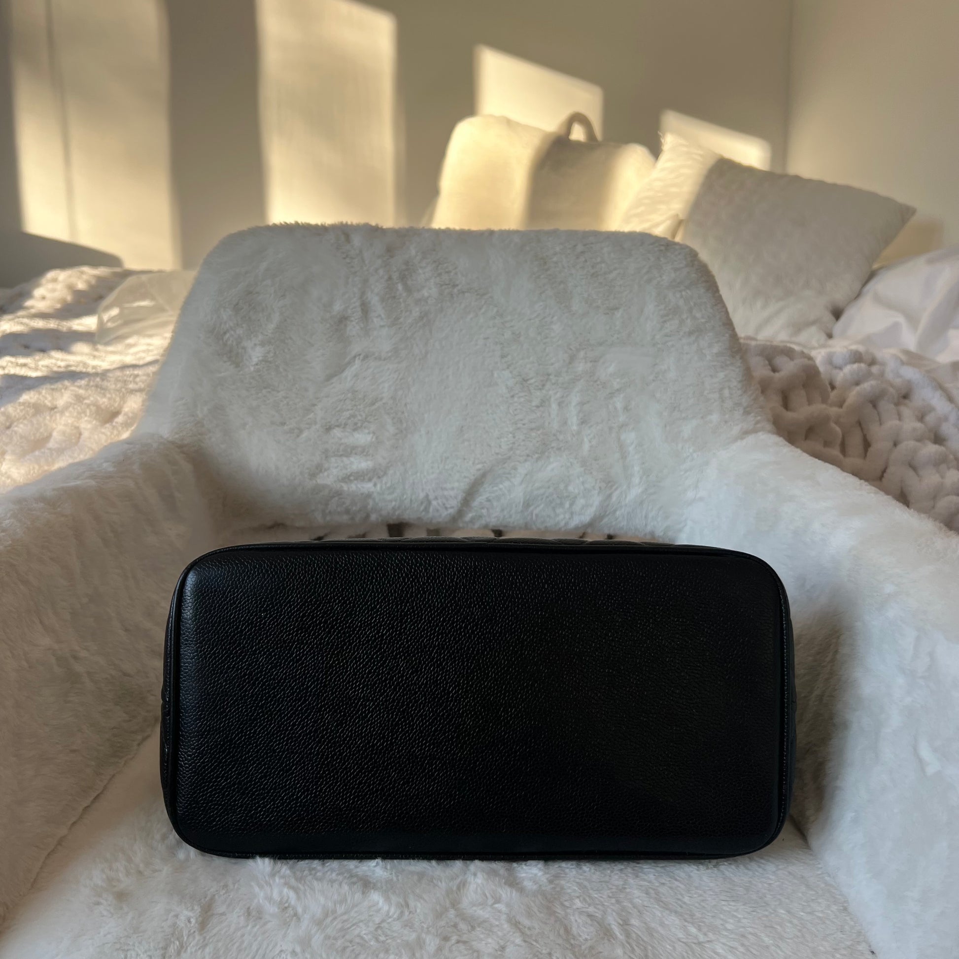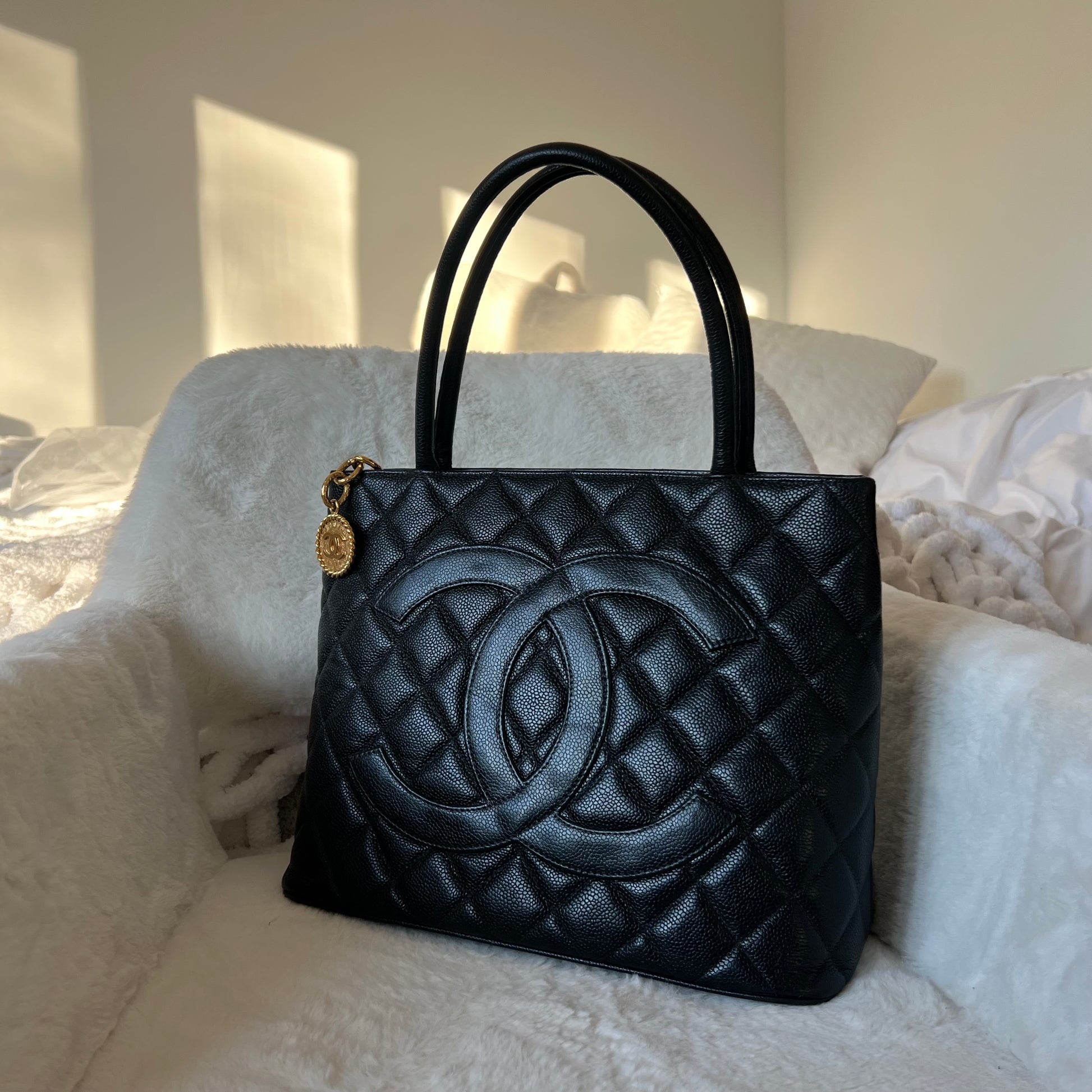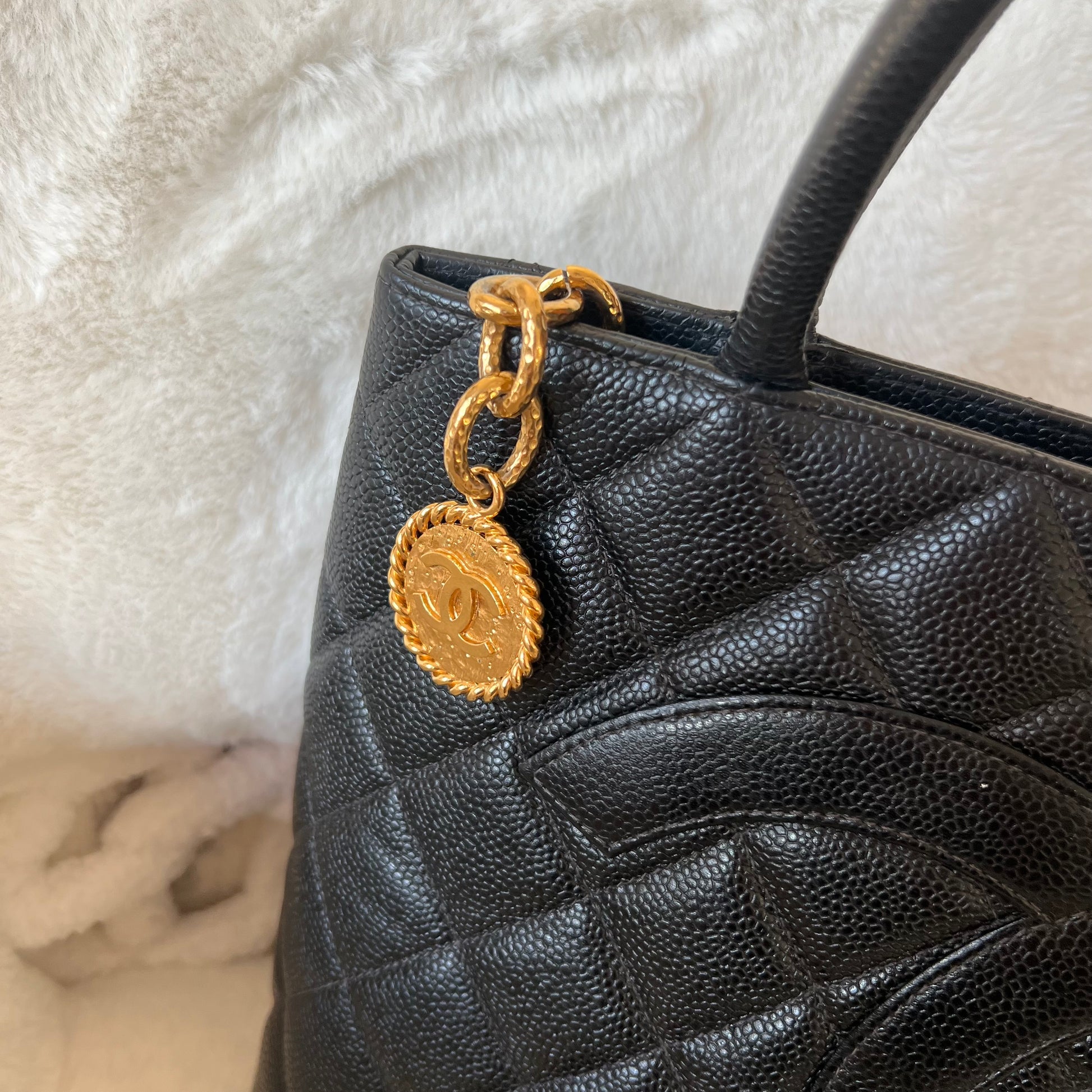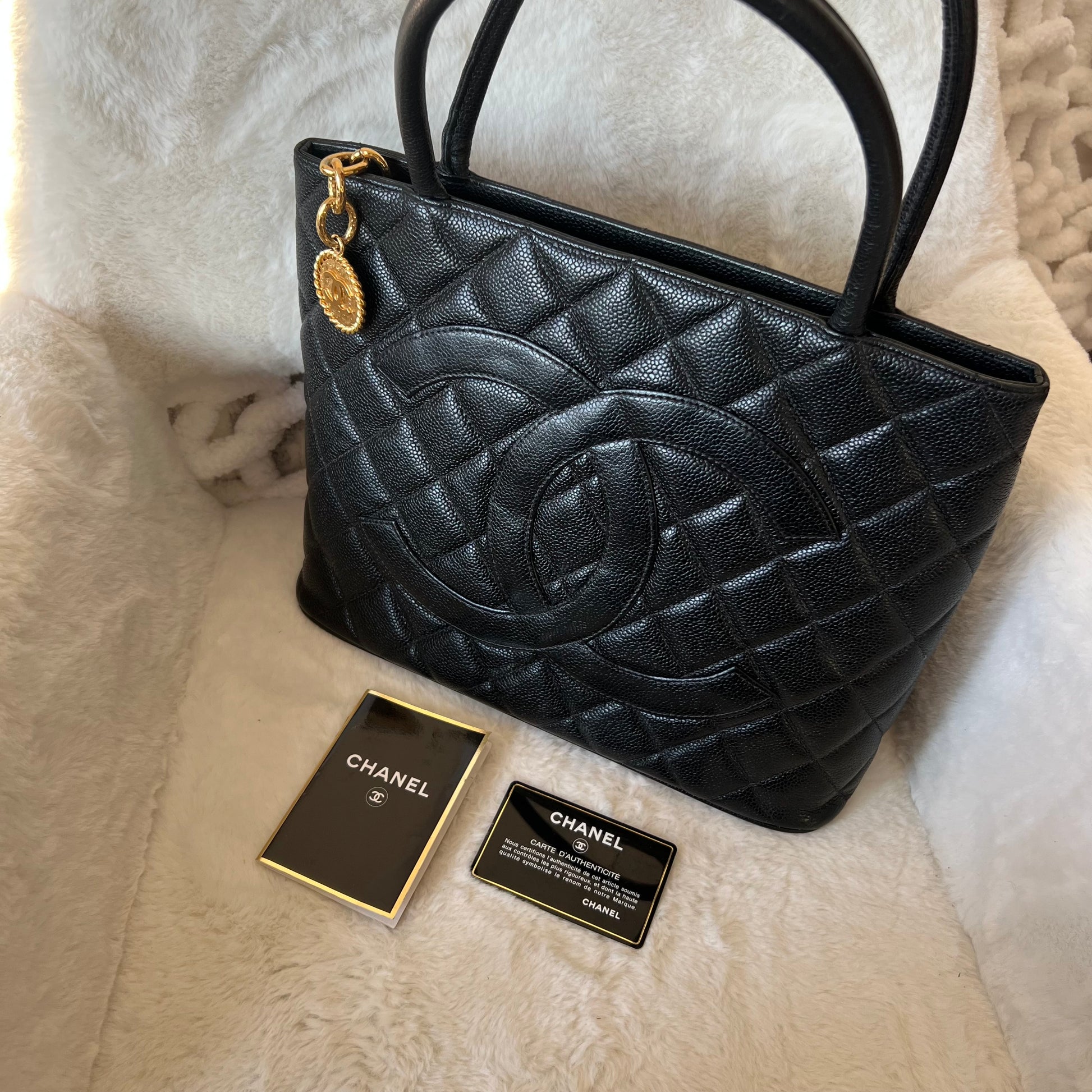 Description: diamond-quilted black caviar leather, one main zipper pocket, 1 interior zipper pocket, rear patch pocket, rolled leather top handles, sits nicely on the shoulder, structured bag style, gold hardware, made in the year 2000s