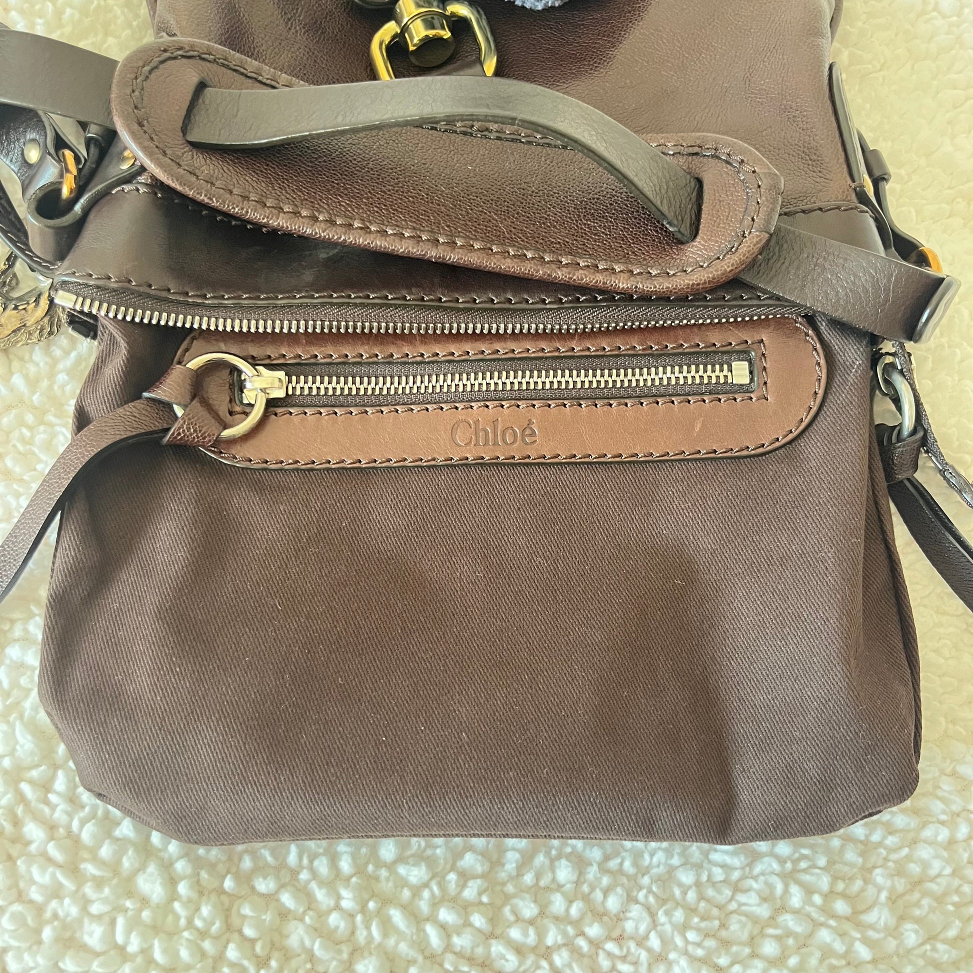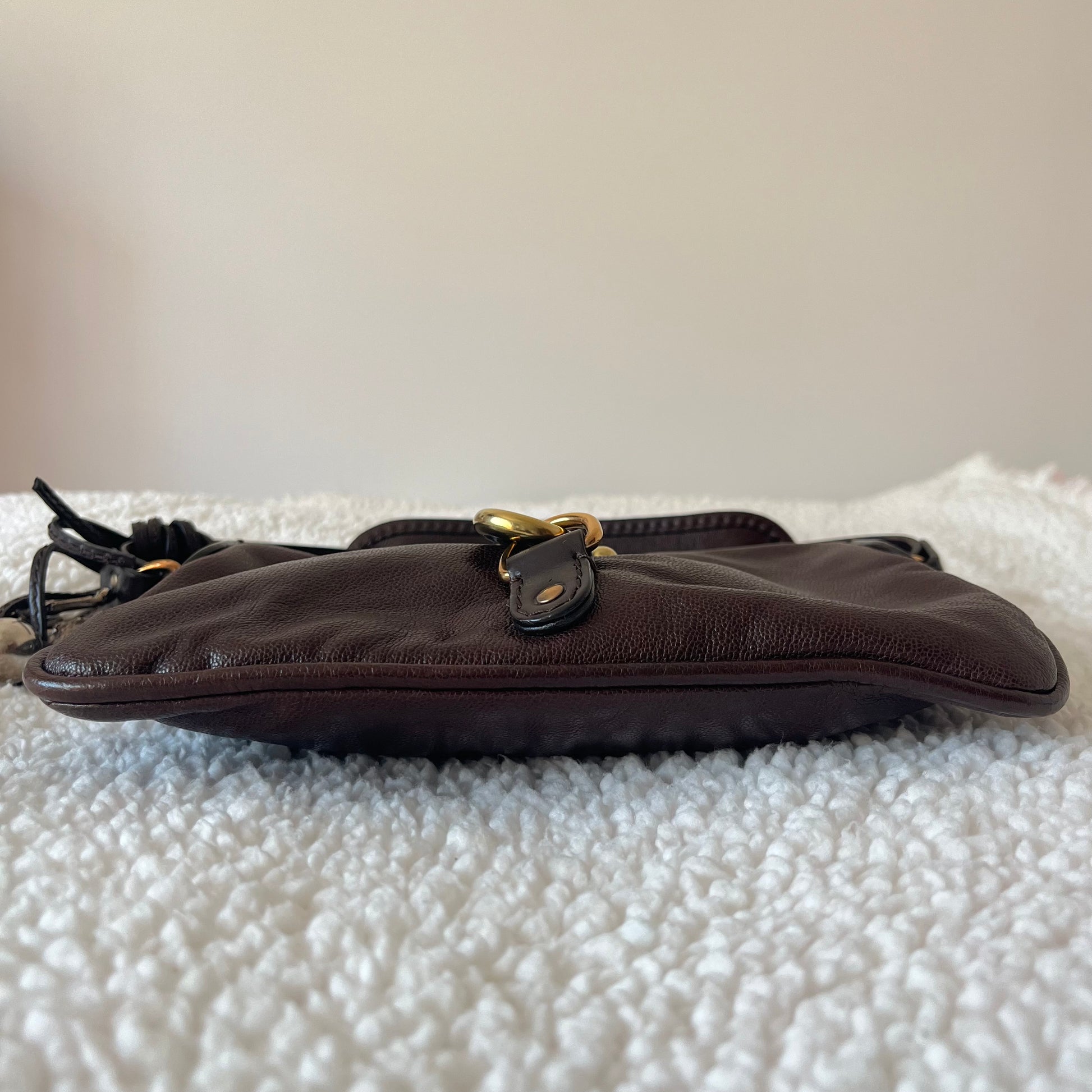 description: dark brown leather, Horseshoe Charm, mixed metal hardware, canvas lining, single interior pocket, one main zipper pocket