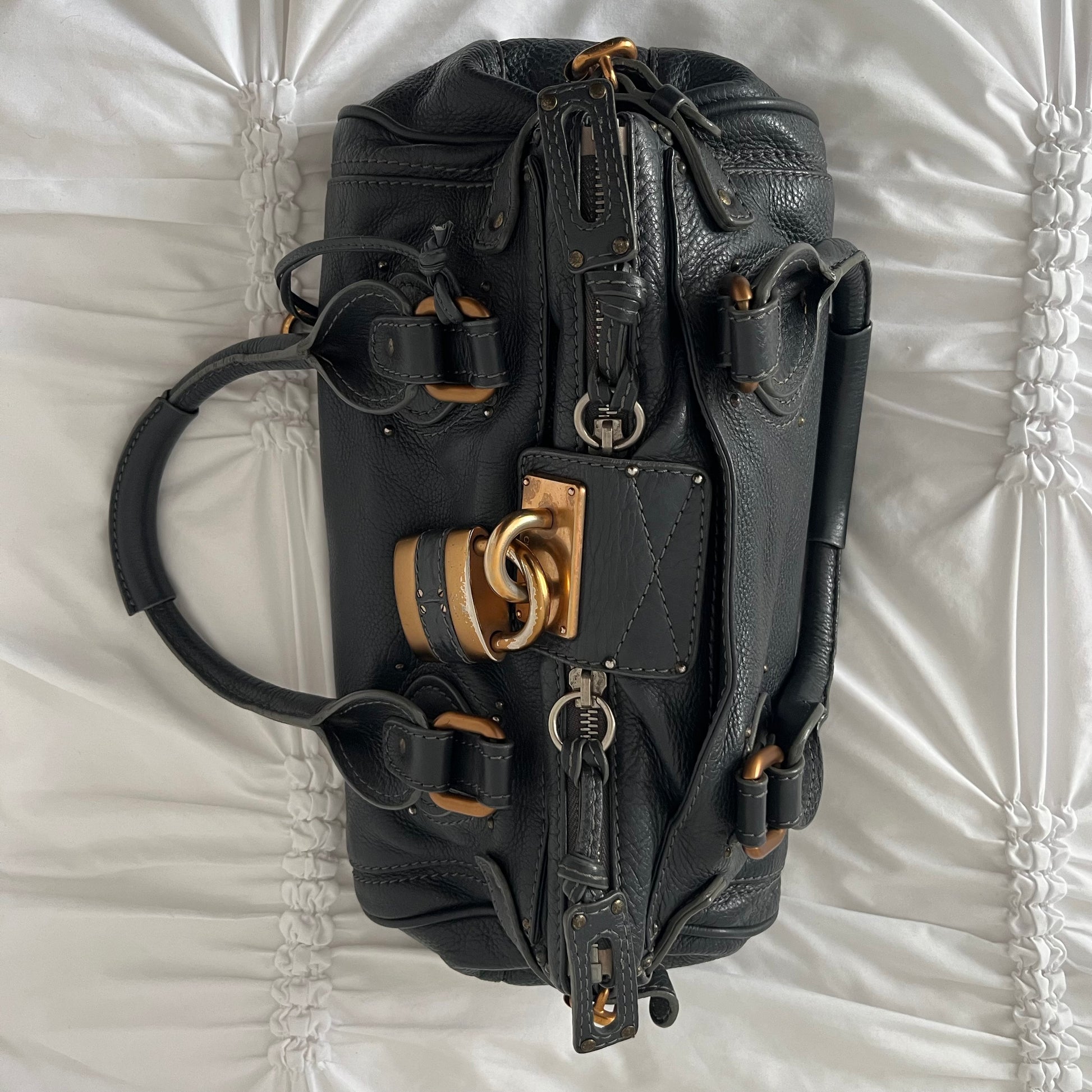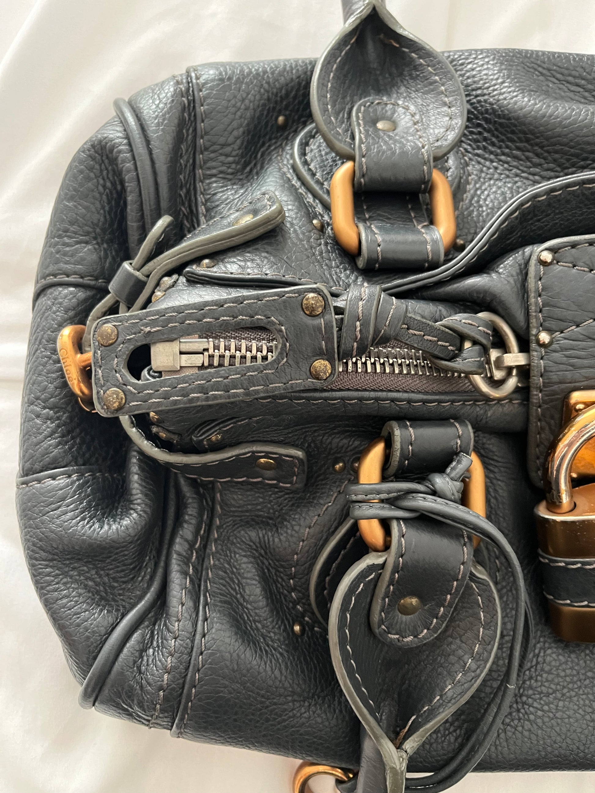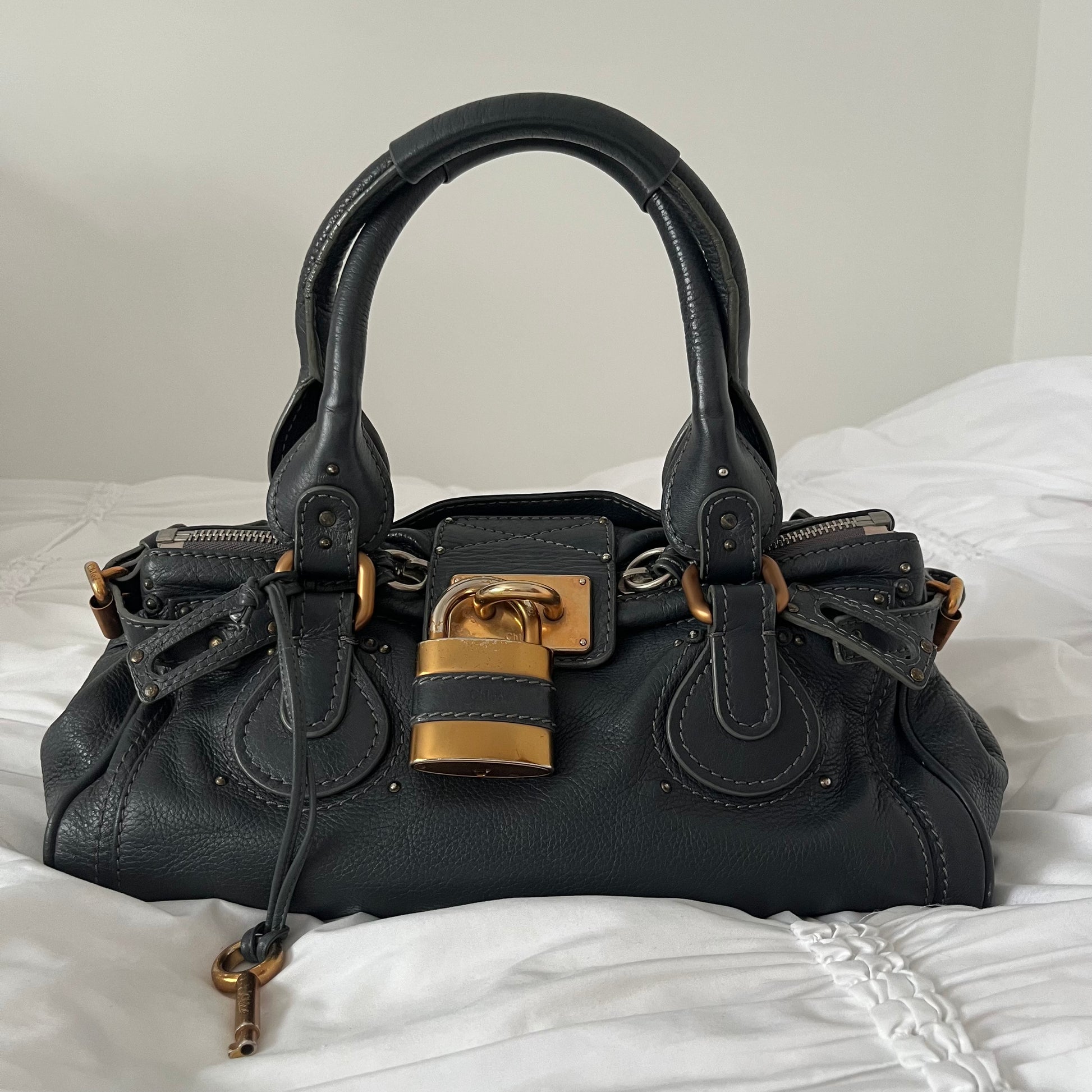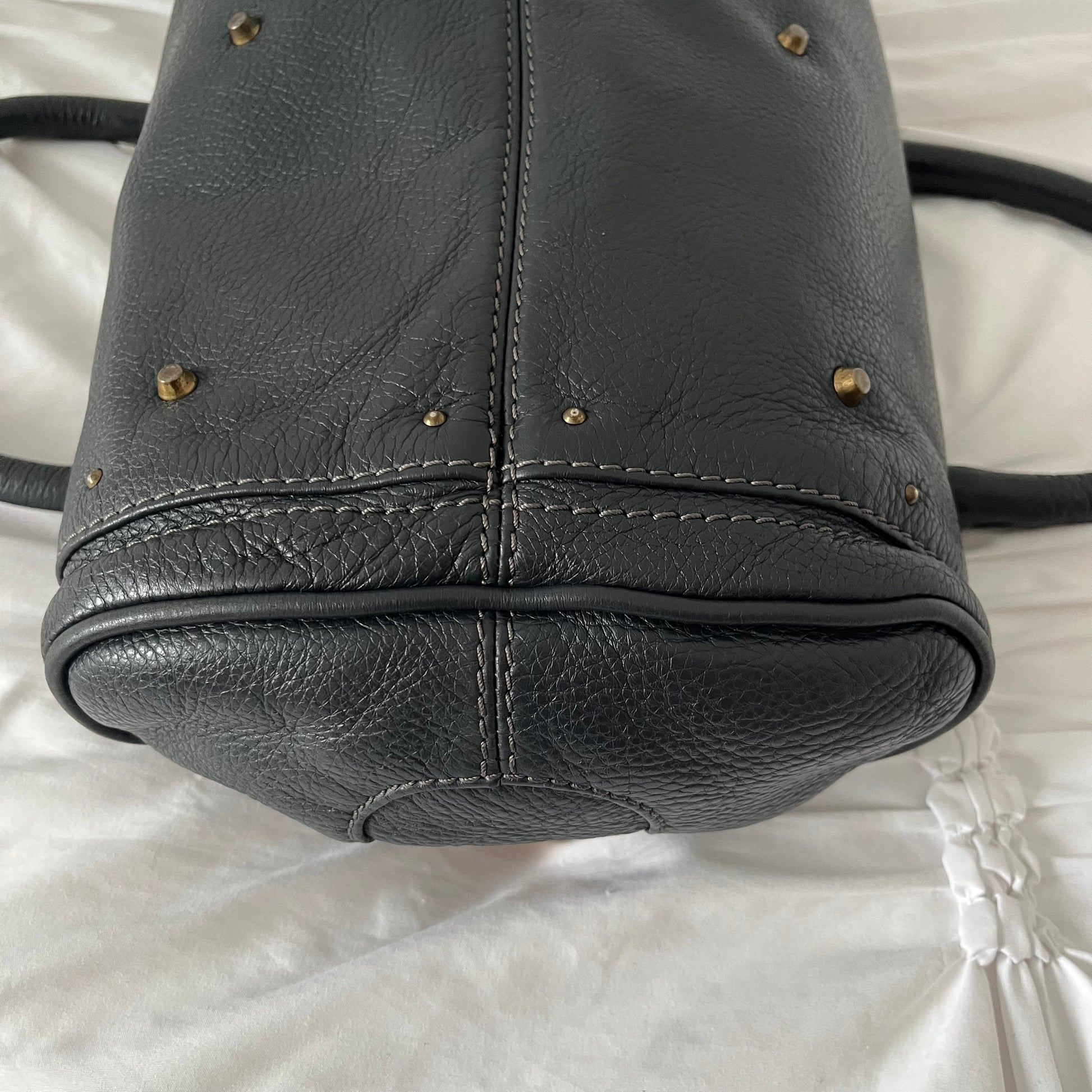 description: rare dark gray leather, padlock, leather on key has been replaced, lock and key are original and work, sits nicely on shoulder, holds all necessities, medium size, one main pocket with zipper pocket, 2 deep side pockets, dust bag included