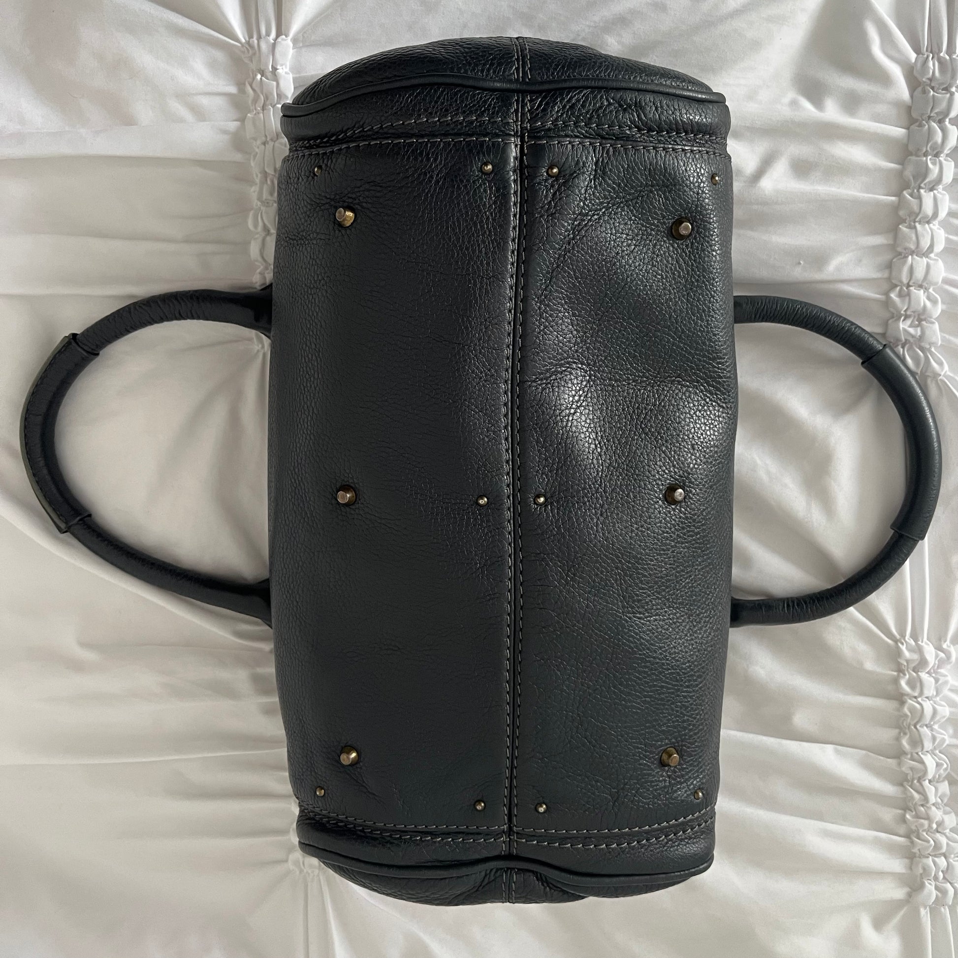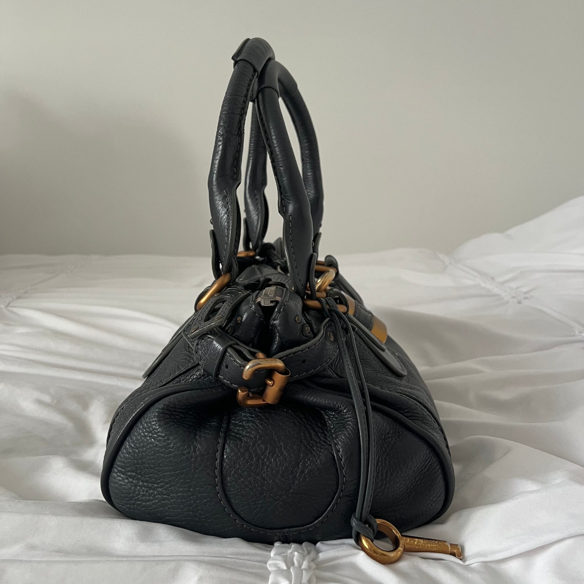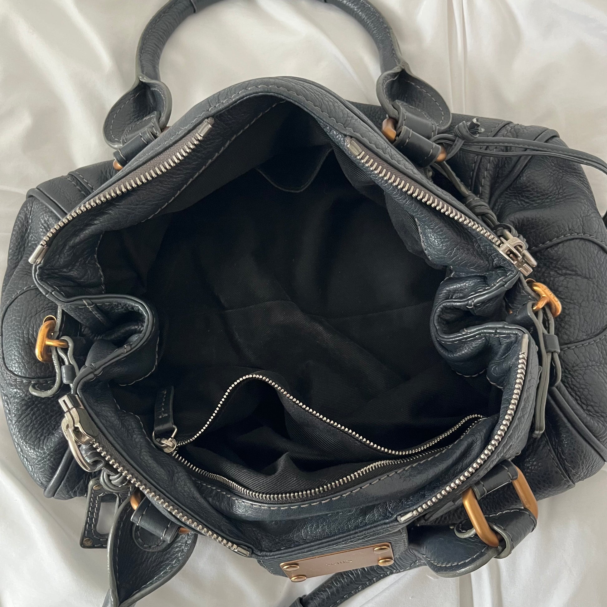 description: rare dark gray leather, padlock, leather on key has been replaced, lock and key are original and work, sits nicely on shoulder, holds all necessities, medium size, one main pocket with zipper pocket, 2 deep side pockets, dust bag included