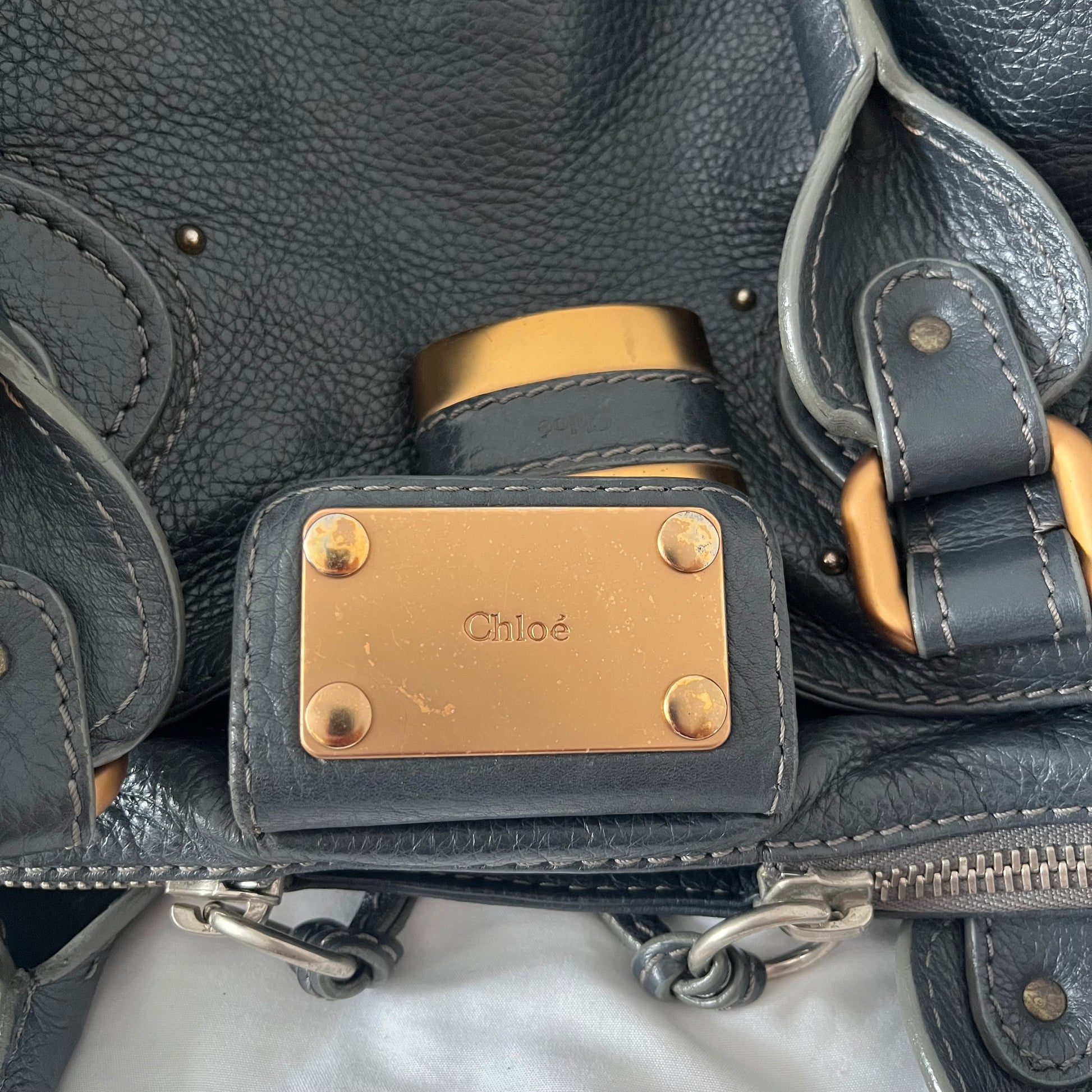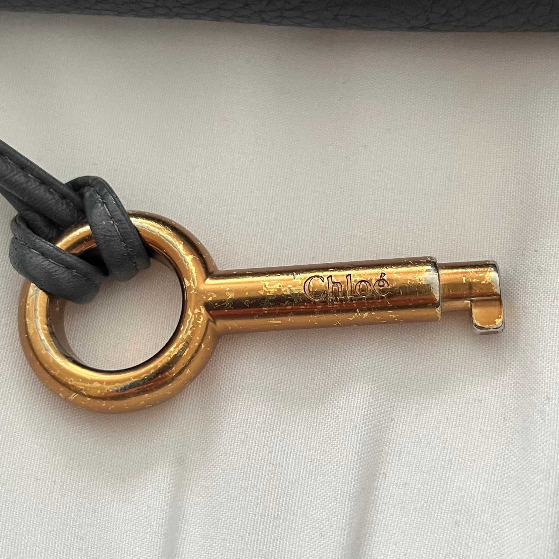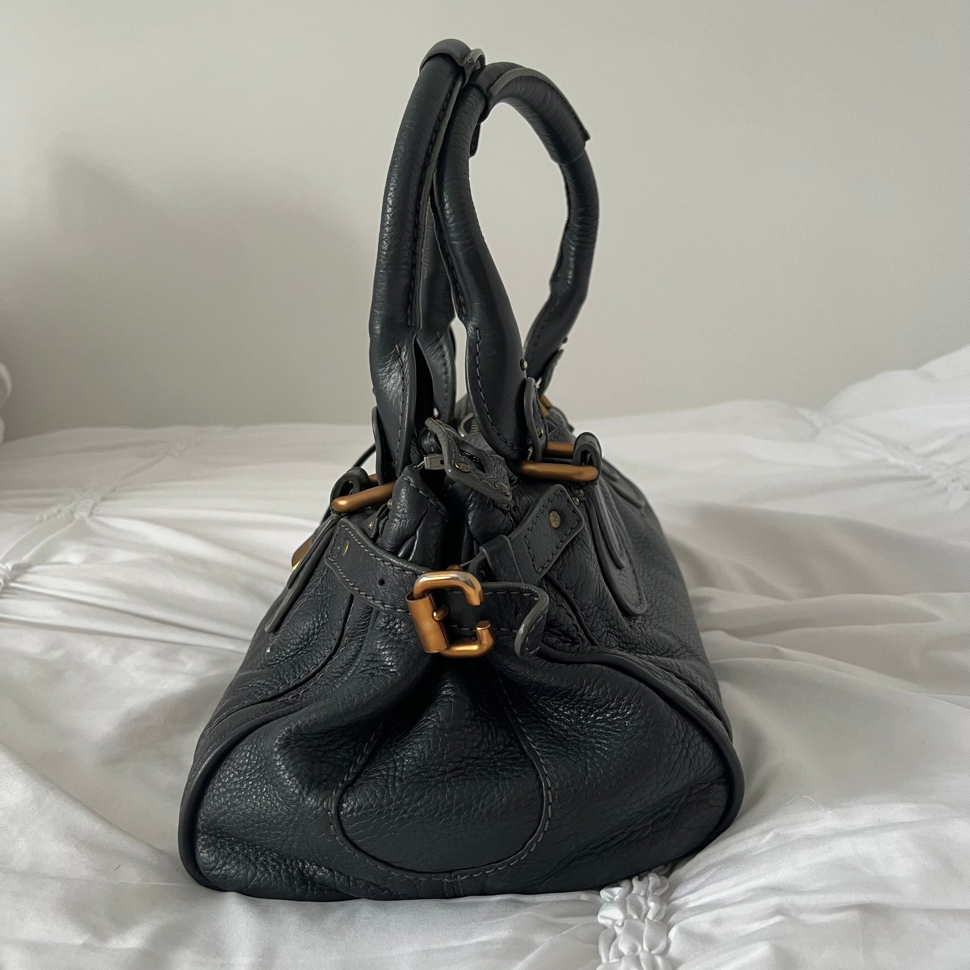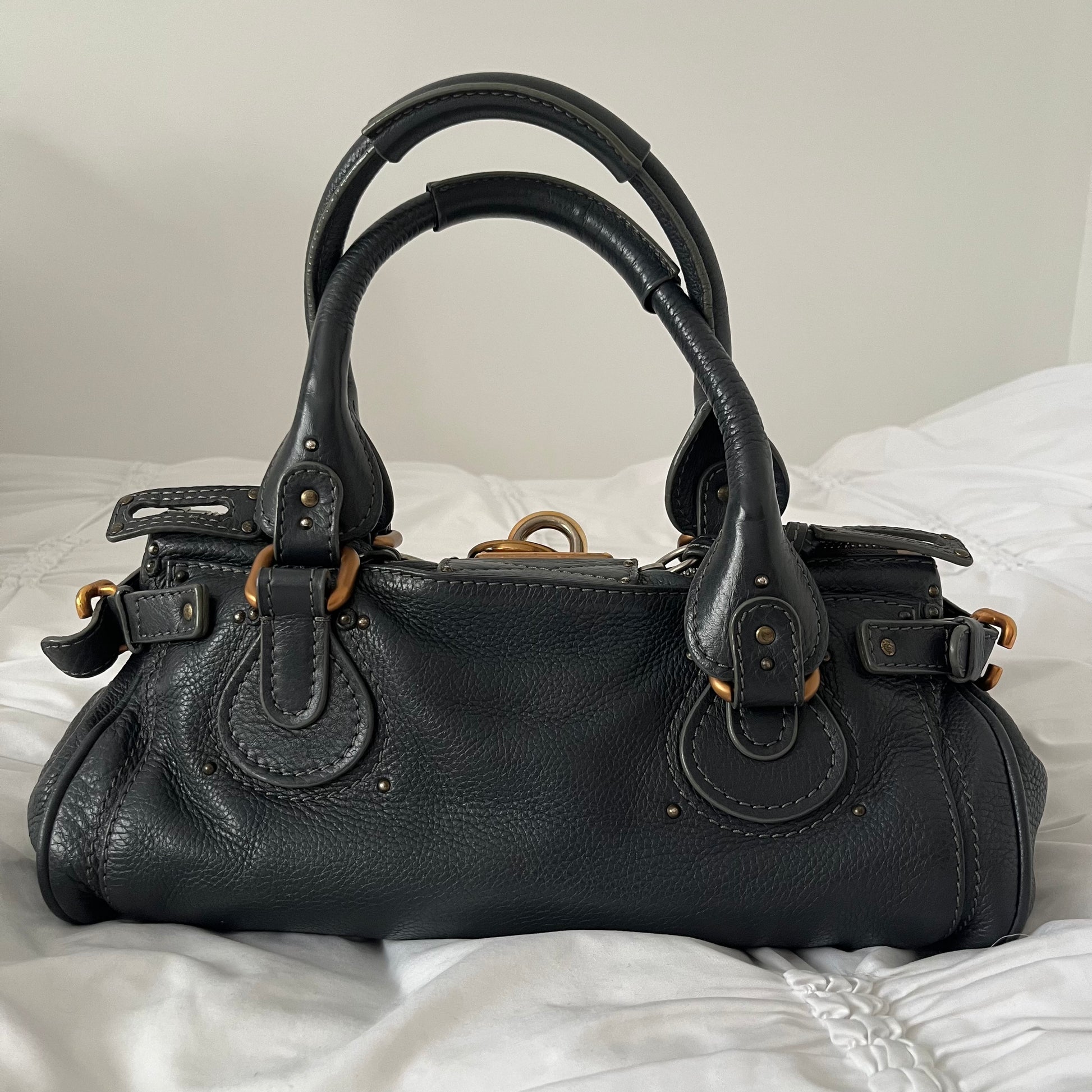 description: rare dark gray leather, padlock, leather on key has been replaced, lock and key are original and work, sits nicely on shoulder, holds all necessities, medium size, one main pocket with zipper pocket, 2 deep side pockets, dust bag included