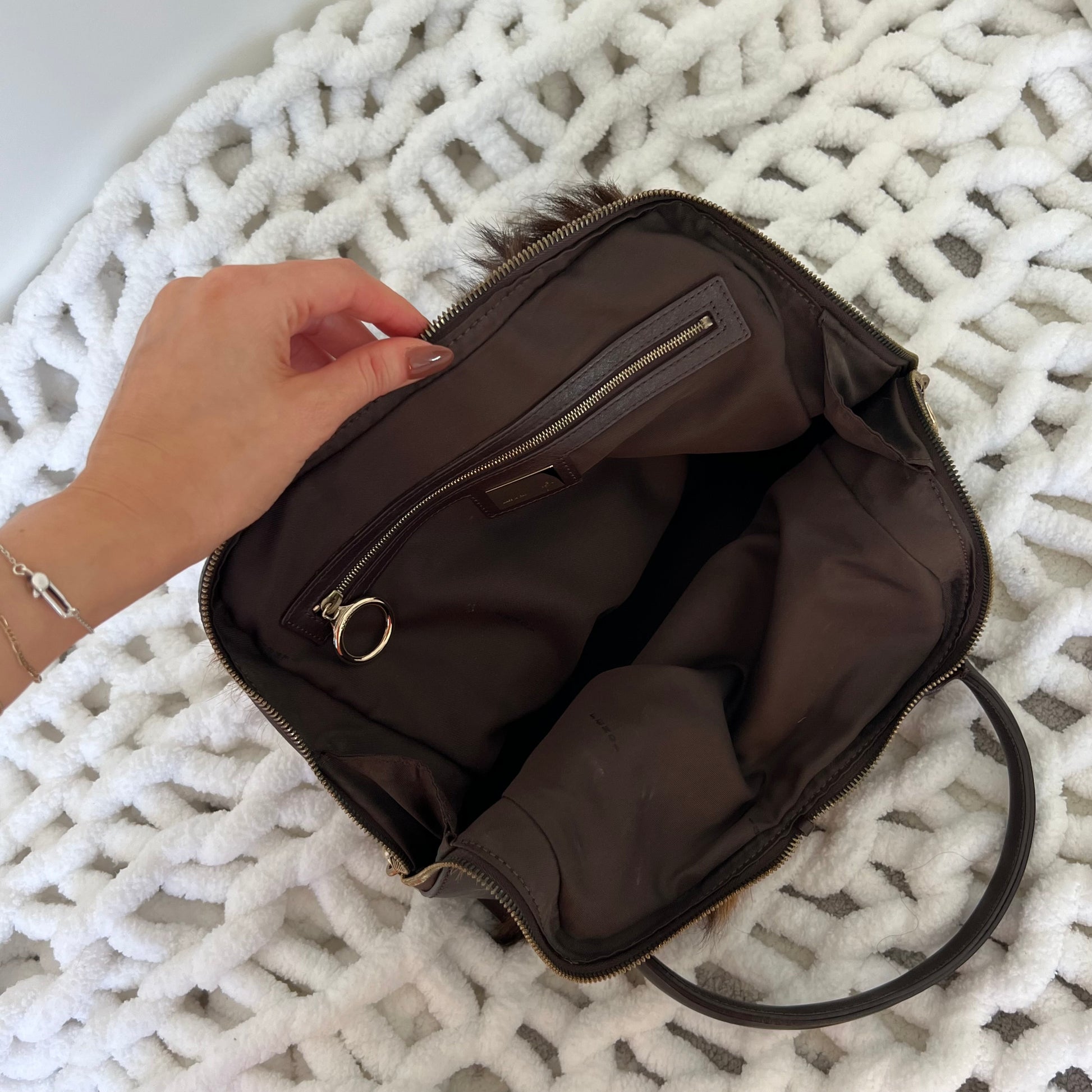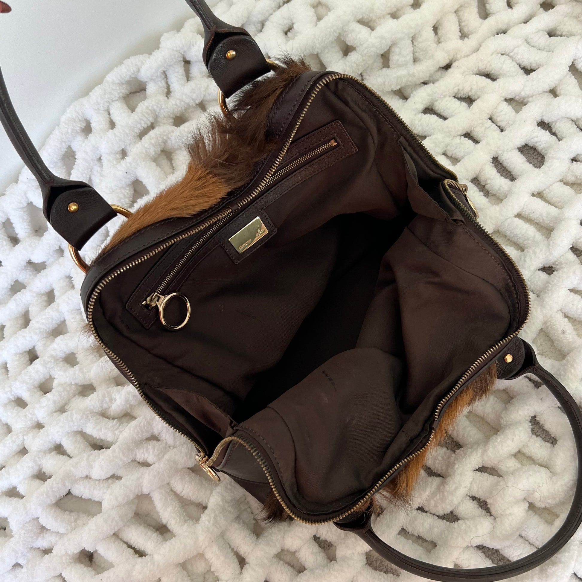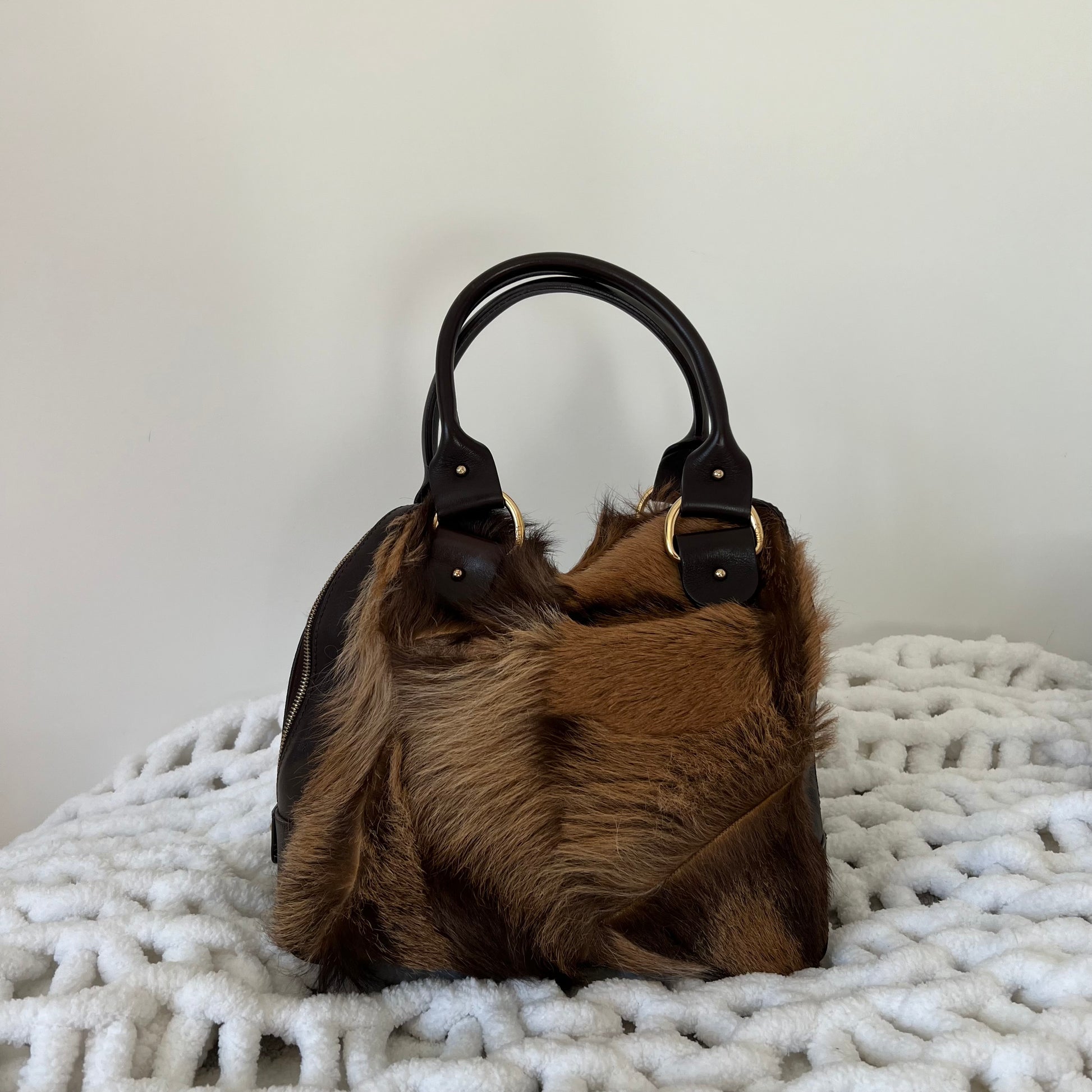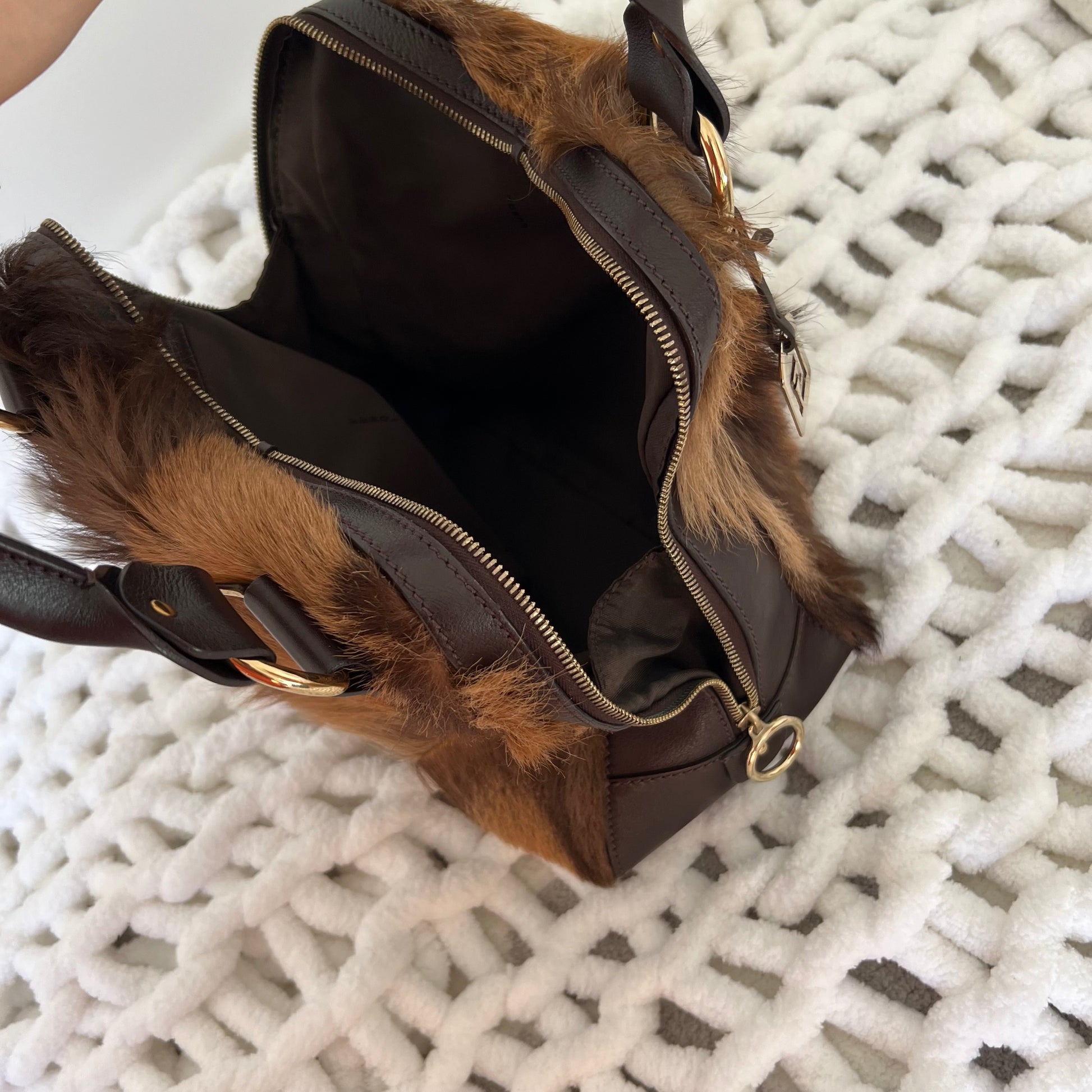 description: calf brown leather, gold hardware, 1 main pocket, 1 interior zipper, logo charm