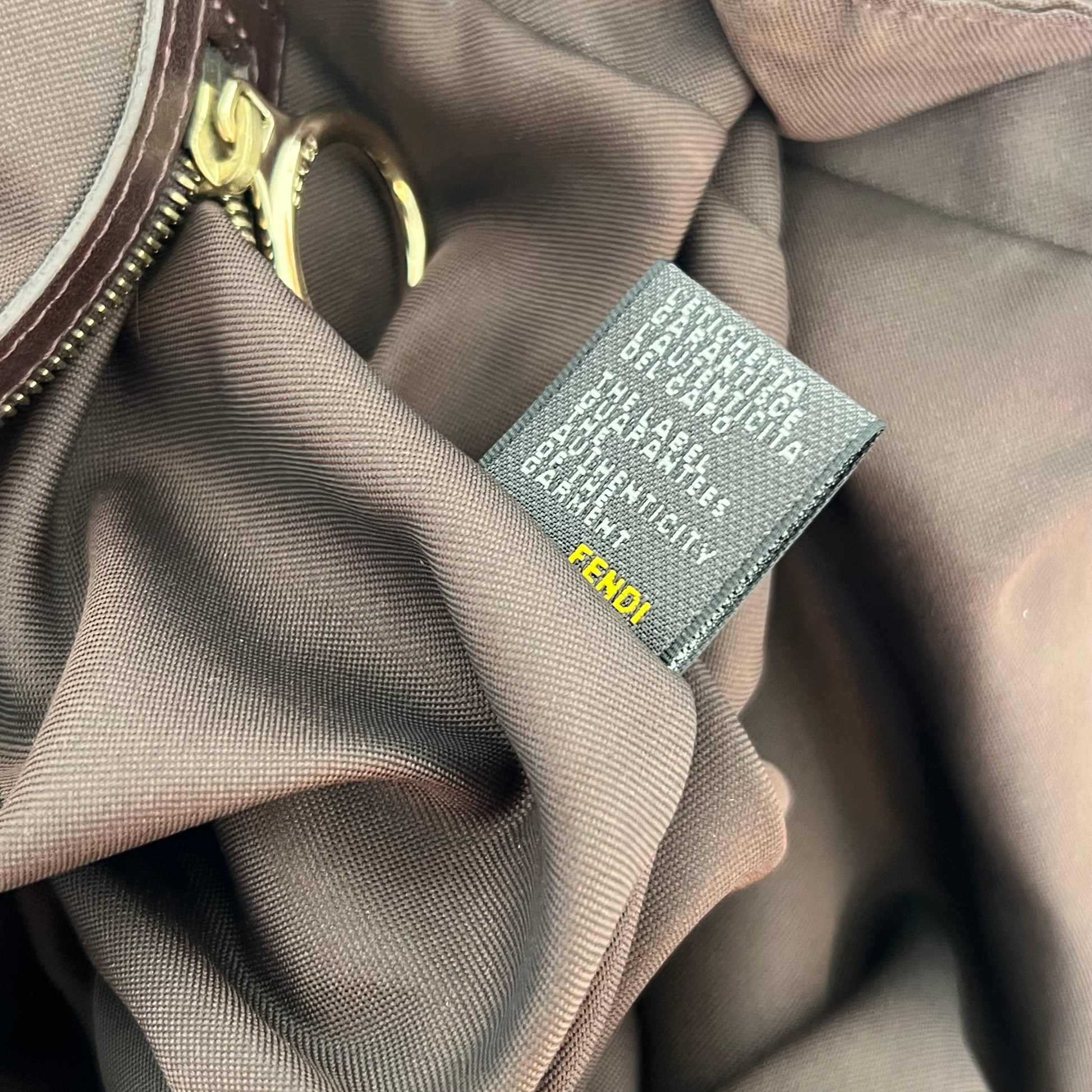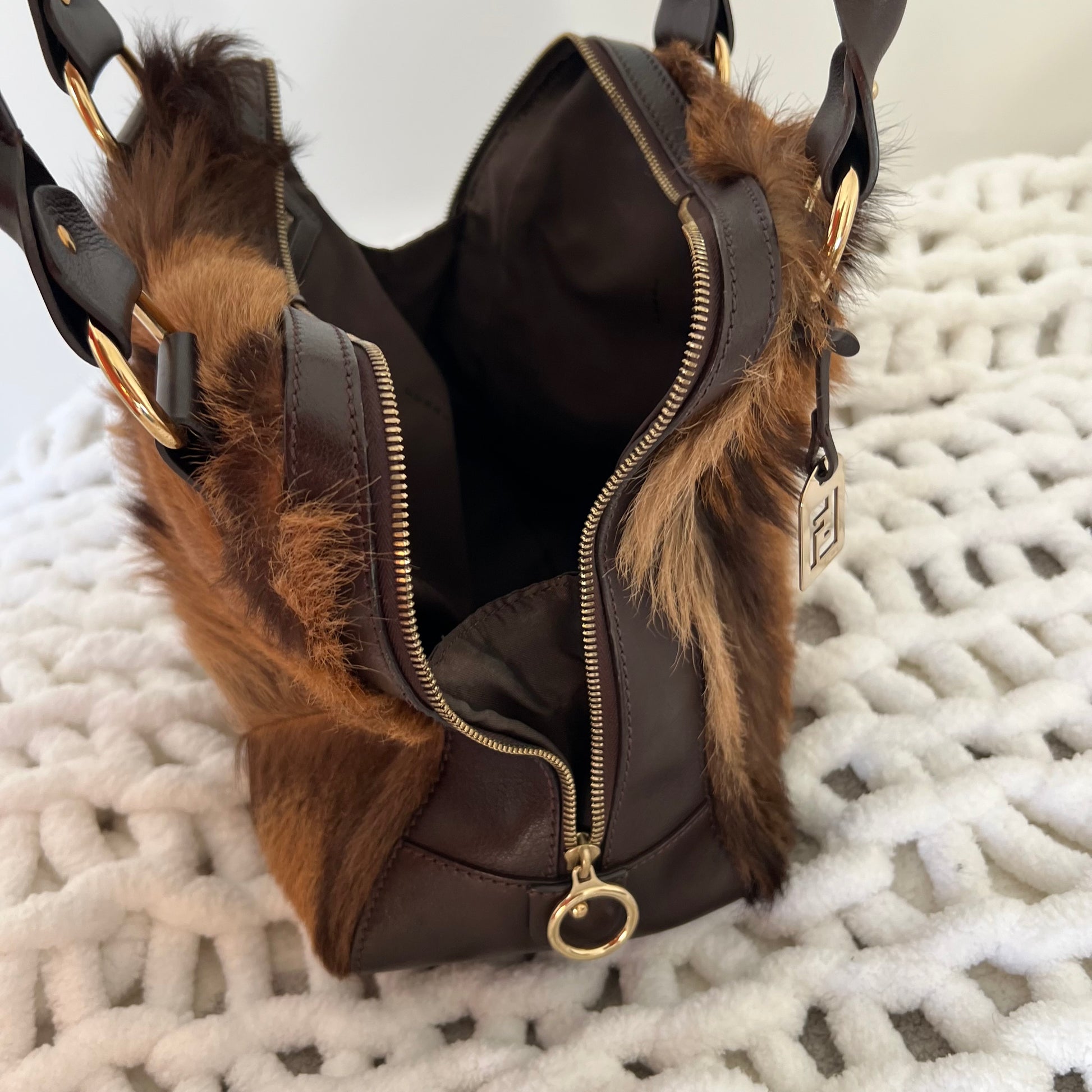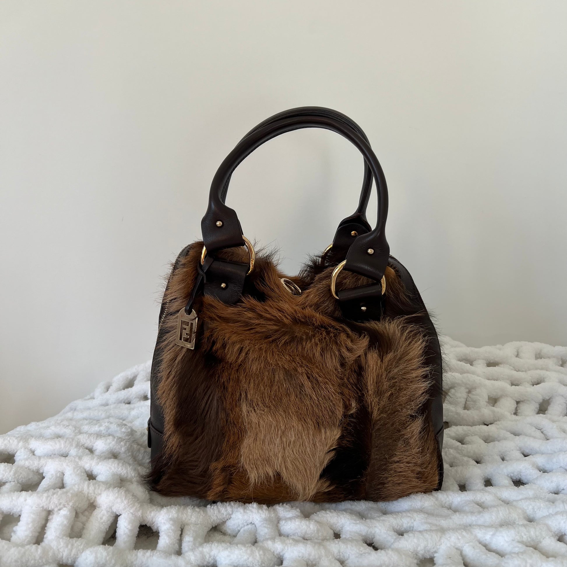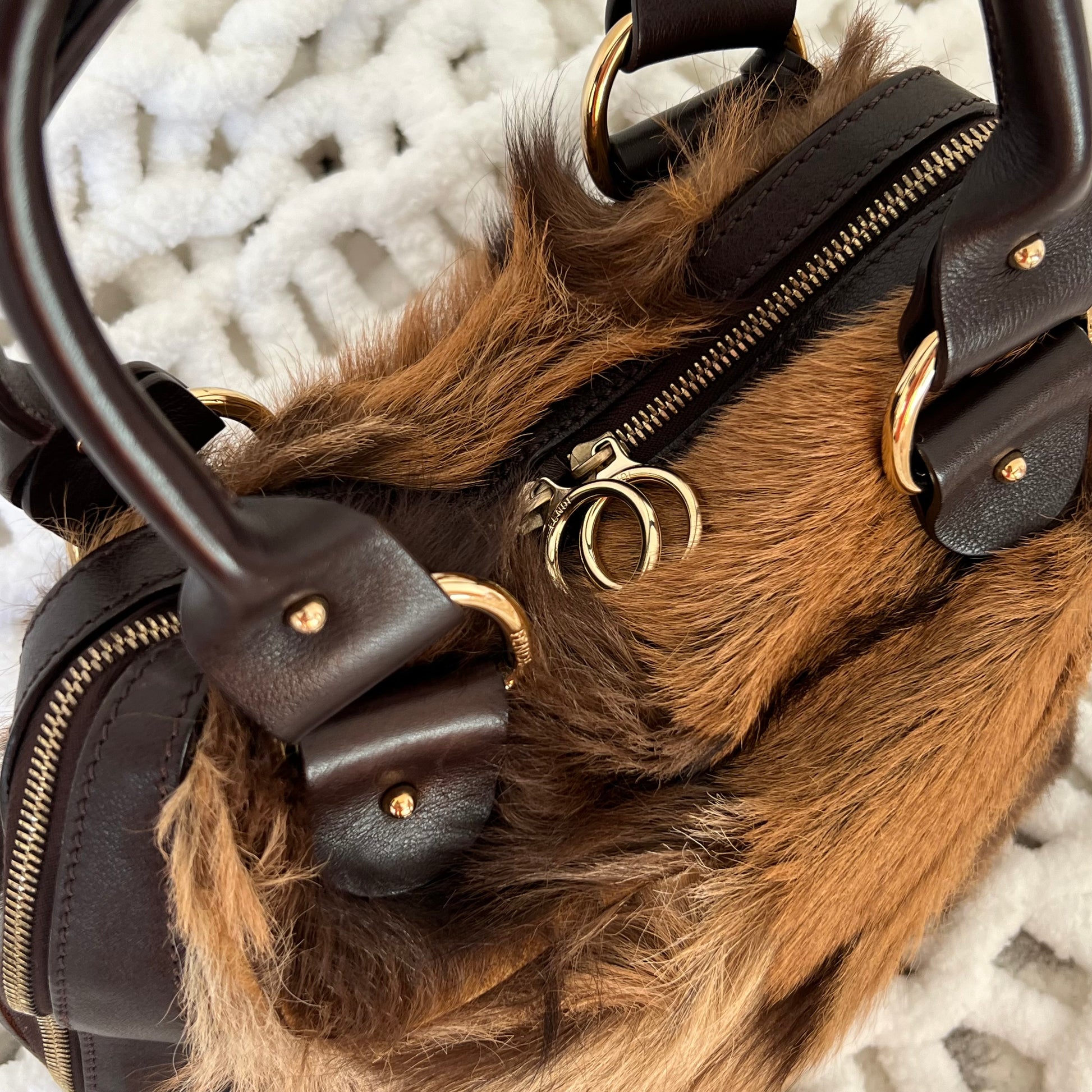 description: calf brown leather, gold hardware, 1 main pocket, 1 interior zipper, logo charm