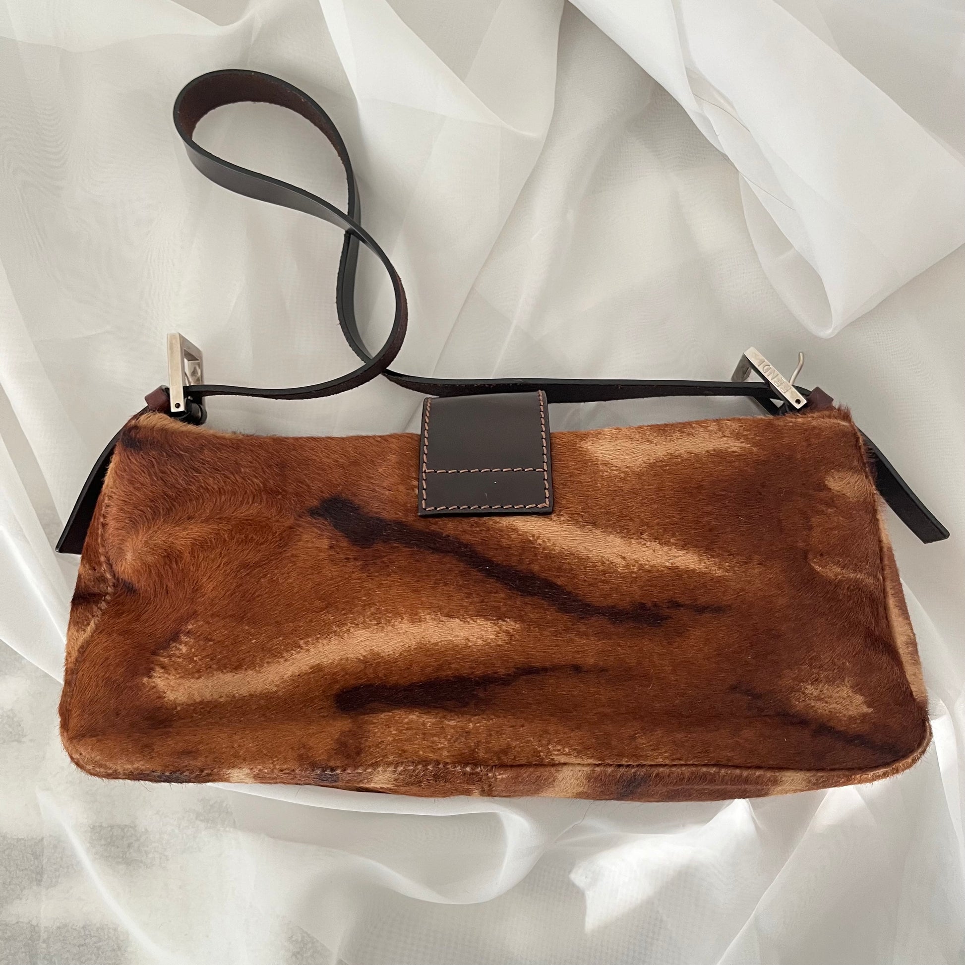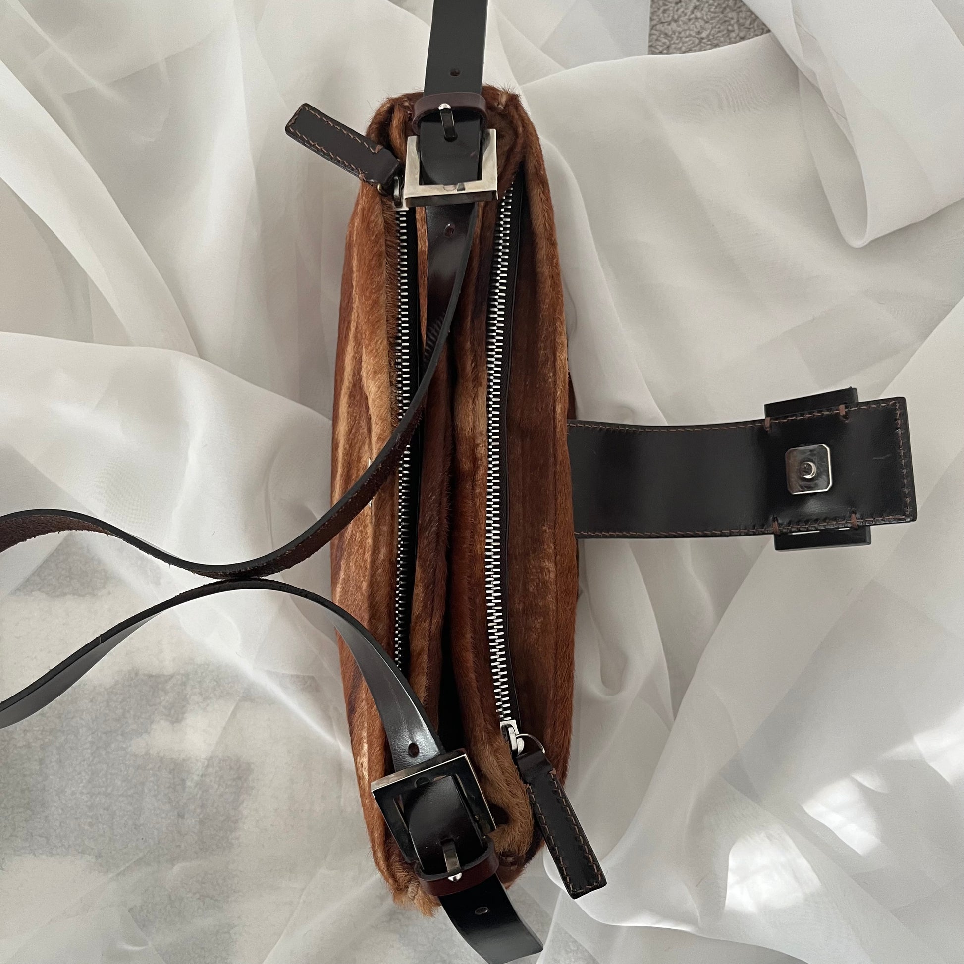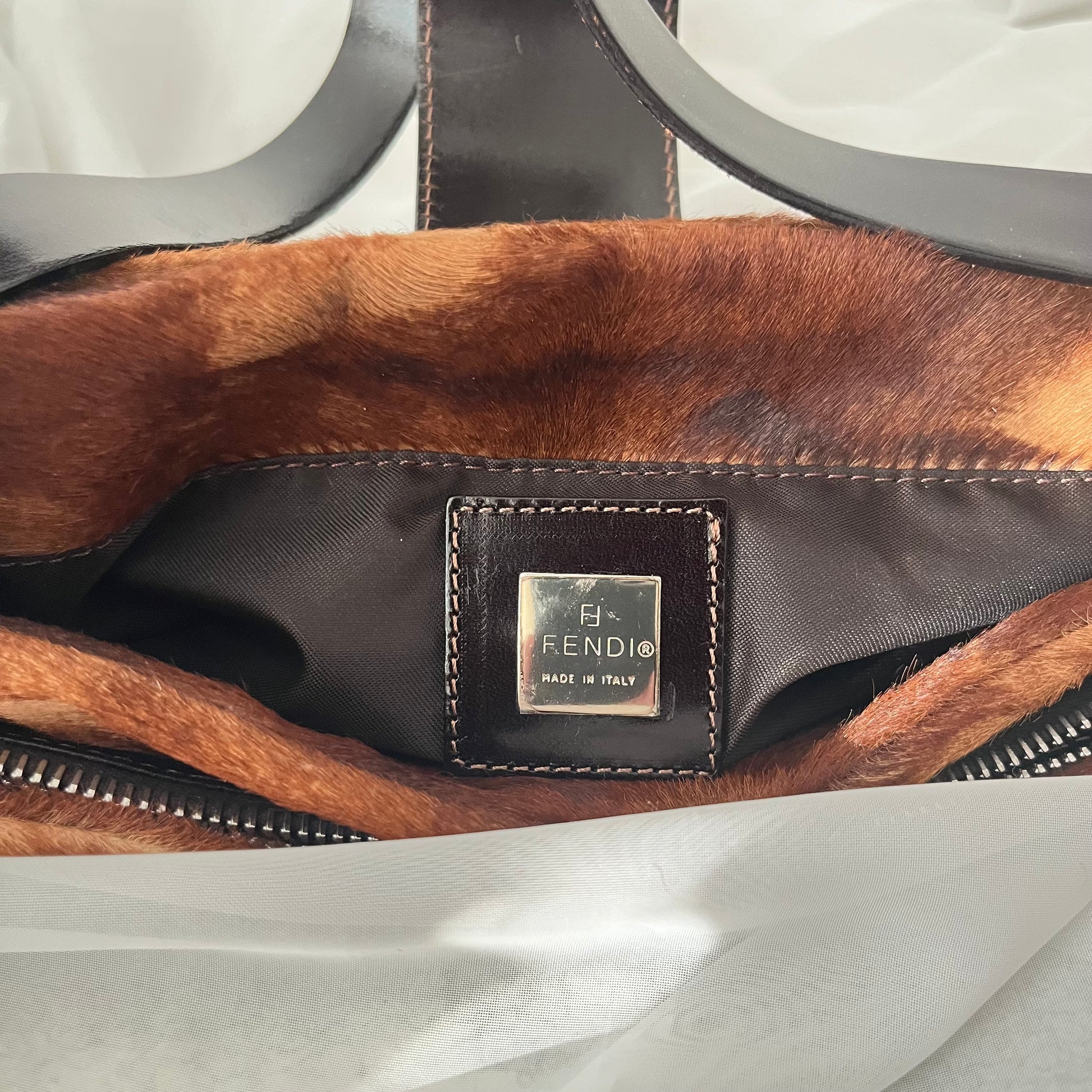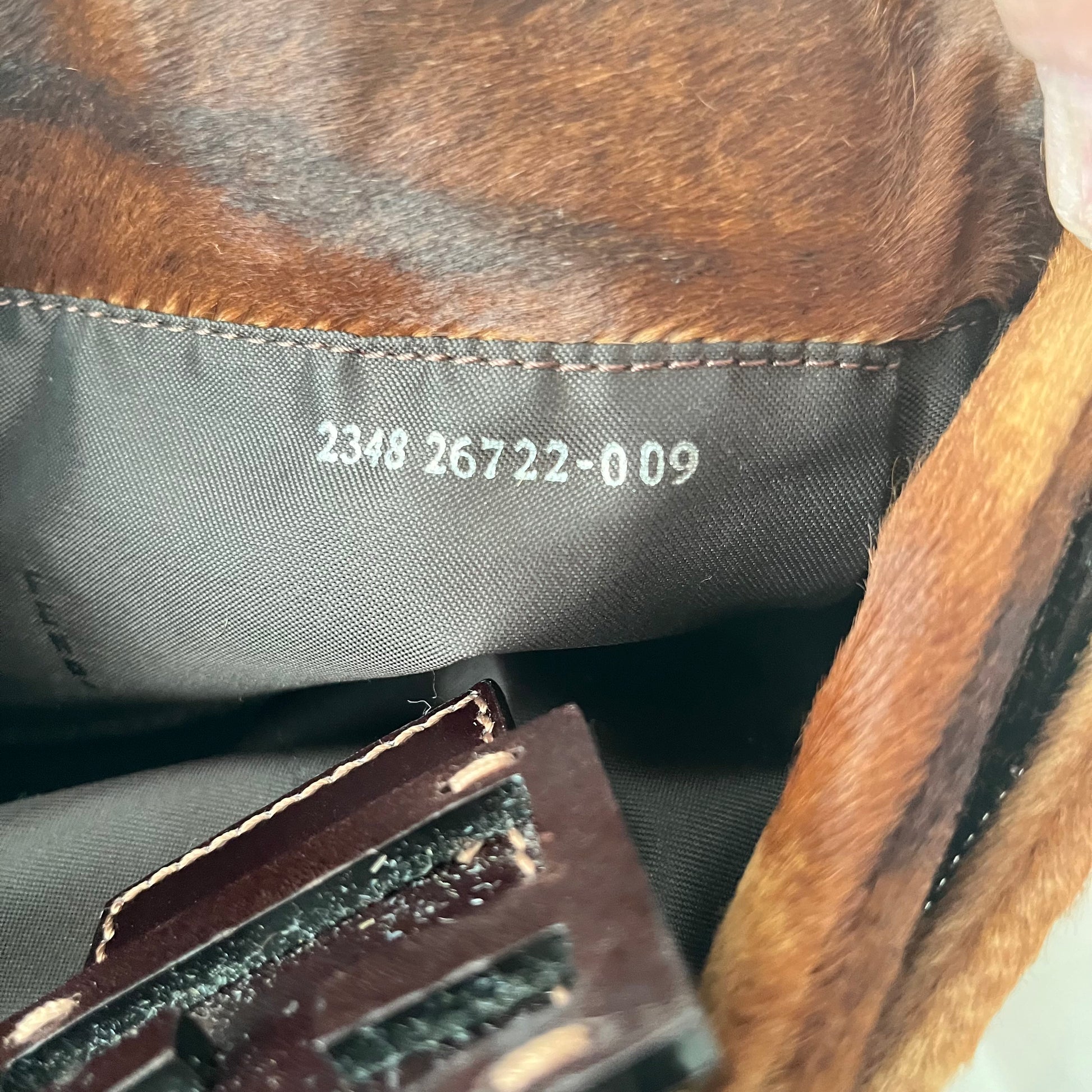 Description: calf skin material, dark brown leather detailing, silver hardware, 2 main zipper pockets, middle magnetic pocket