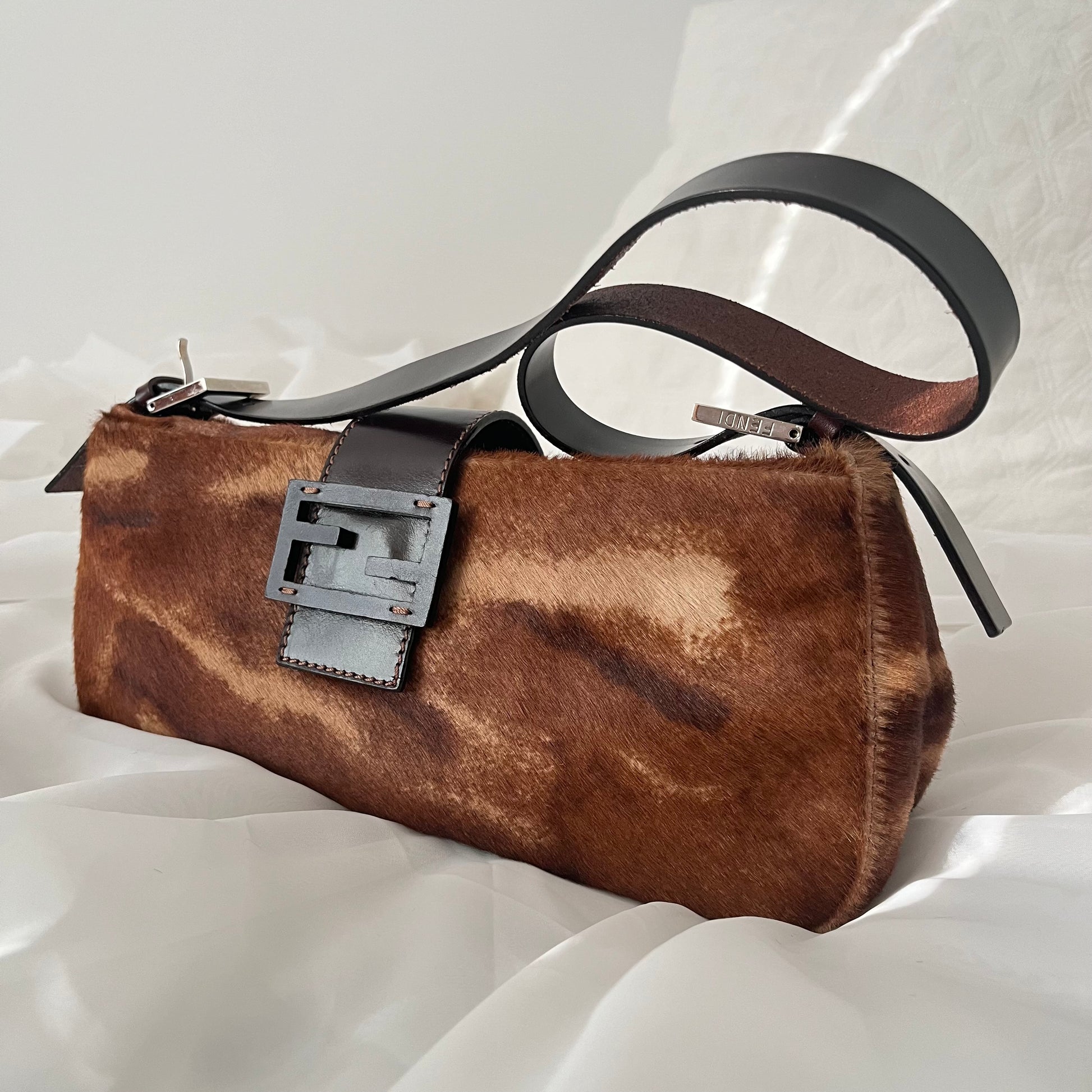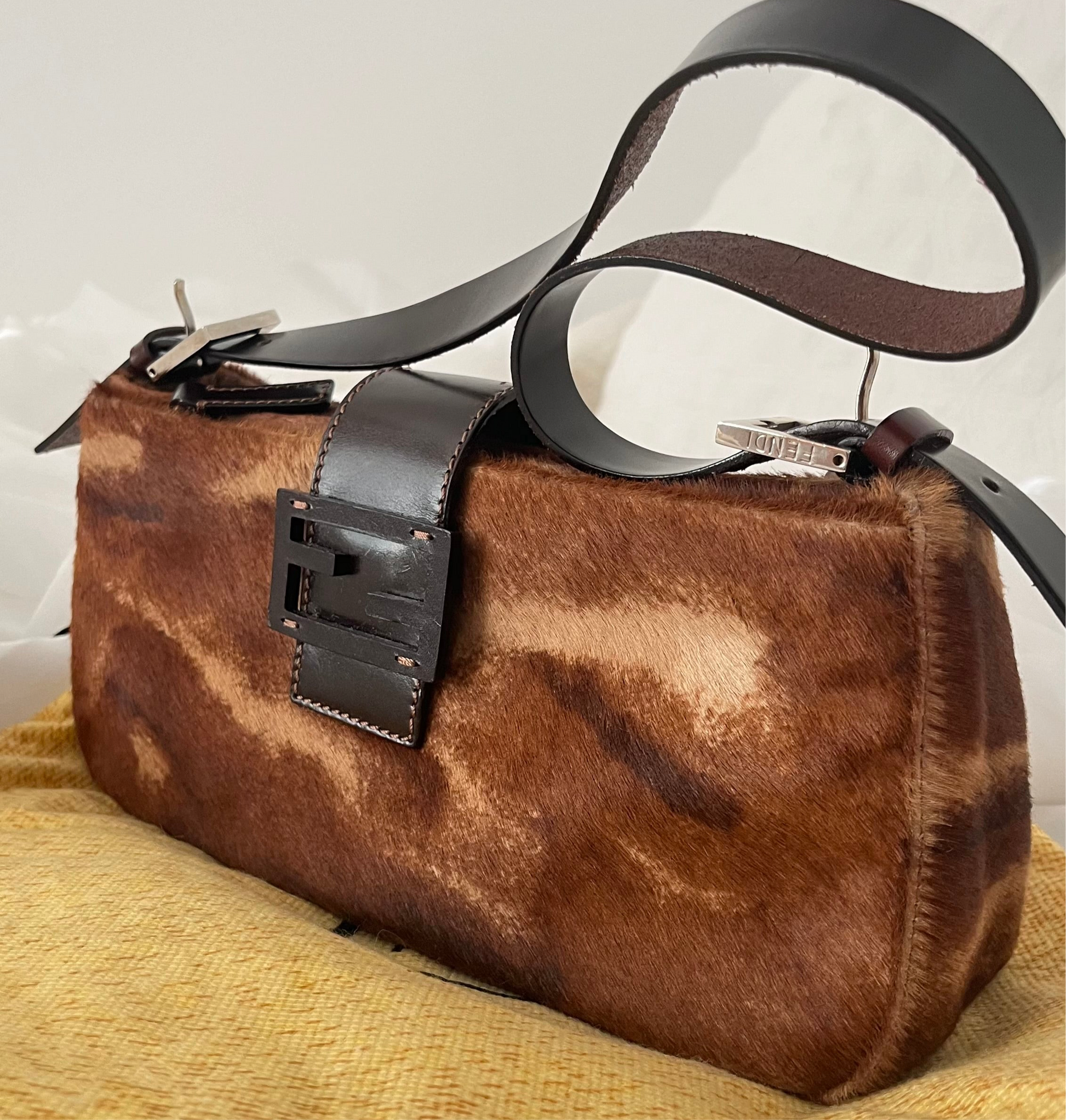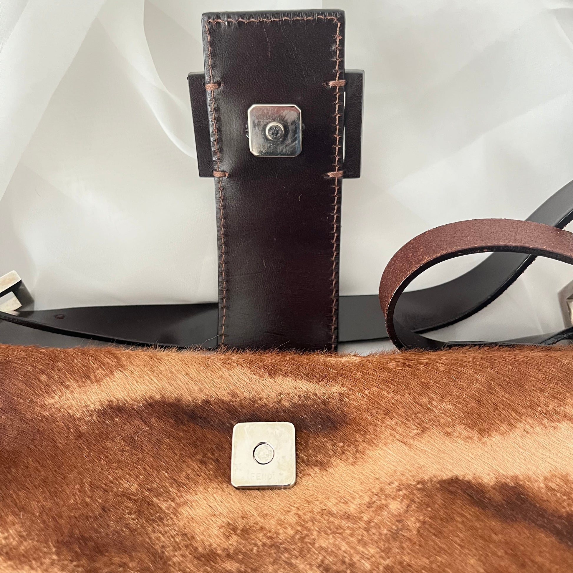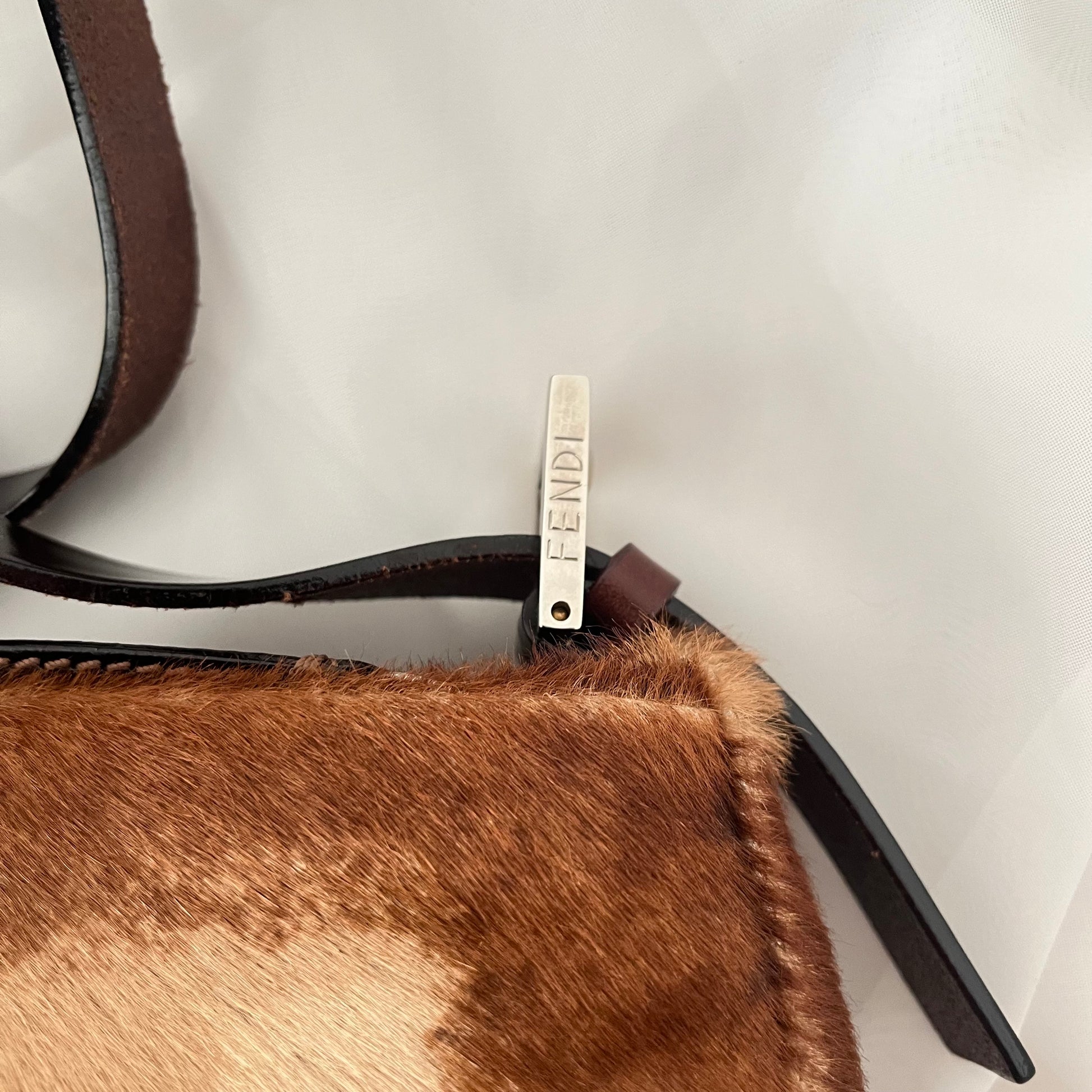 Description: calf skin material, dark brown leather detailing, silver hardware, 2 main zipper pockets, middle magnetic pocket