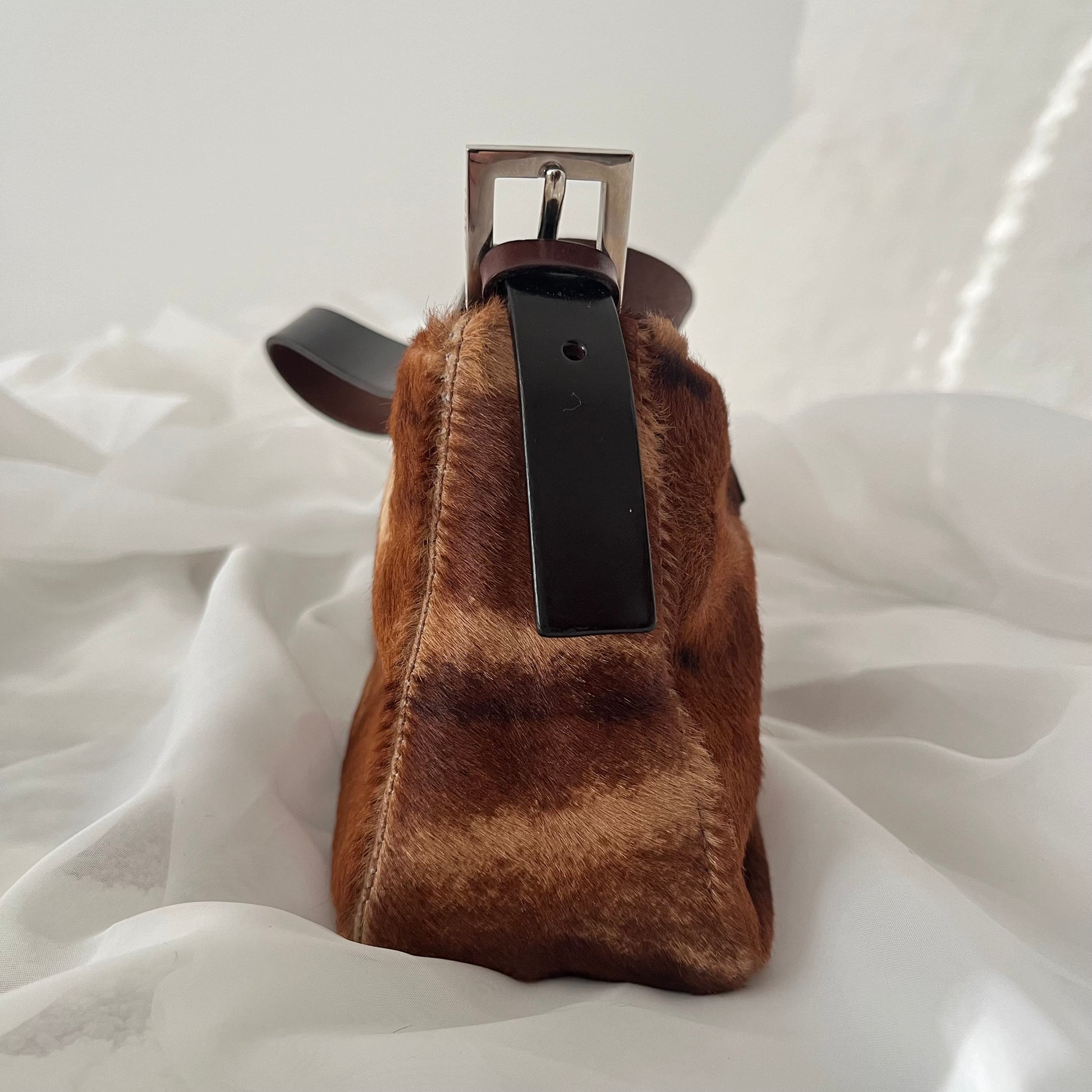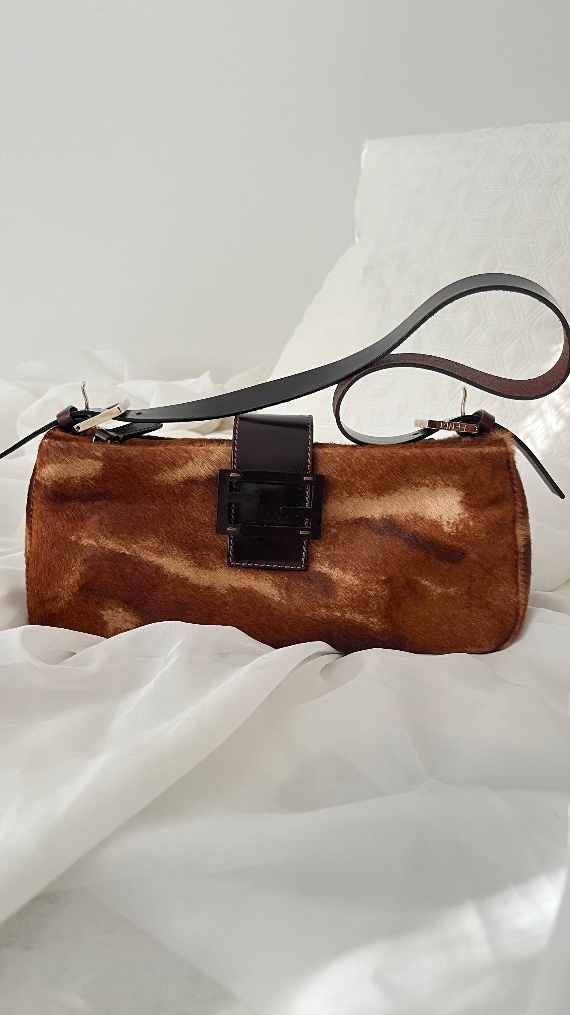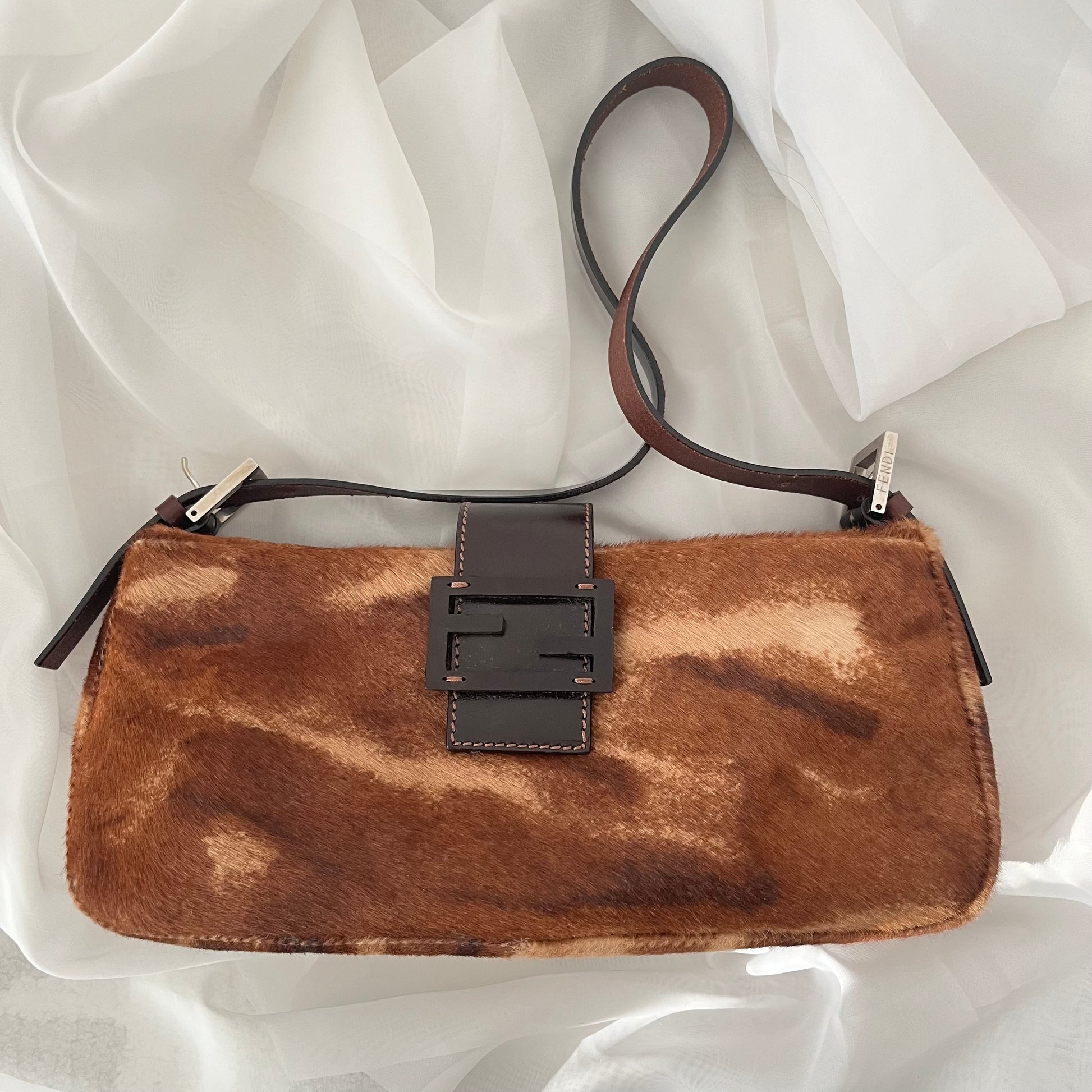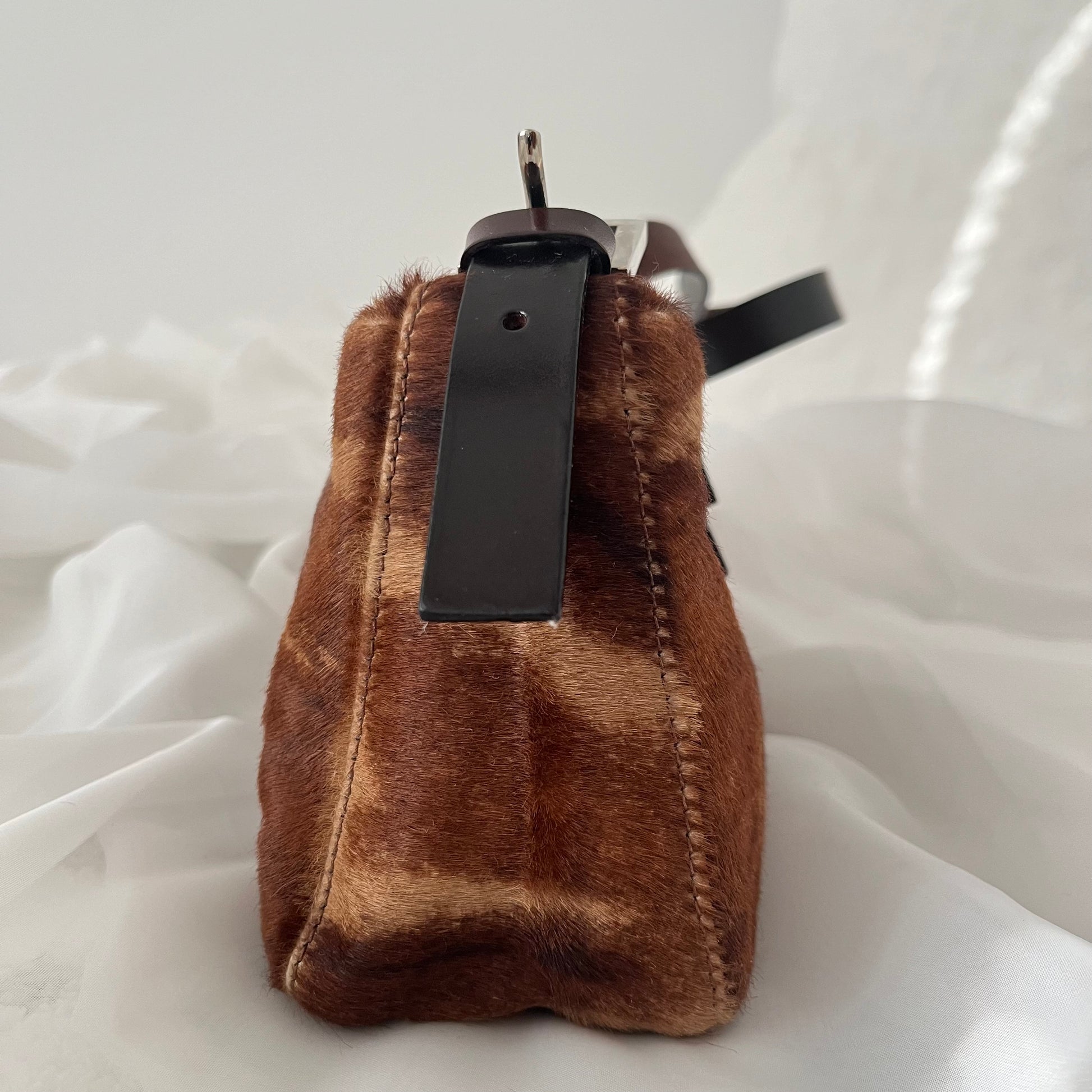 Description: calf skin material, dark brown leather detailing, silver hardware, 2 main zipper pockets, middle magnetic pocket