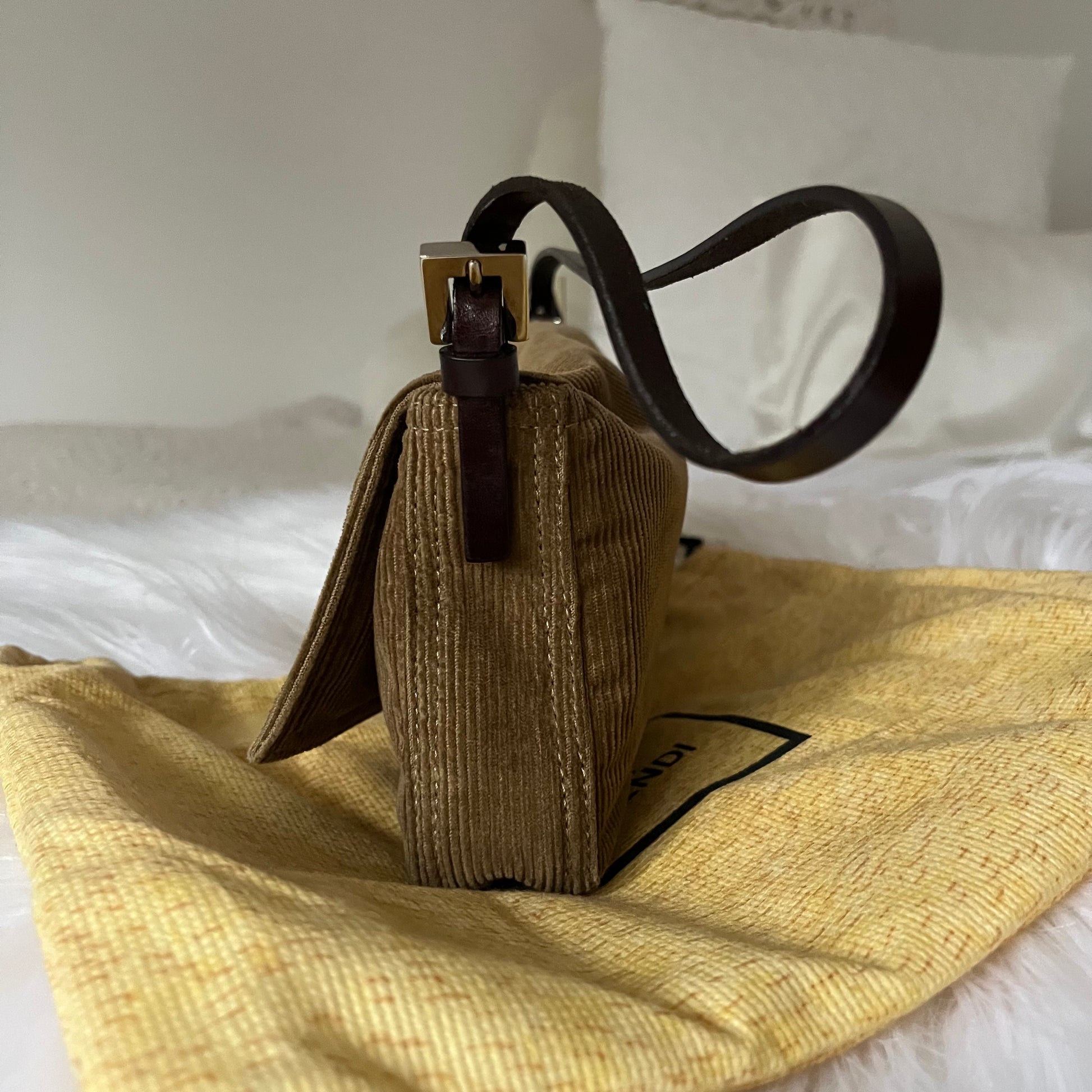 description: corduroy material, brown leather detailing, silver hardware, one main pocket, sits nicely on shoulder, minor discoloration on back (smaller than a Penny) see last photo