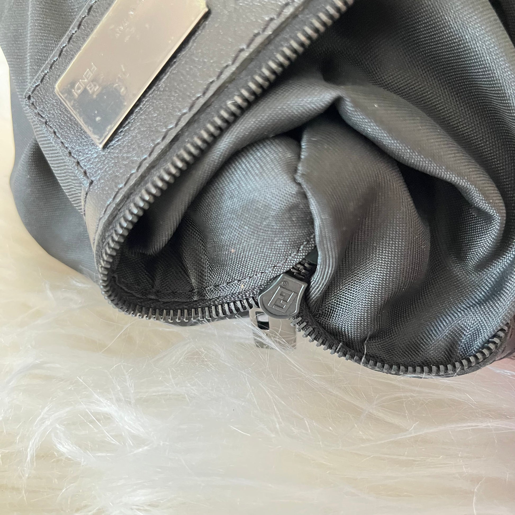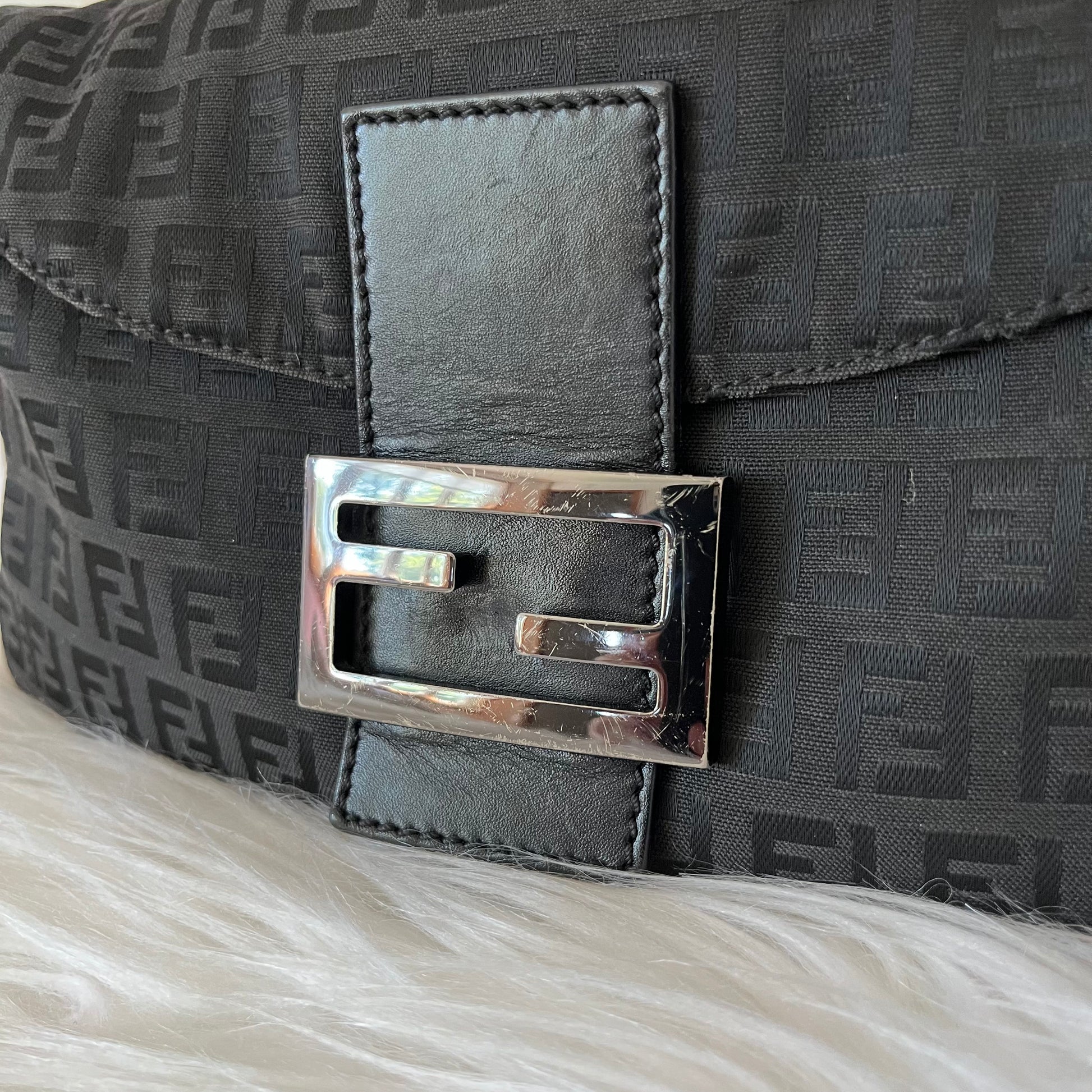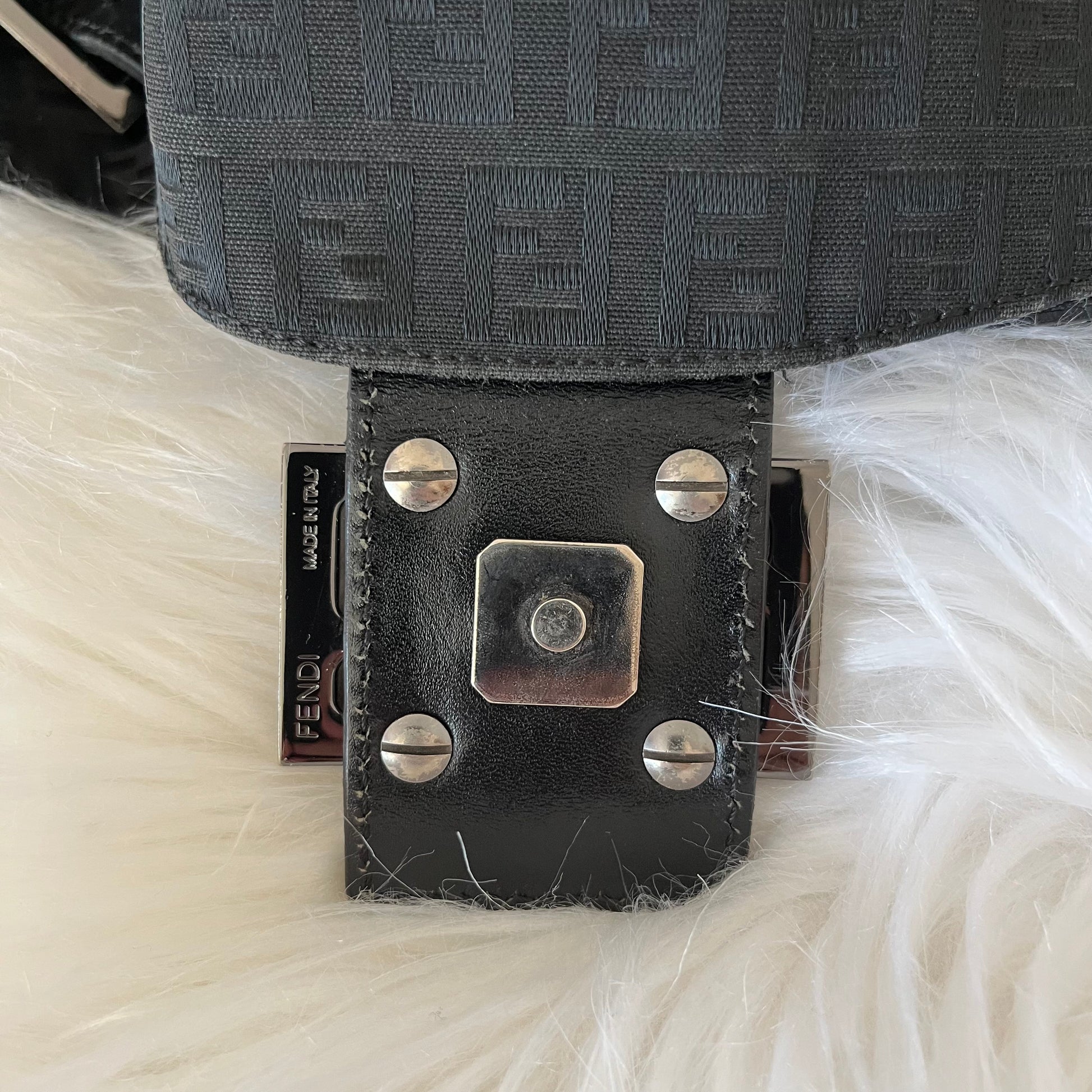 description: black zucca canvas, silver hardware, minor scratches on buckle