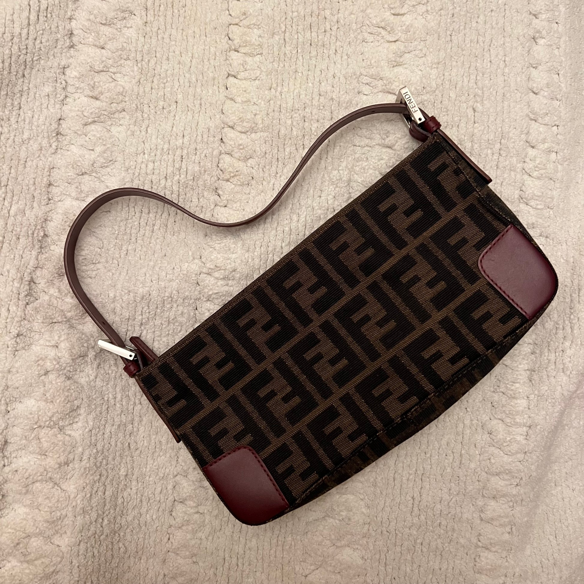 description: Zucca canvas, red leather detailing, sits nicely on shoulder, 1 main zipper, strap loops on side is replaced (see image for reference)