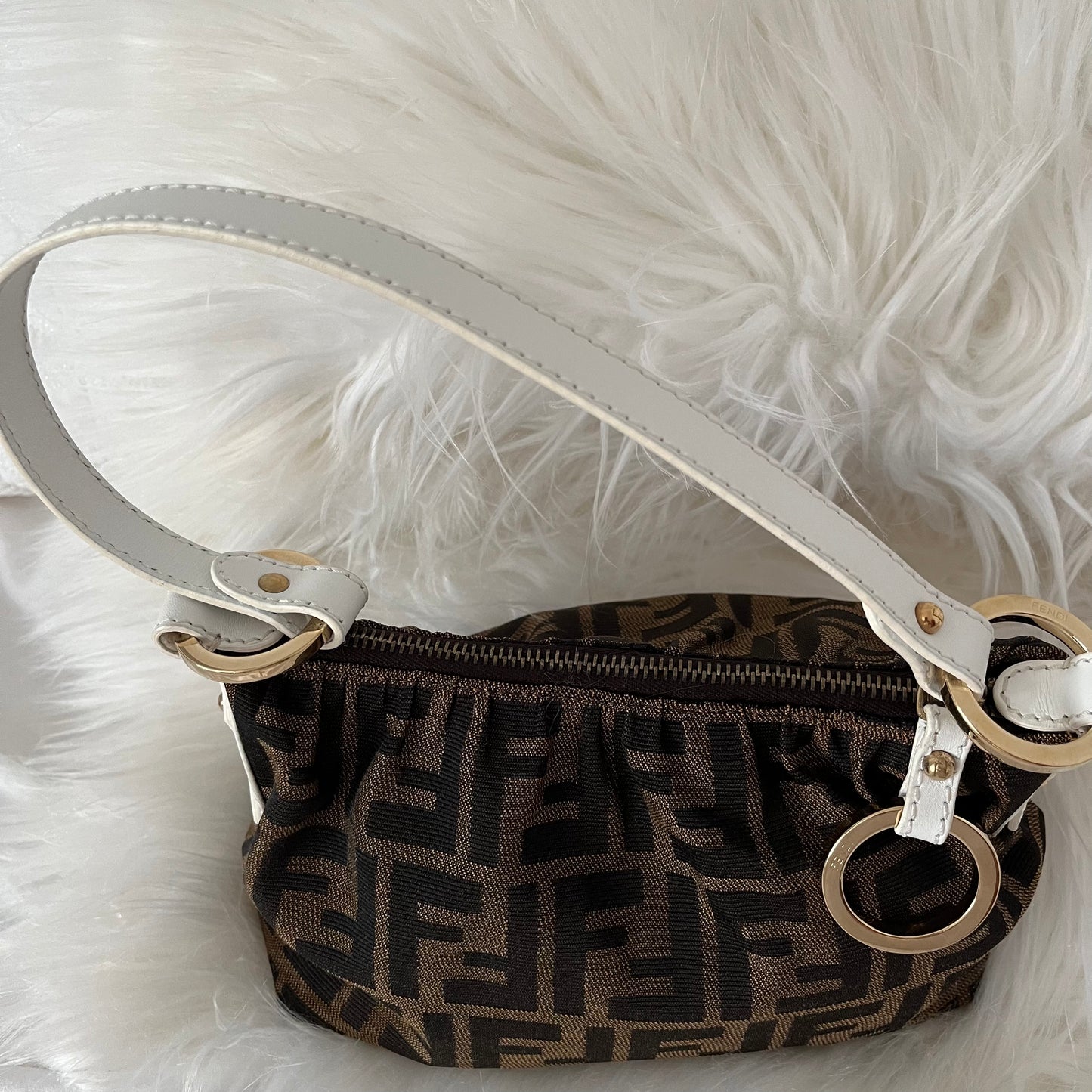 description: zucca pattern, white leather detailing, gold hardware, one main pocket