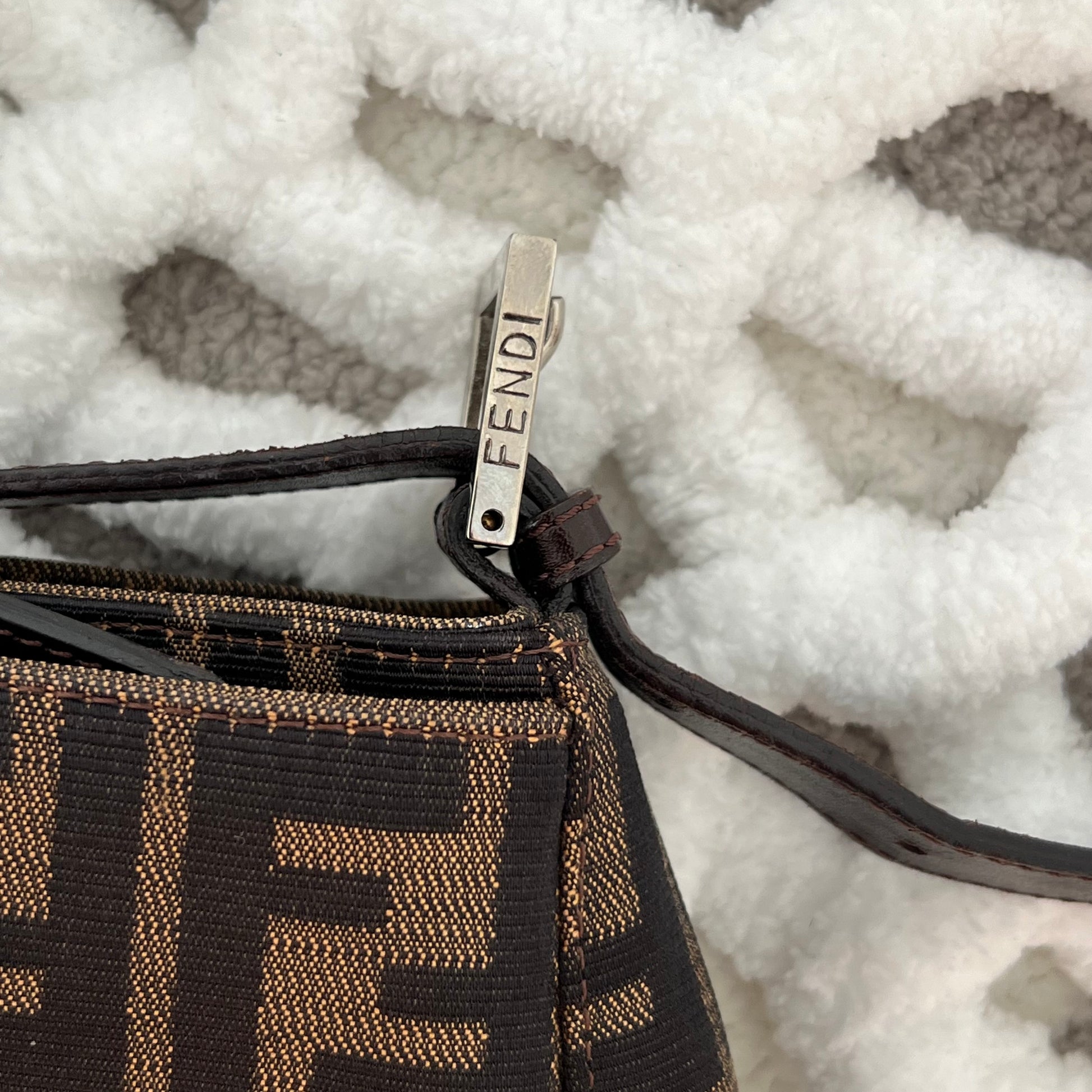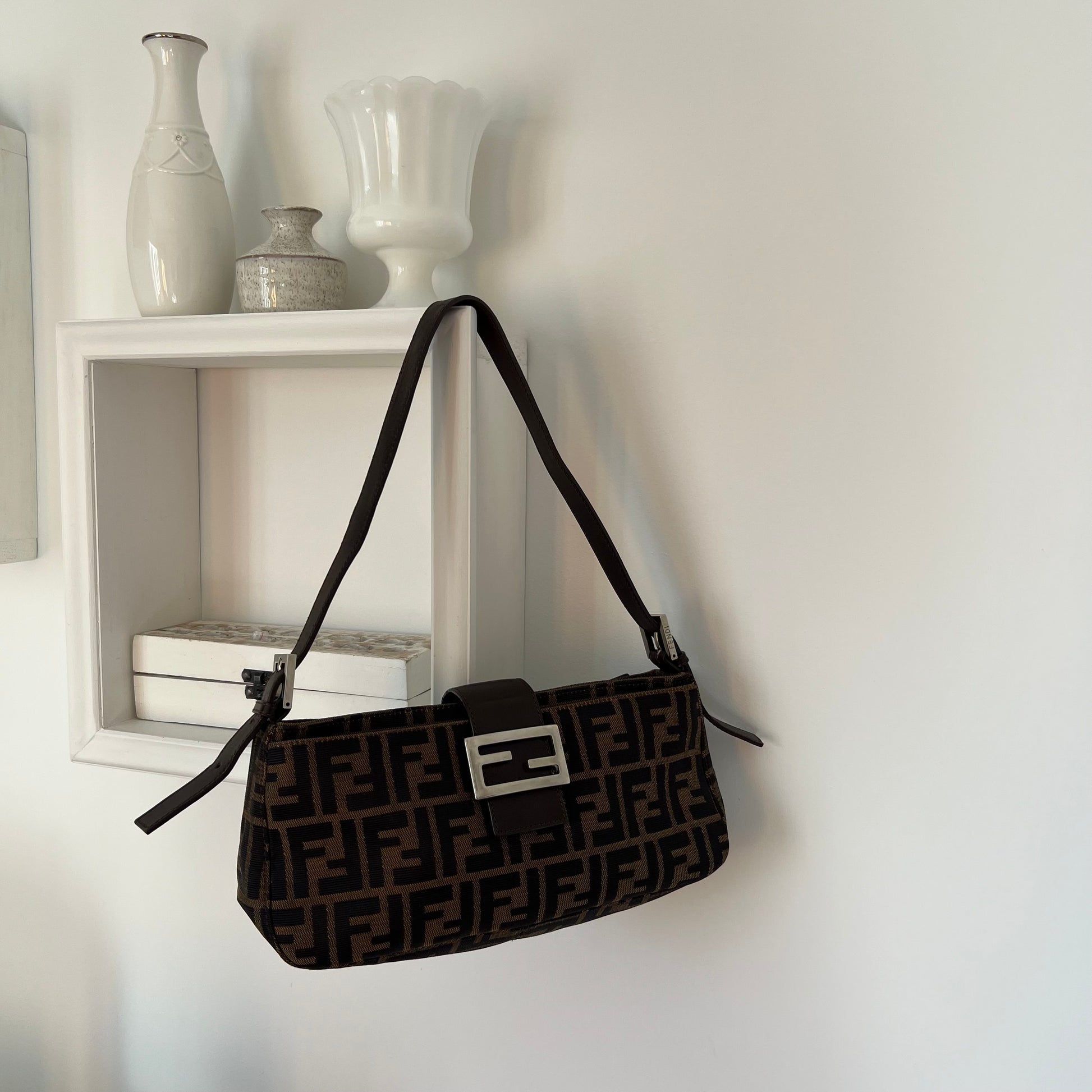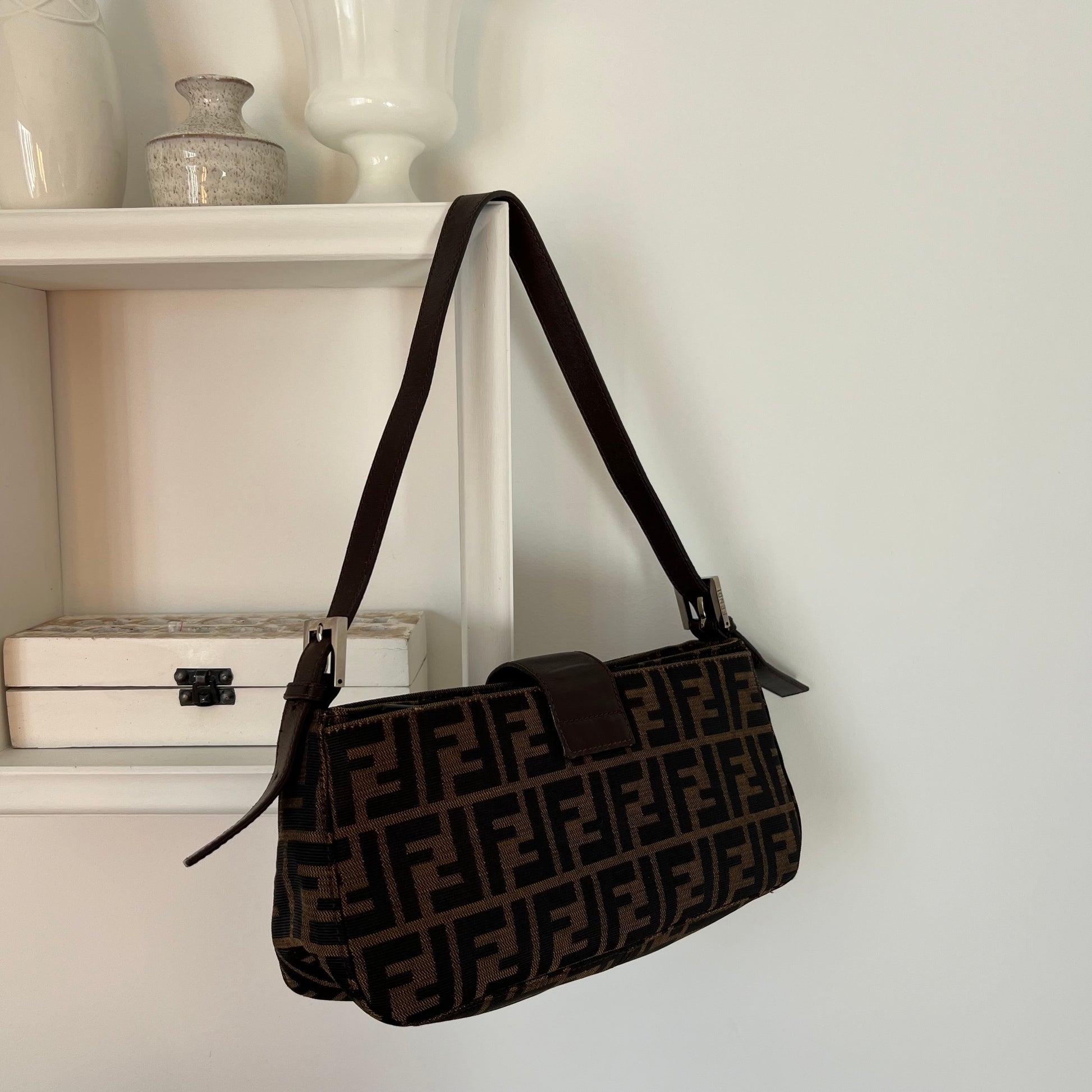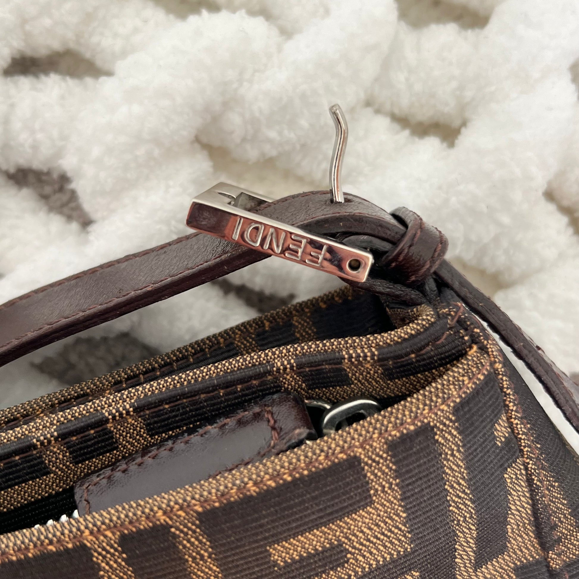 Description: zucca pattern, 3 main pockets (front and back have zipper pockets and middle is opened), logo buckle, silver hardware