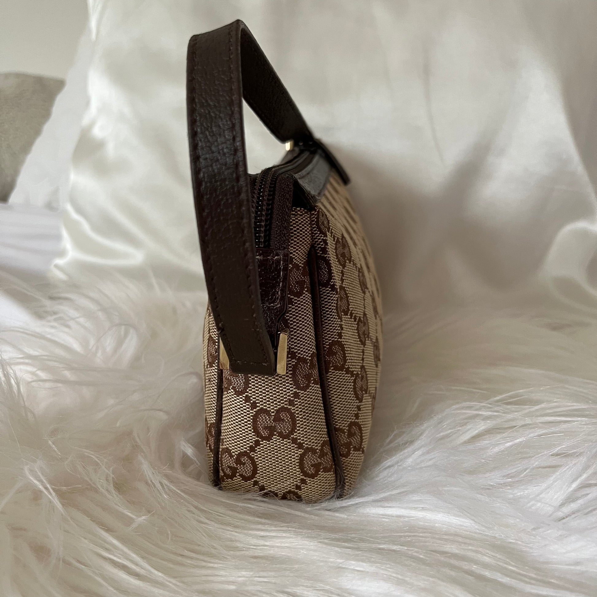 Description: tan/brown double G canvas, brown leather detailing, minor mark on back canvas