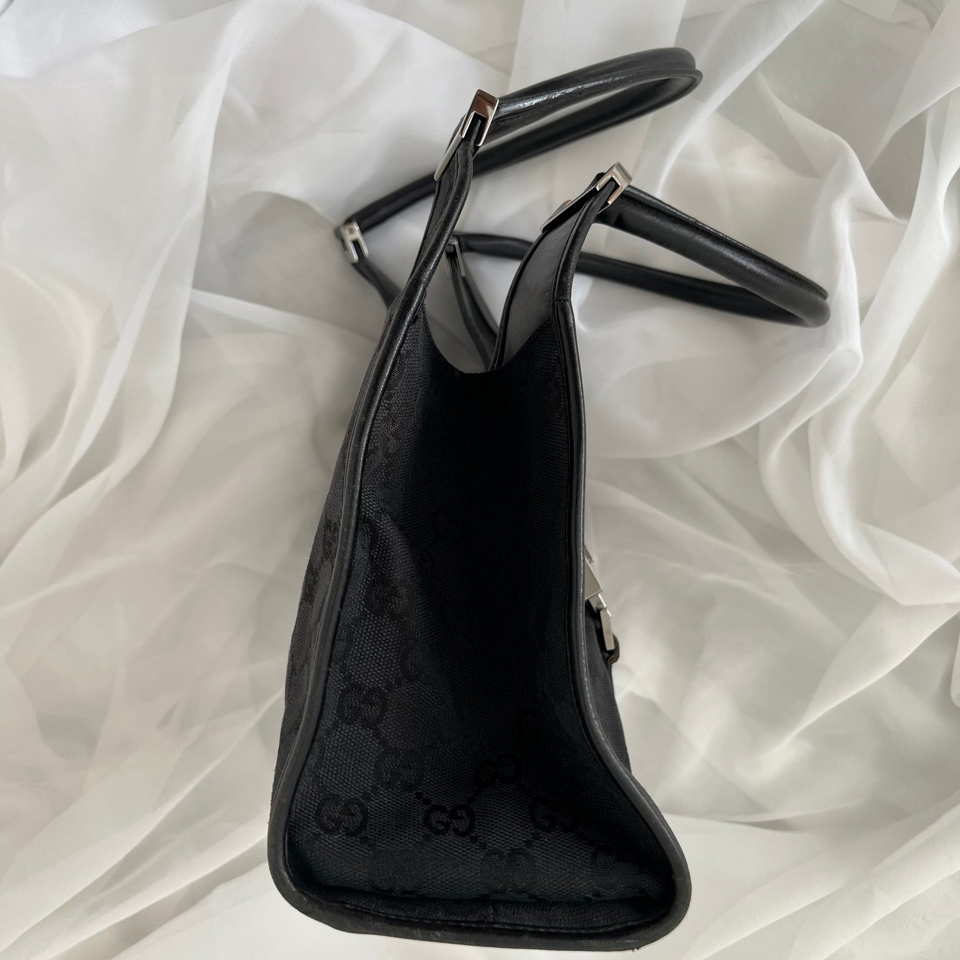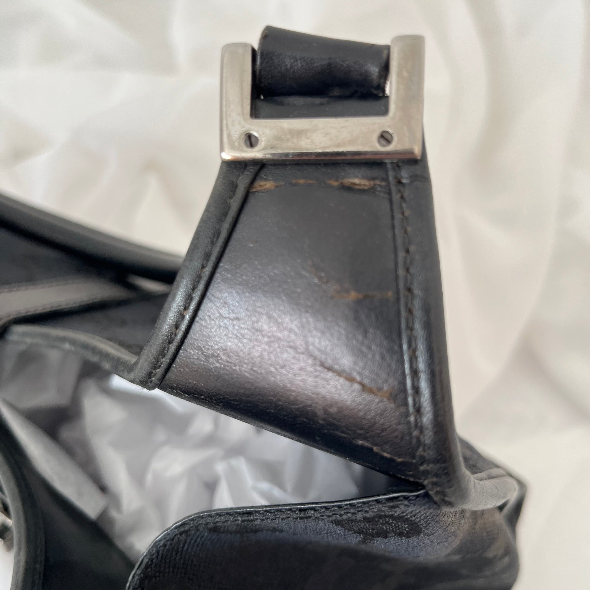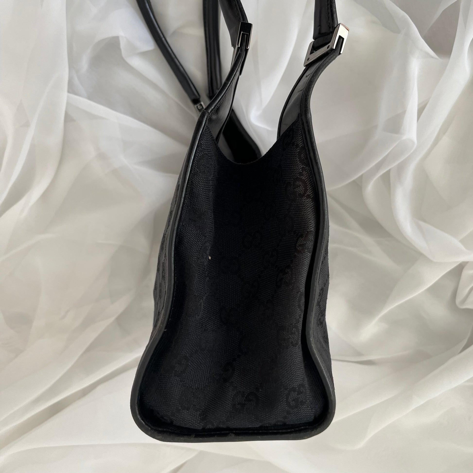 description: black double GG canvas, black leather, silver hardware, shoulder strap, one main pocket, slight fabric fading (shown in photos), leather dryness/cracks (shown in photos)