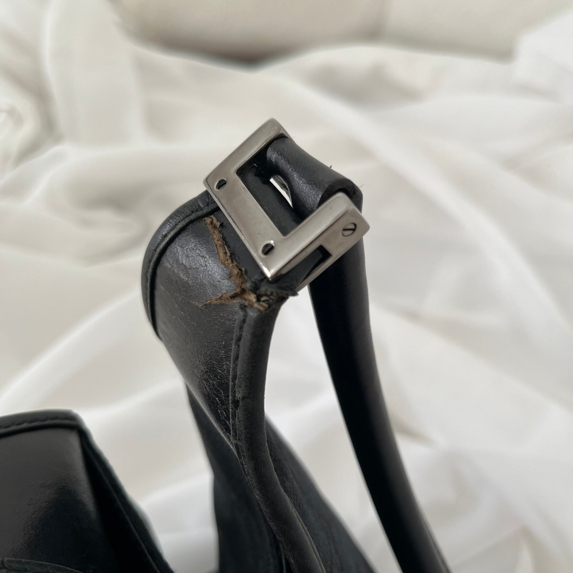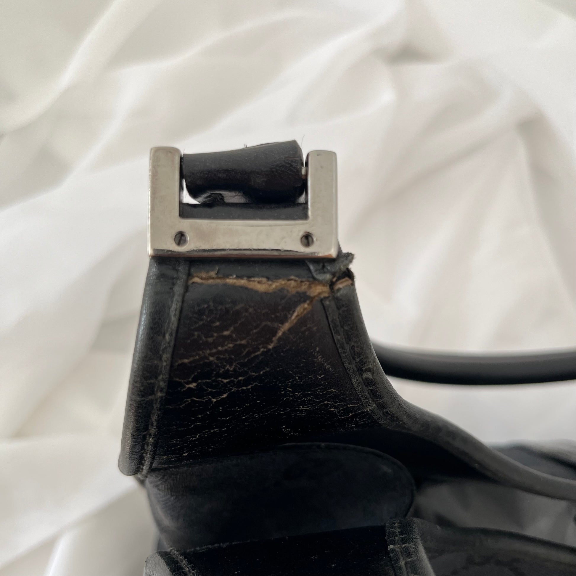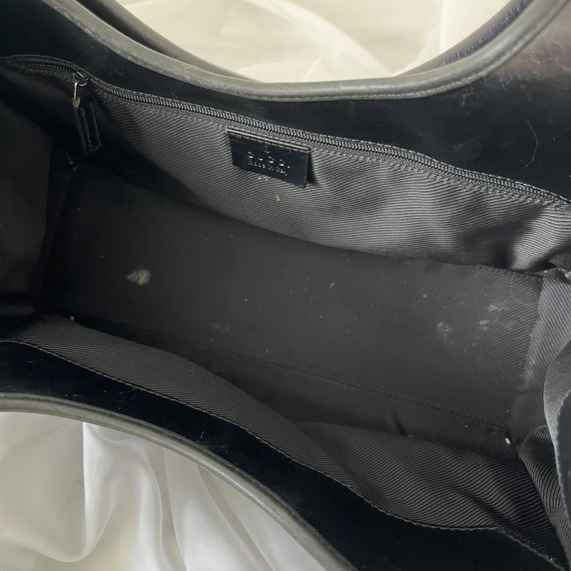 description: black double GG canvas, black leather, silver hardware, shoulder strap, one main pocket, slight fabric fading (shown in photos), leather dryness/cracks (shown in photos)