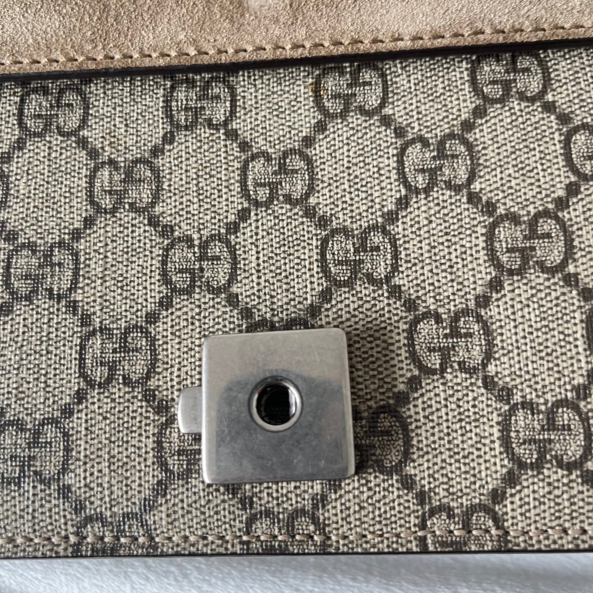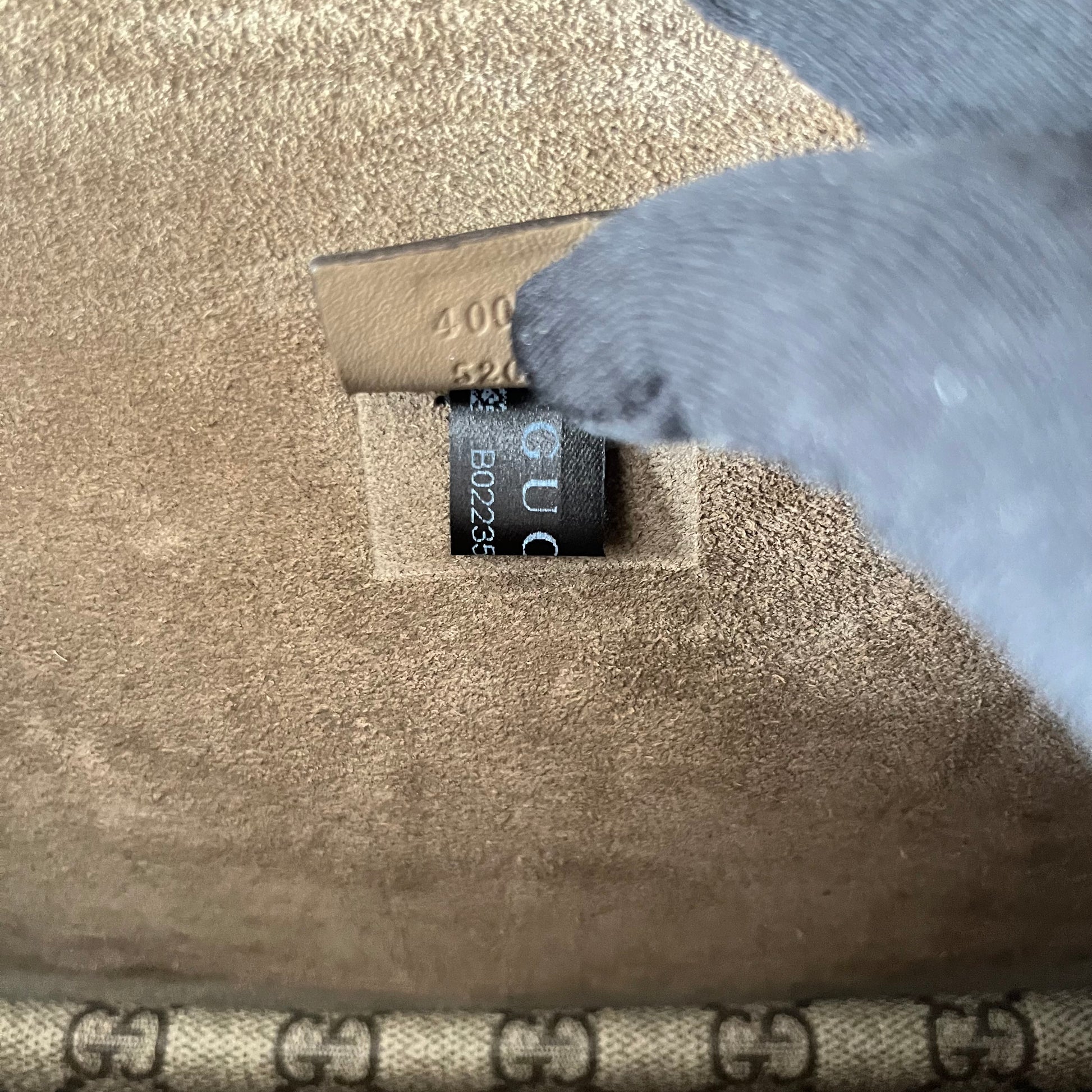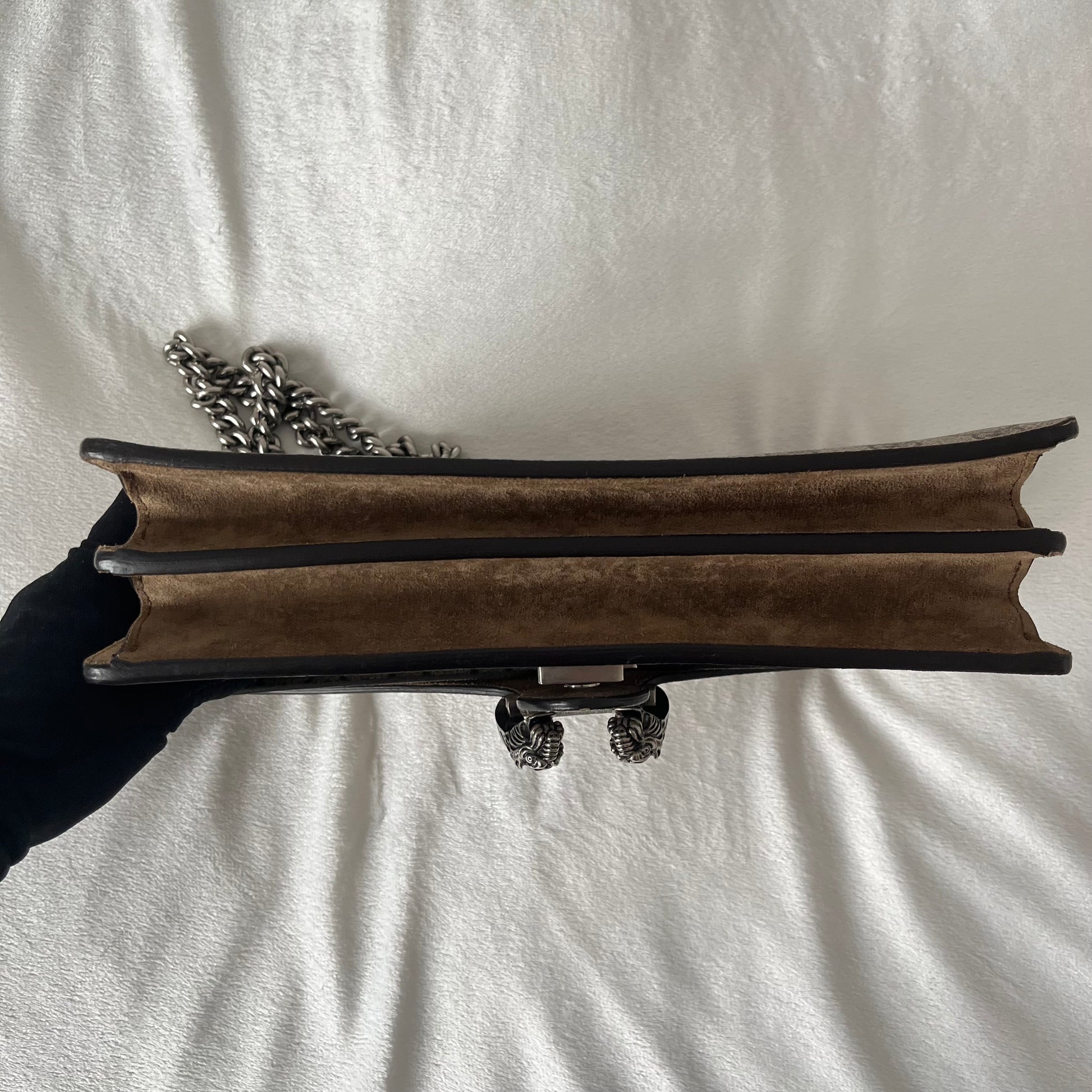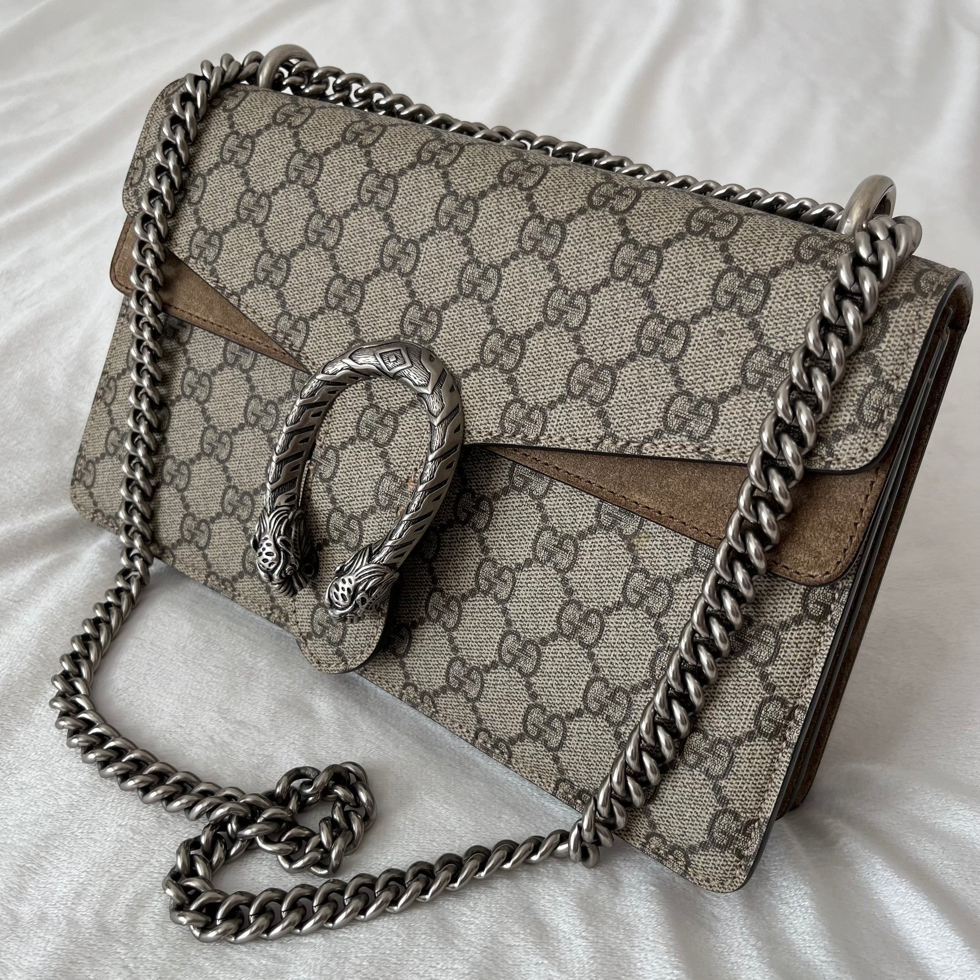 description: signature GG pattern, trimmed with taupe suede details, tiger head closure, sliding chain strap can be worn multiple ways, changing between a shoulder, cross-body + a top handle bag, original dust bag, minor markings on suede interior flap
