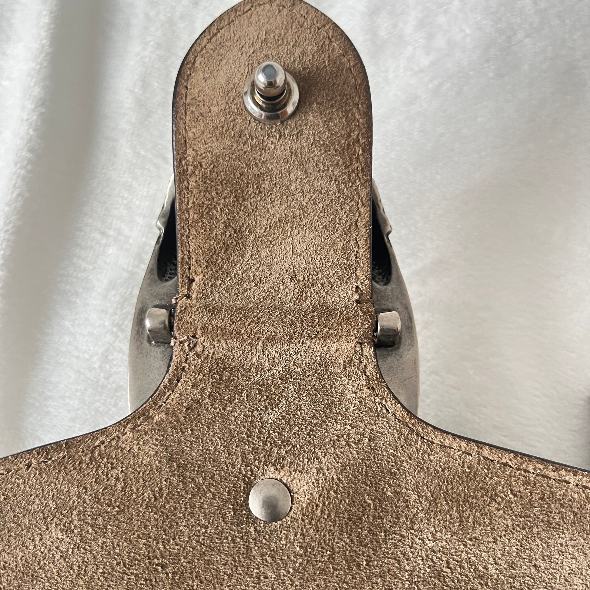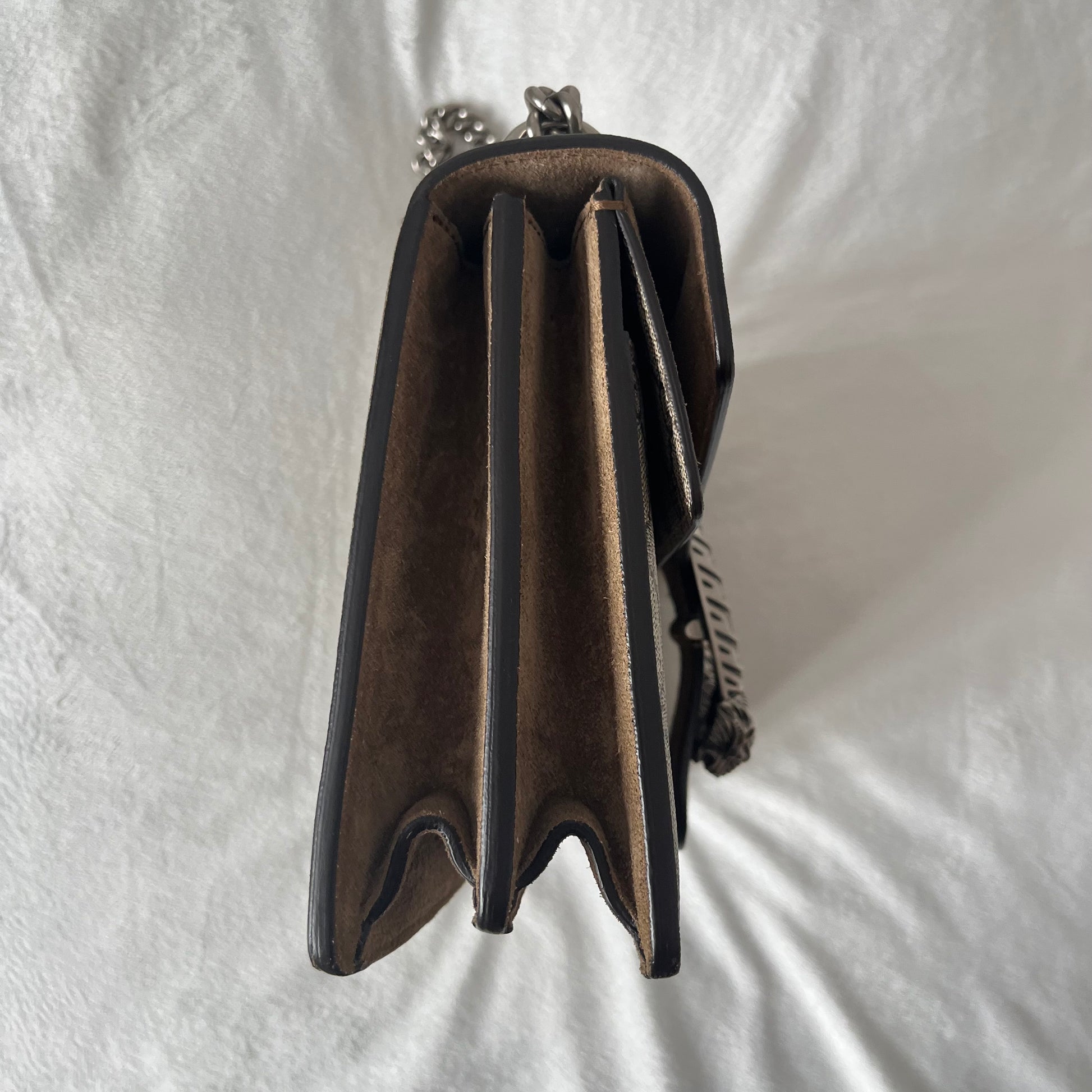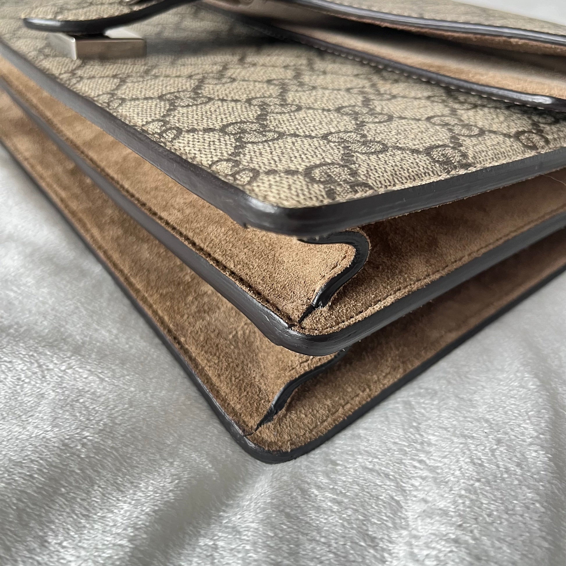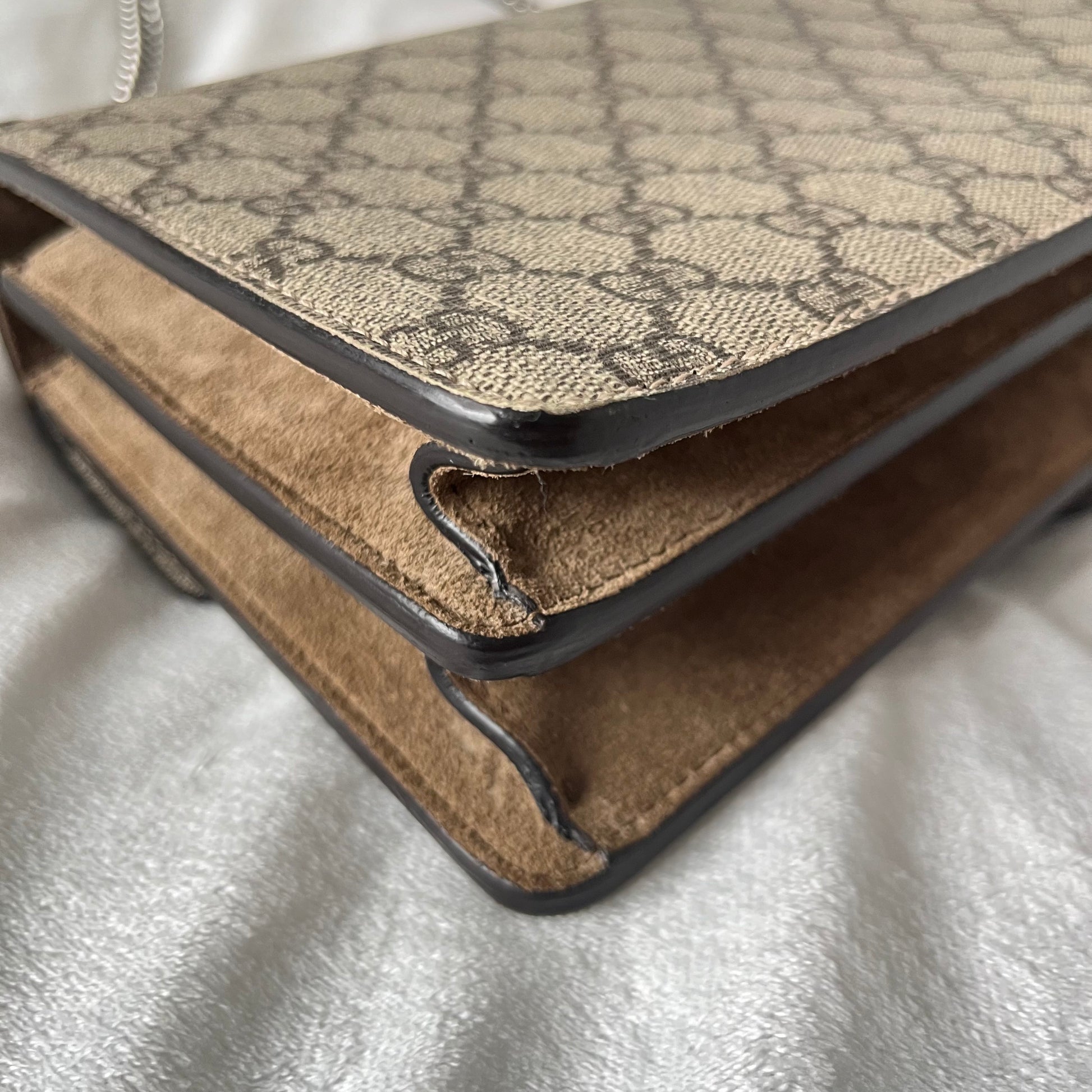 description: signature GG pattern, trimmed with taupe suede details, tiger head closure, sliding chain strap can be worn multiple ways, changing between a shoulder, cross-body + a top handle bag, original dust bag, minor markings on suede interior flap