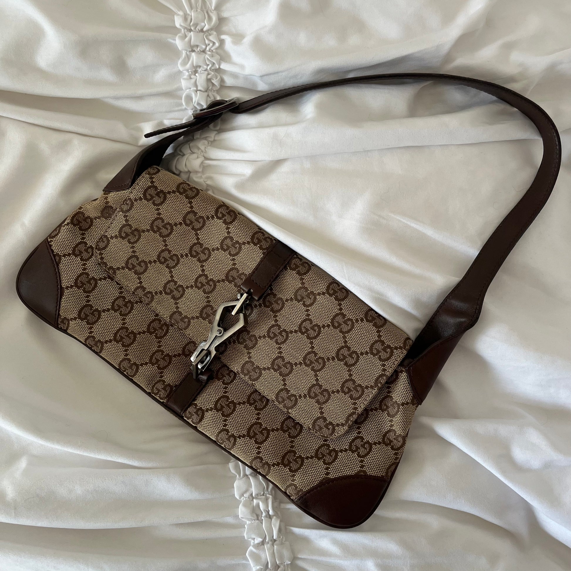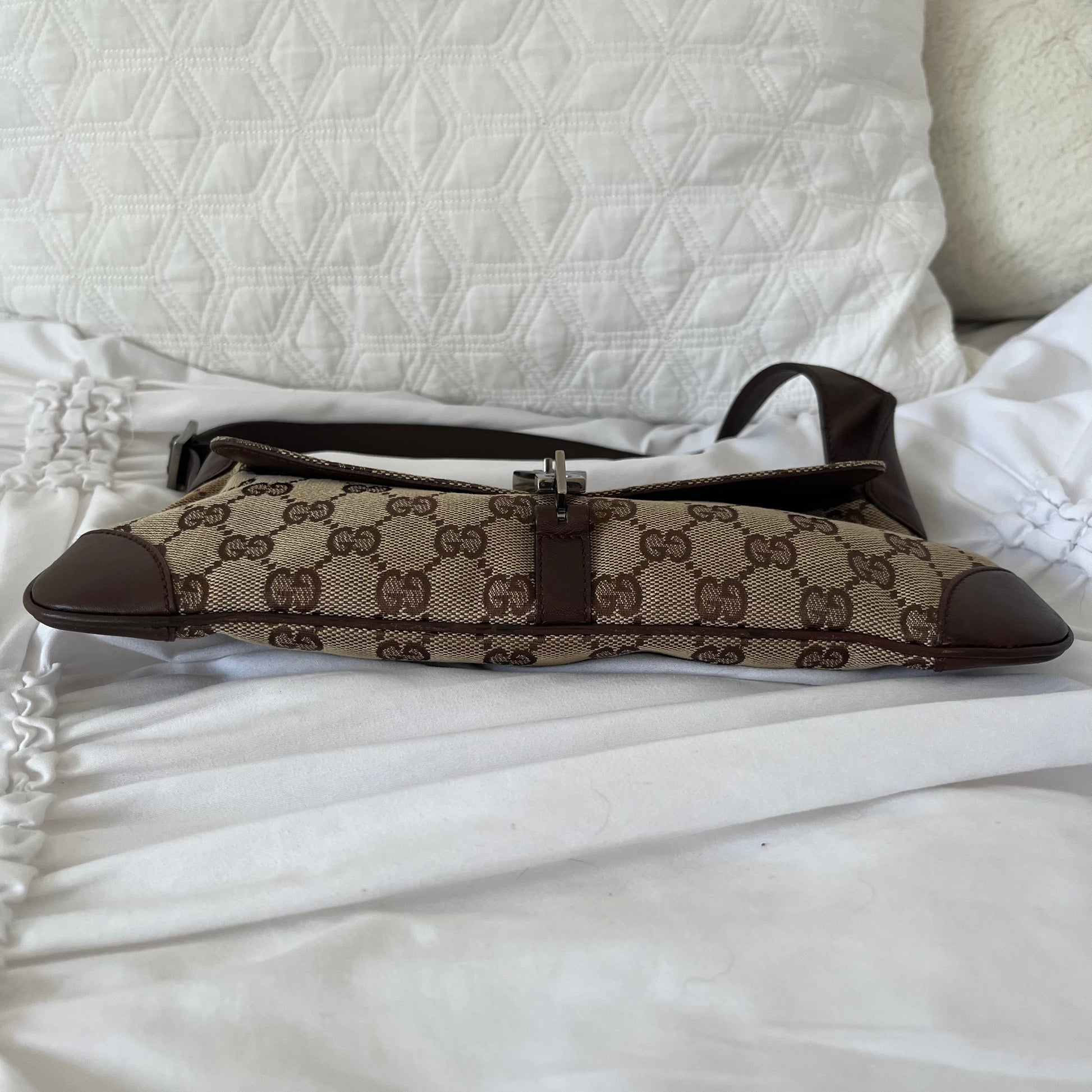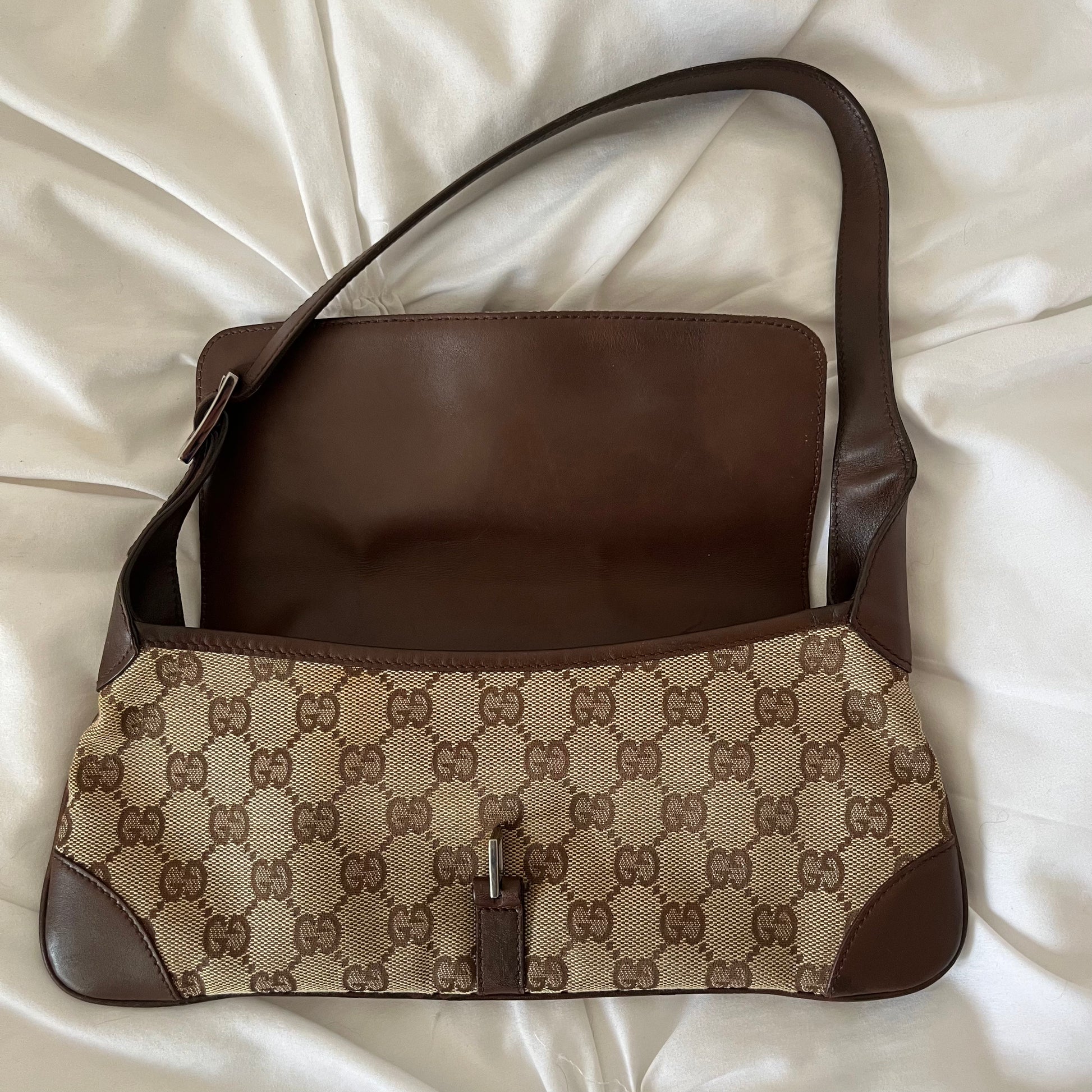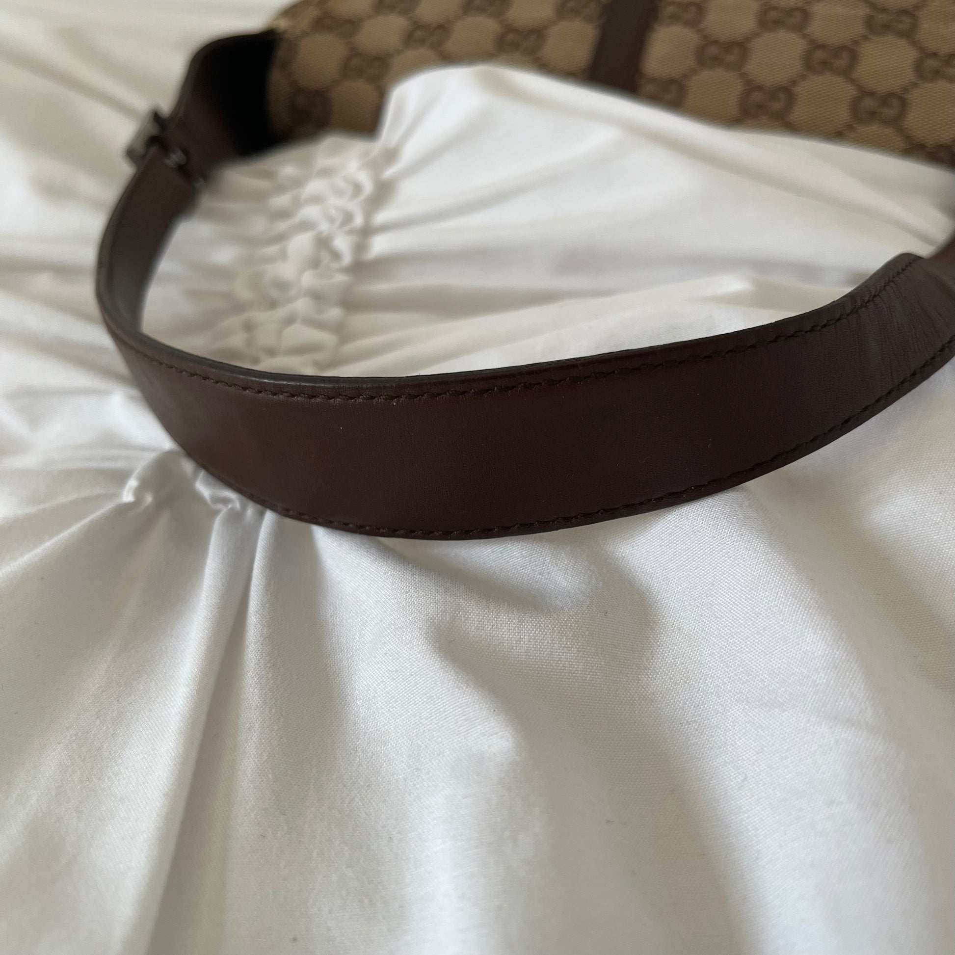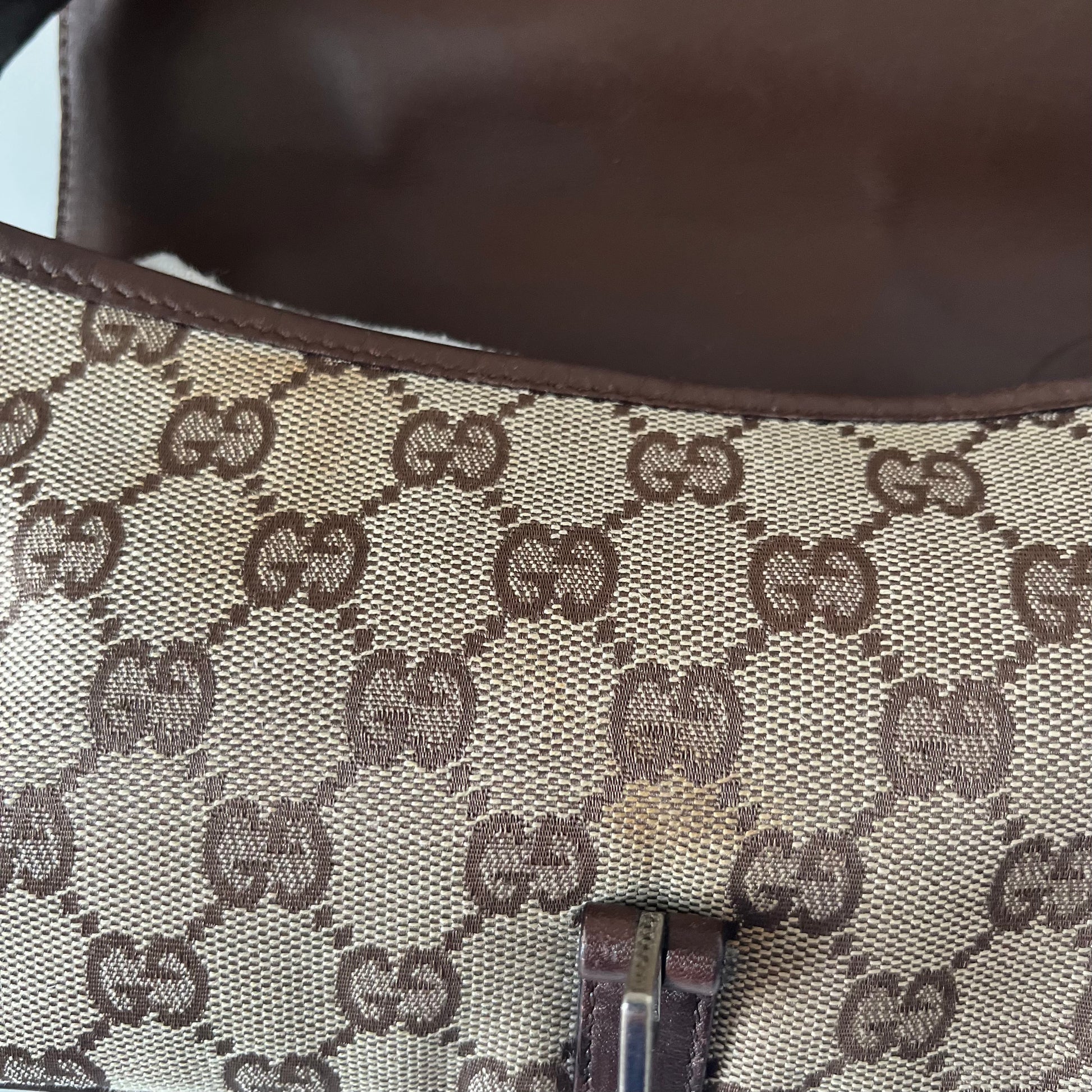 description: double GG canvas, brown leather detailing, 1 main pocket, silver detailing, minor discoloration shown in last 2 images