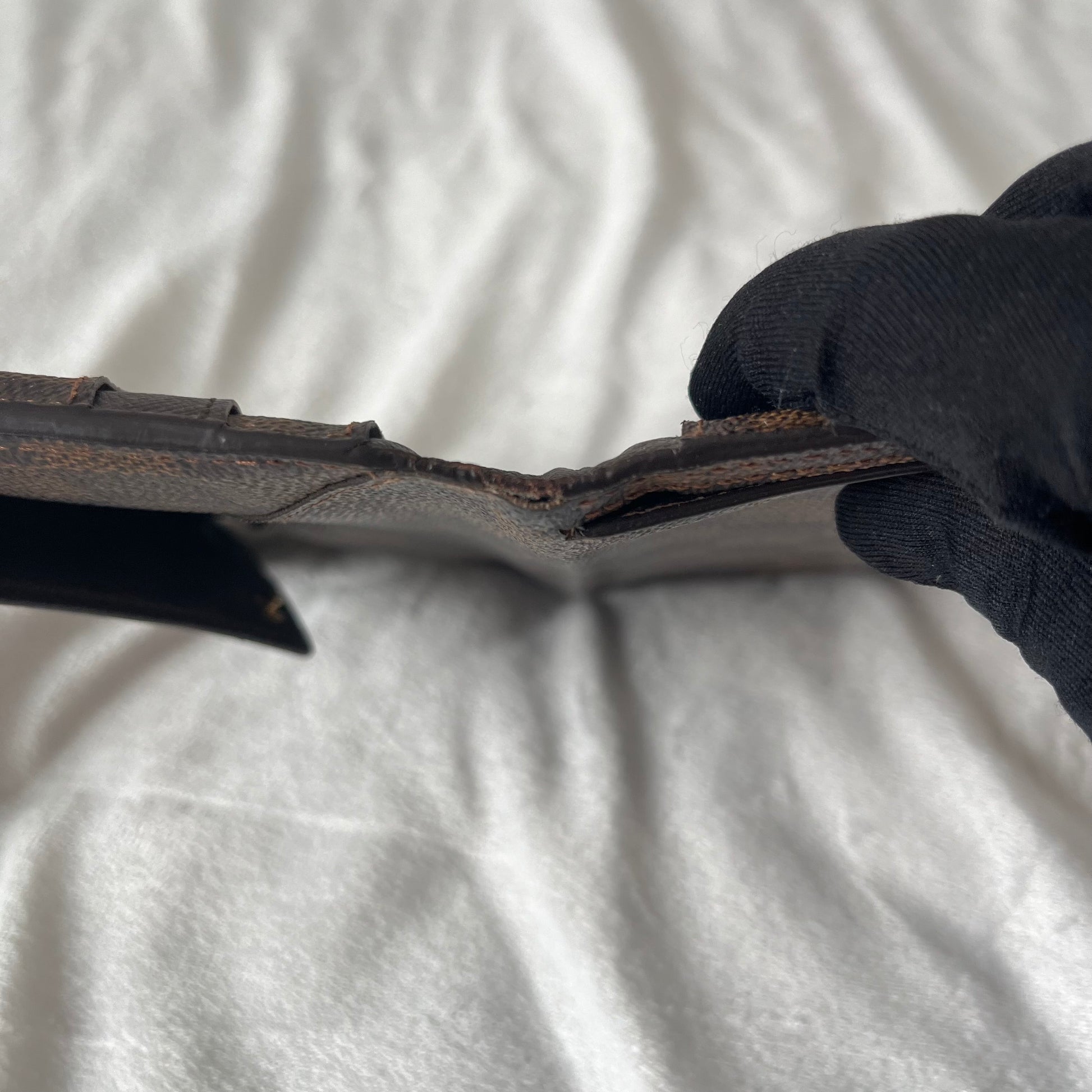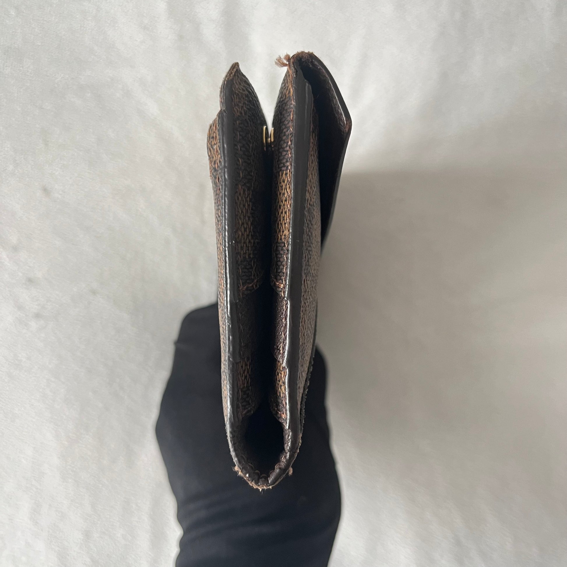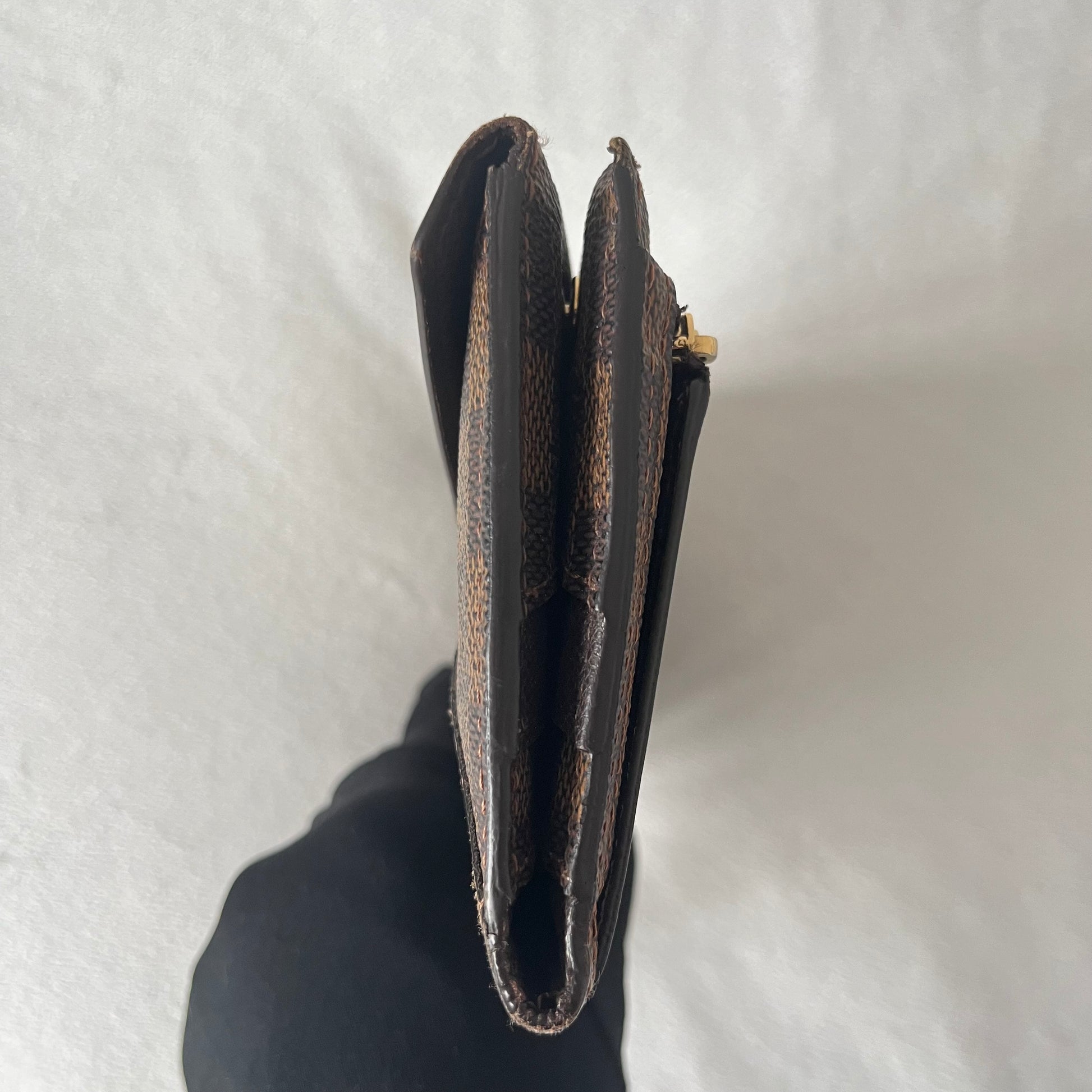 description: Damier ebene canvas, flap unsnaps to a compact cross-grain leather interior with pockets + diagonal set credit card slots, reverse of the wallet has a brass zipper pocket for coins, original dust bag included, slight cracking on leather piping on corners of wallet