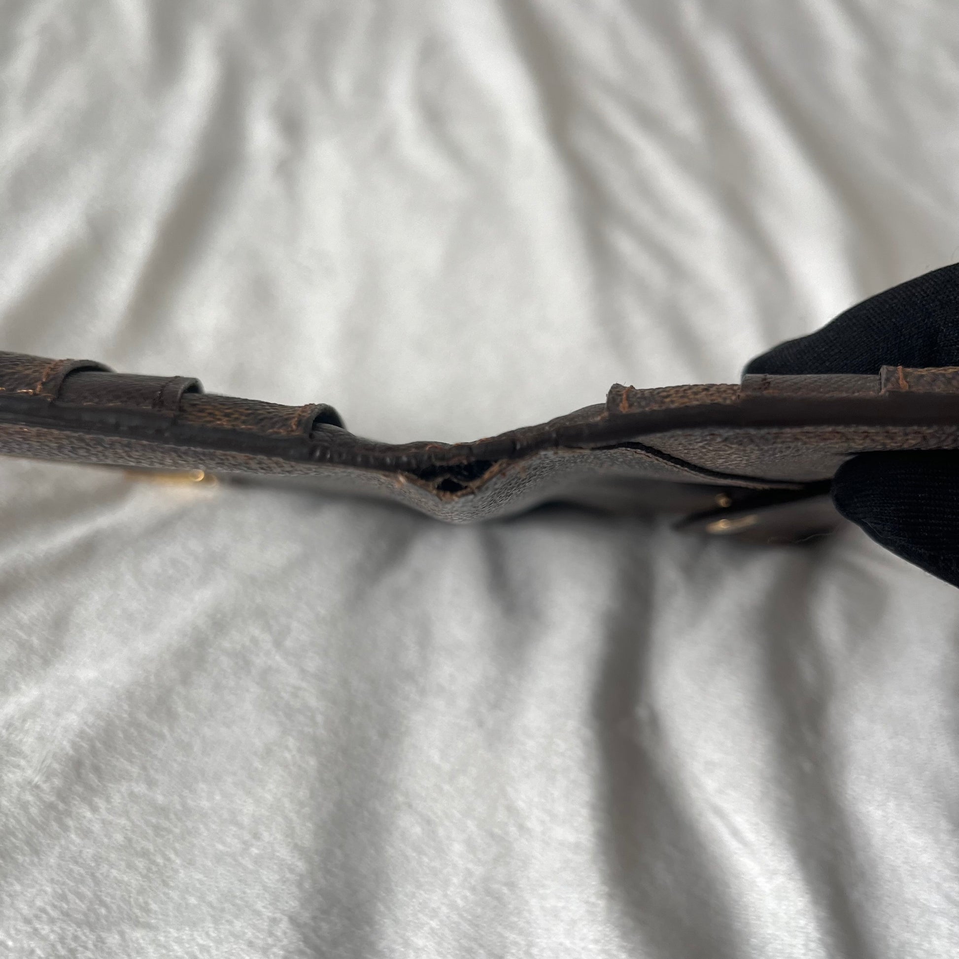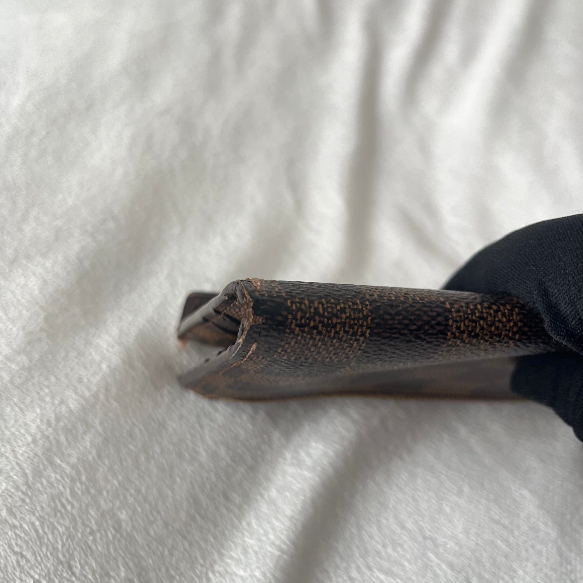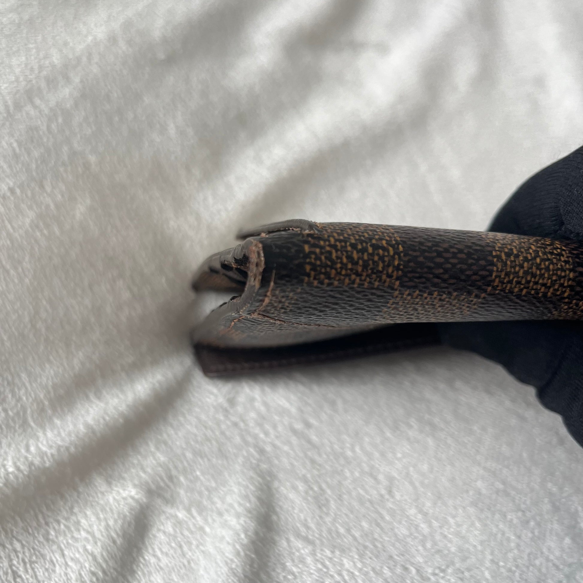 description: Damier ebene canvas, flap unsnaps to a compact cross-grain leather interior with pockets + diagonal set credit card slots, reverse of the wallet has a brass zipper pocket for coins, original dust bag included, slight cracking on leather piping on corners of wallet