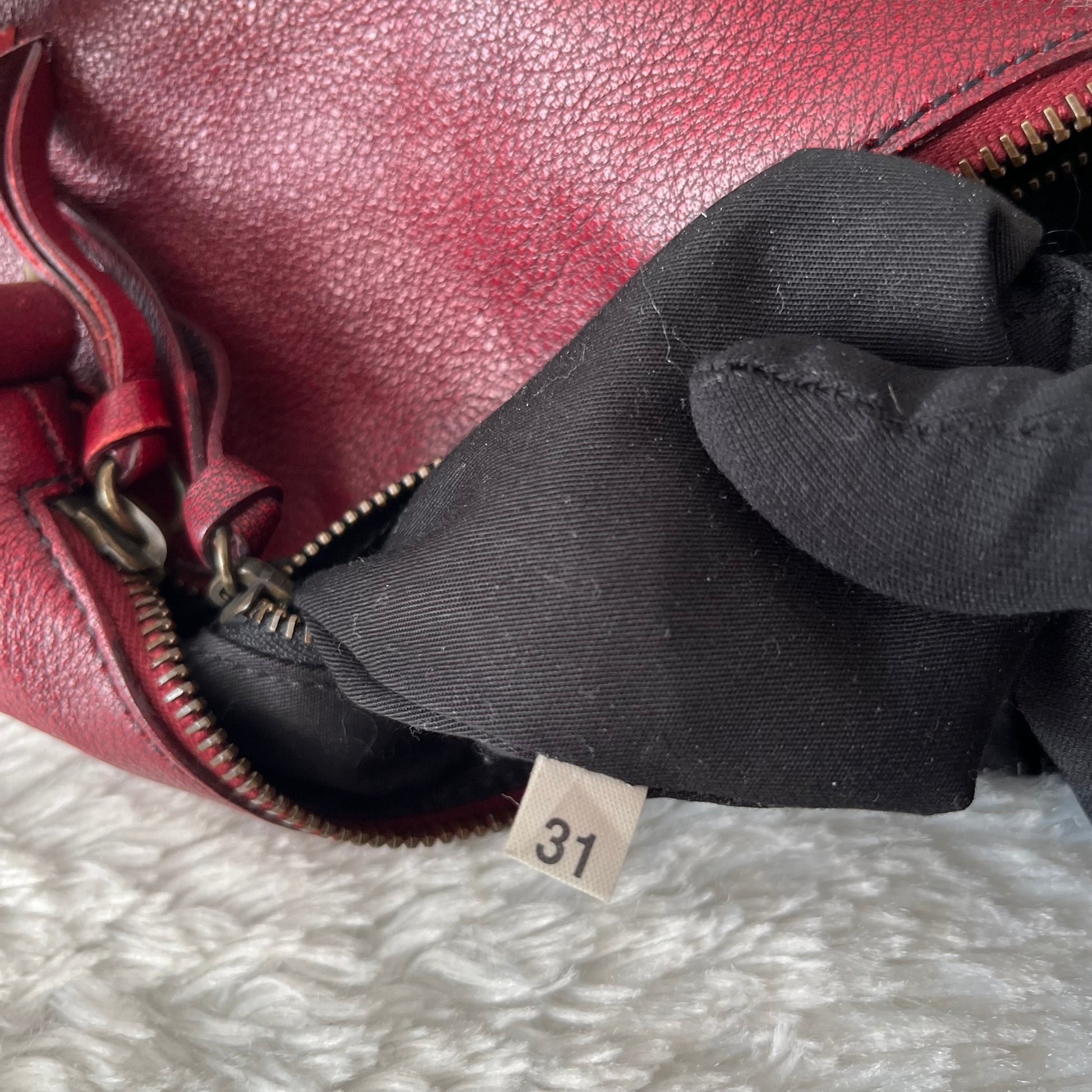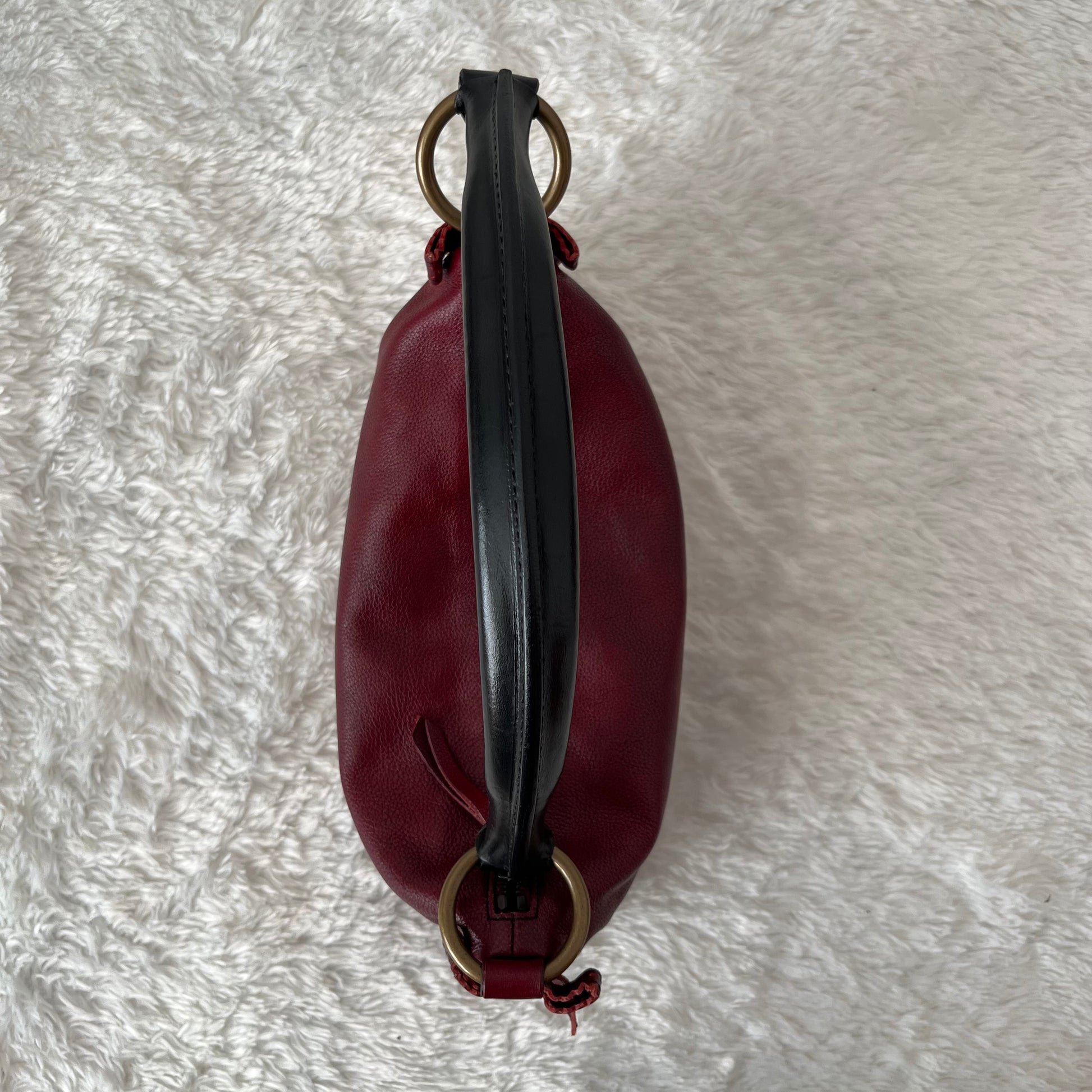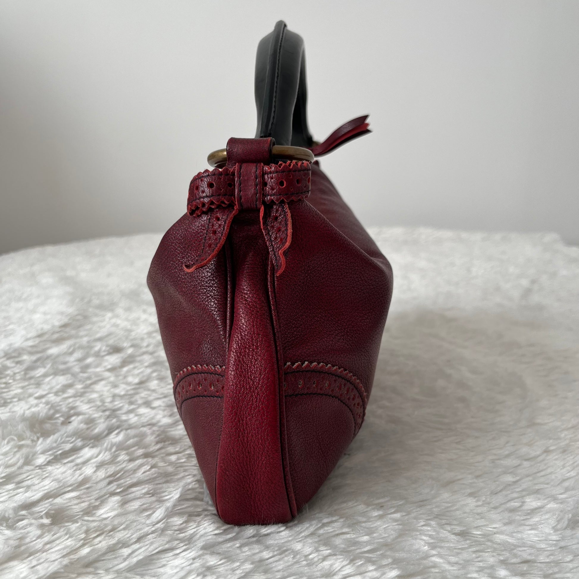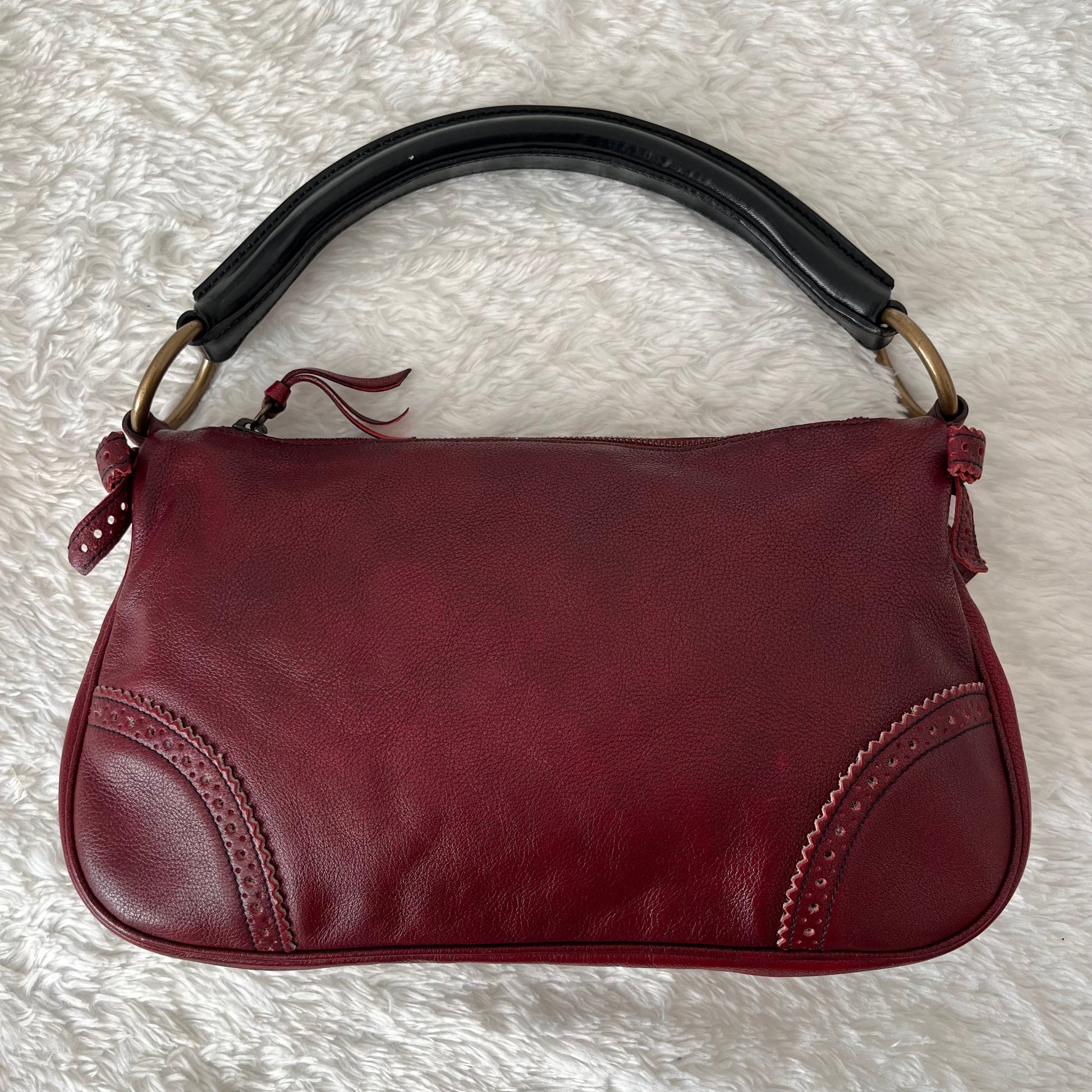 description: red leather, gold plated hardware, black leather, one main zipper pocket, one interior pocket, leather box detailing on side of bag