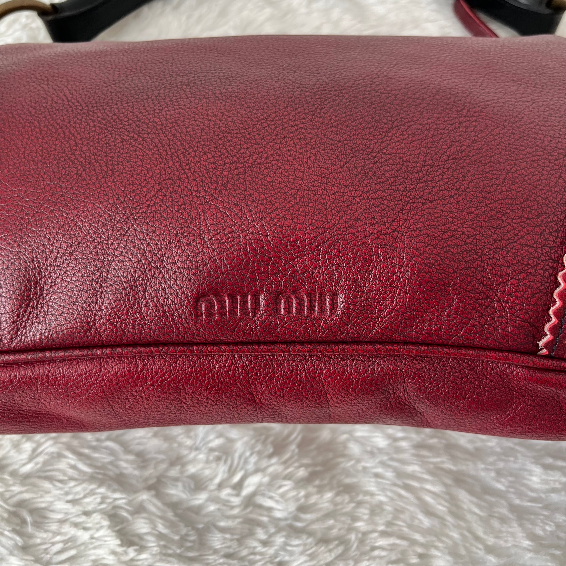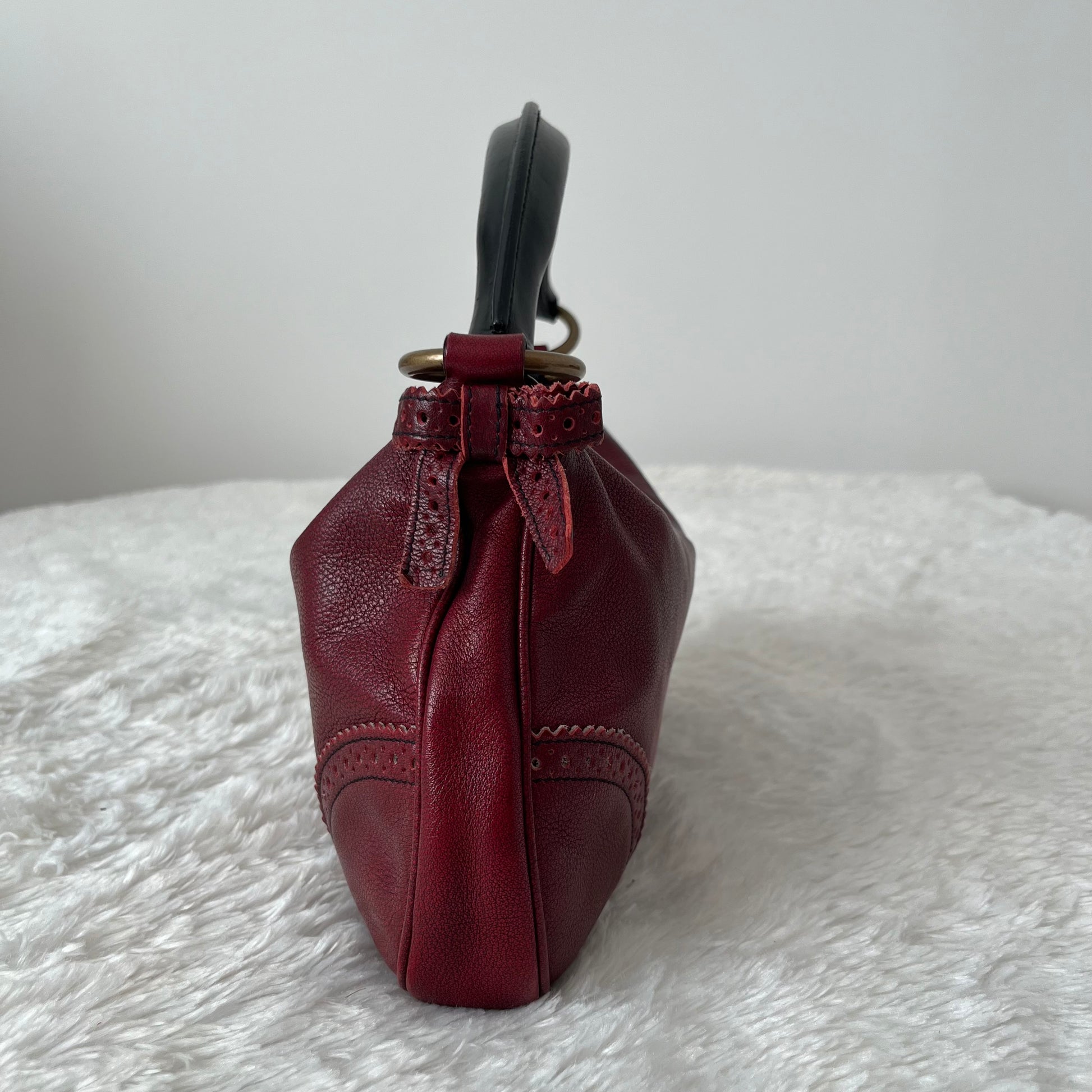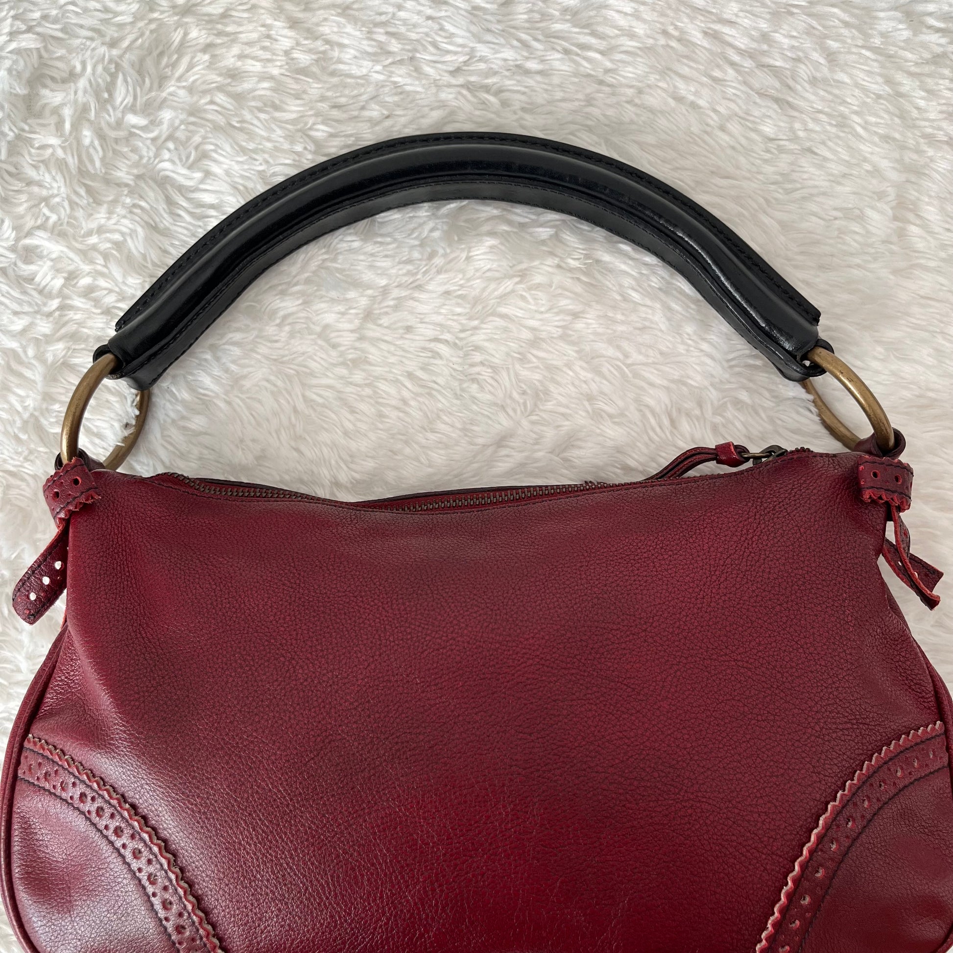 description: red leather, gold plated hardware, black leather, one main zipper pocket, one interior pocket, leather box detailing on side of bag