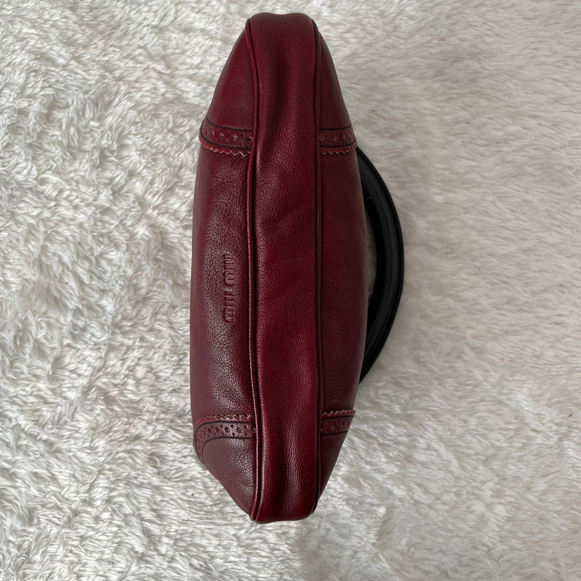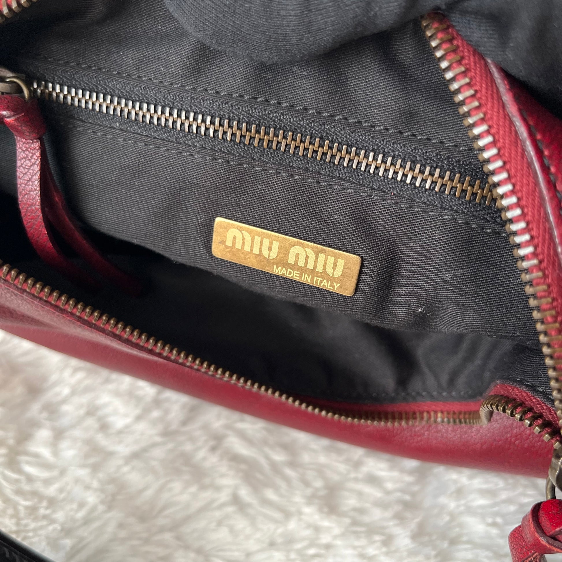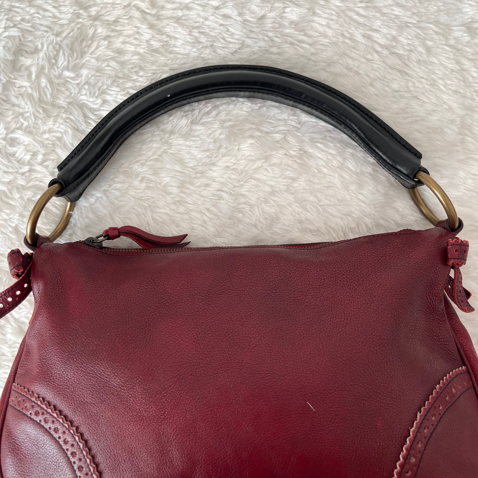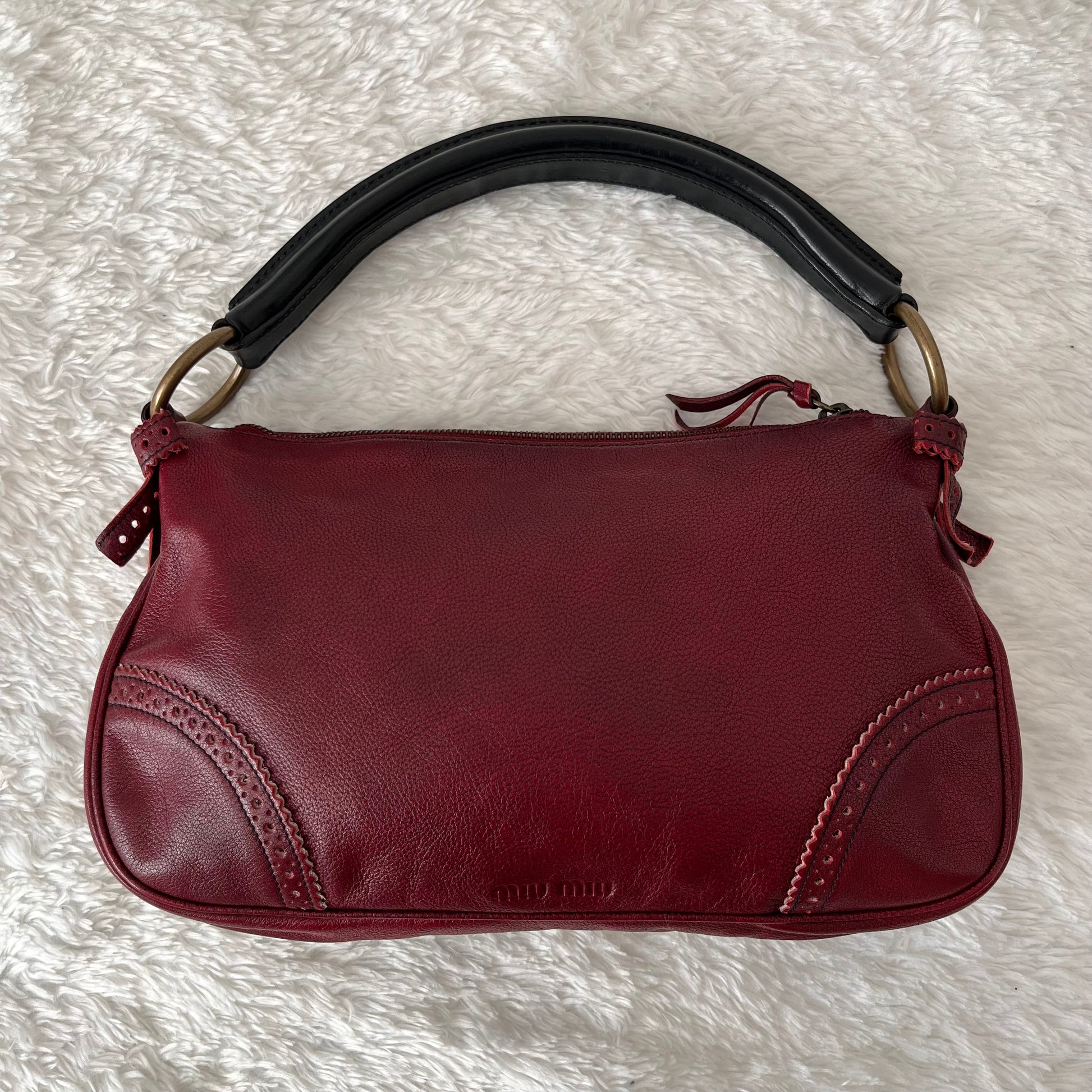 description: red leather, gold plated hardware, black leather, one main zipper pocket, one interior pocket, leather box detailing on side of bag