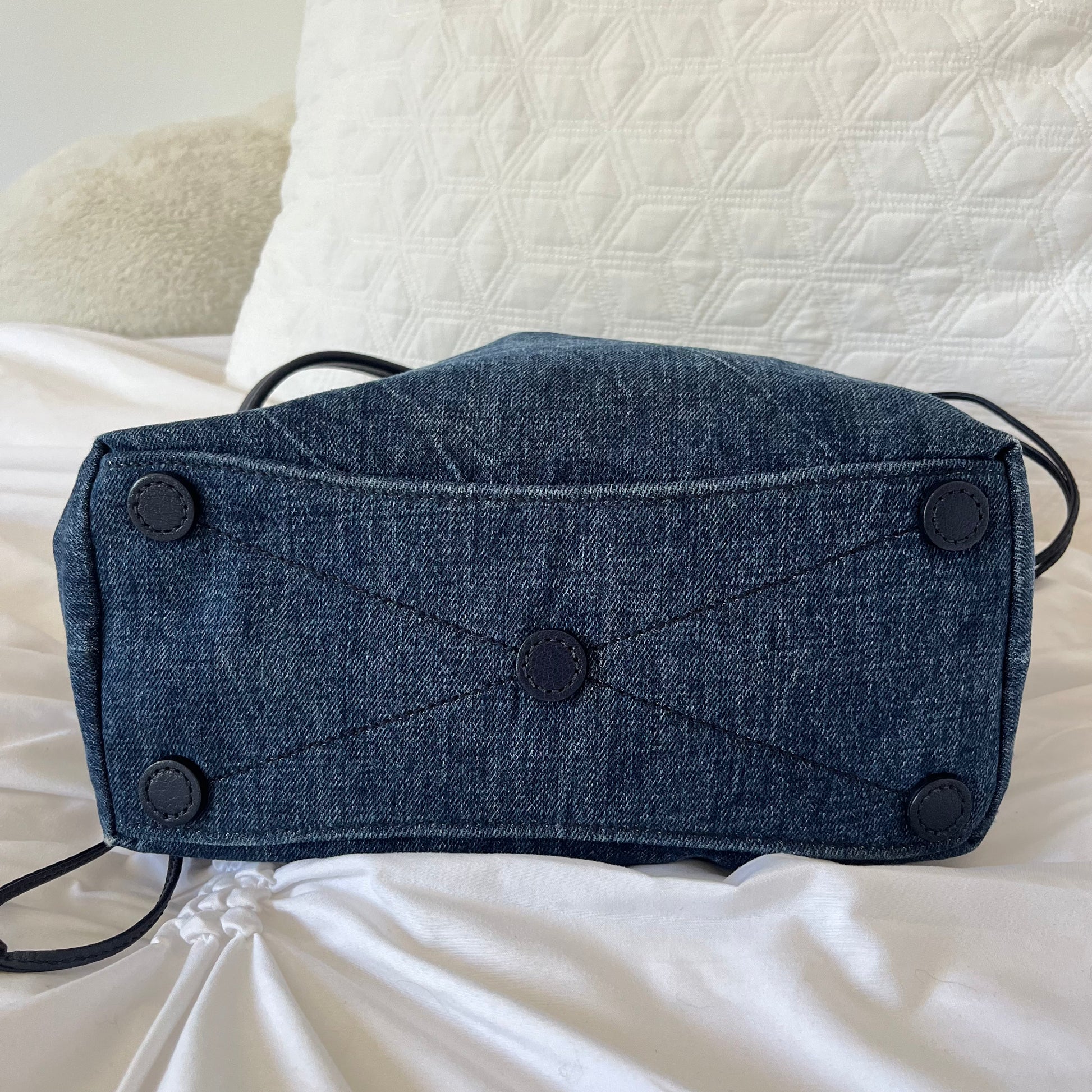 description: blue leather, blue denim, gold hardware, drawstring closure