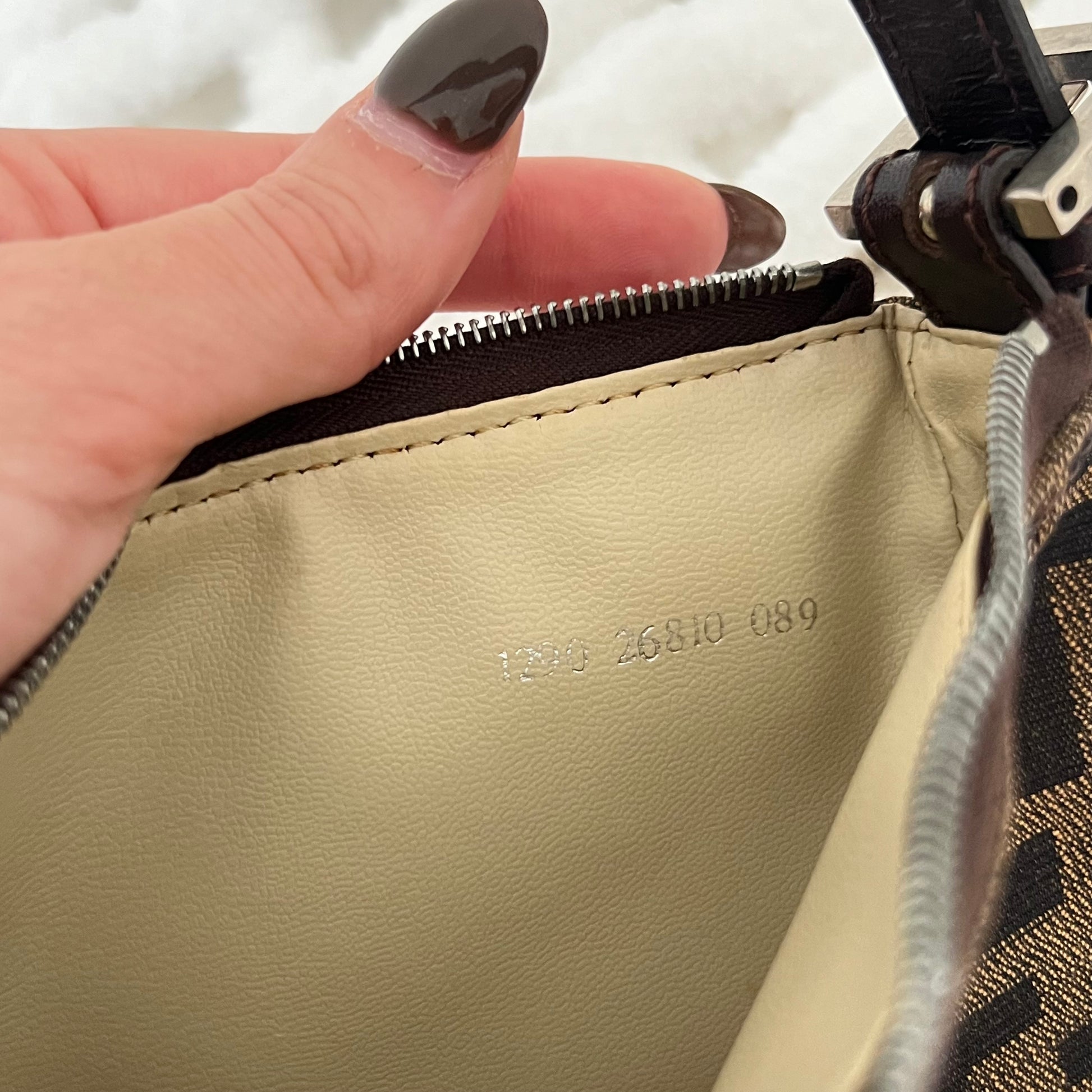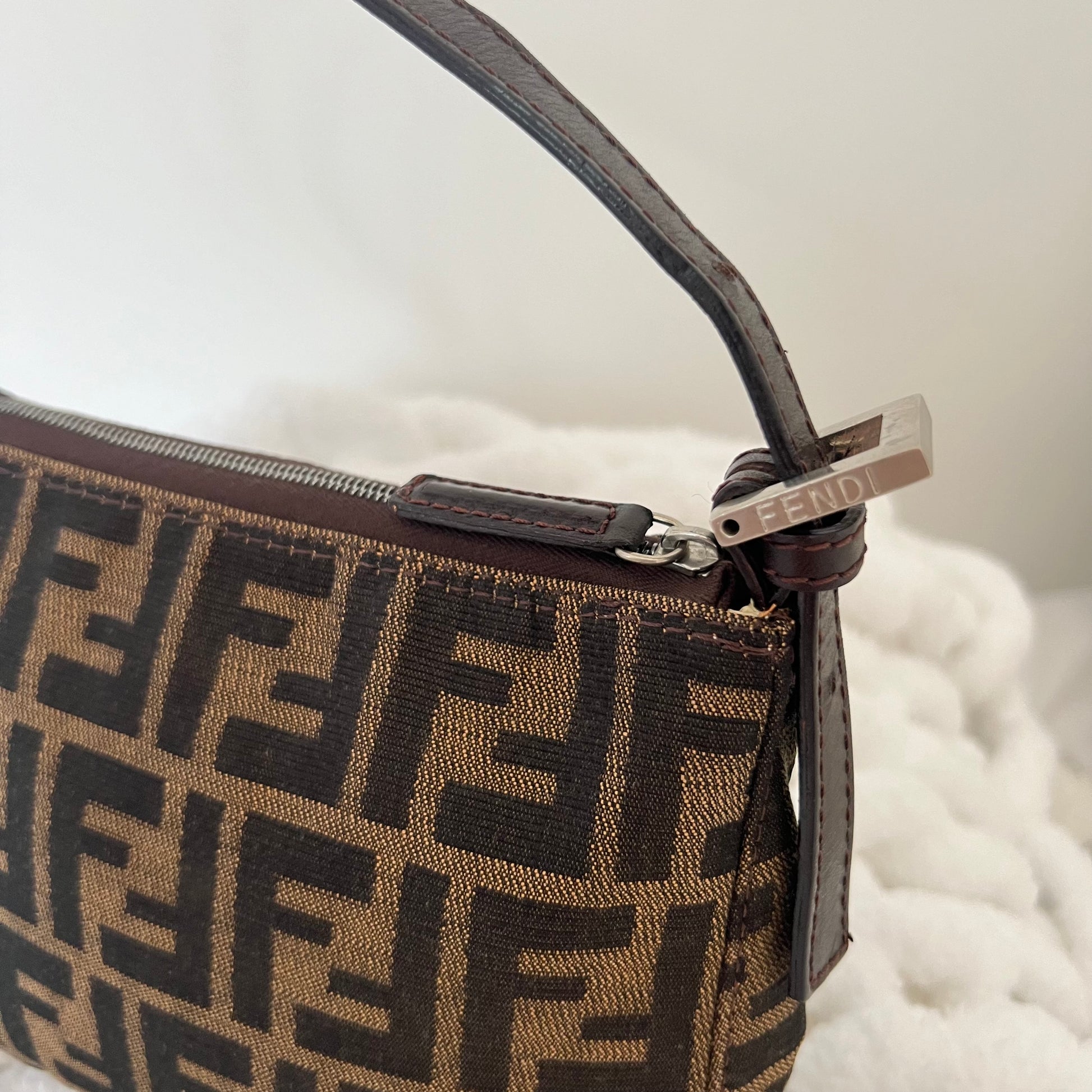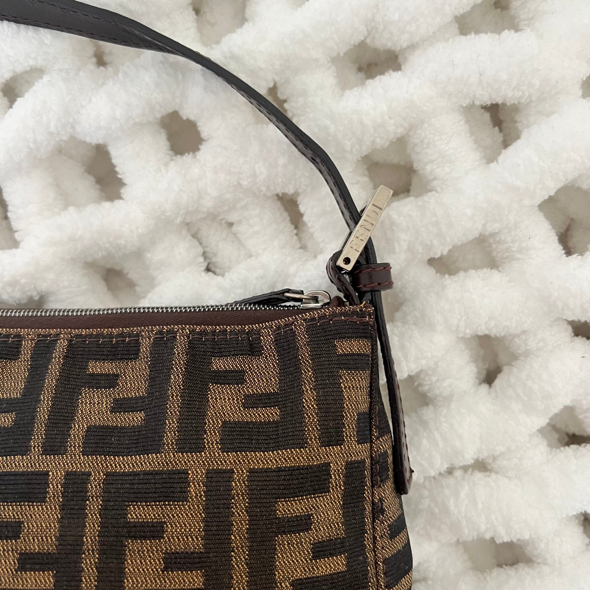 description: zucca pattern, brown leather, sits nicely on the shoulder, one main zipper pocket